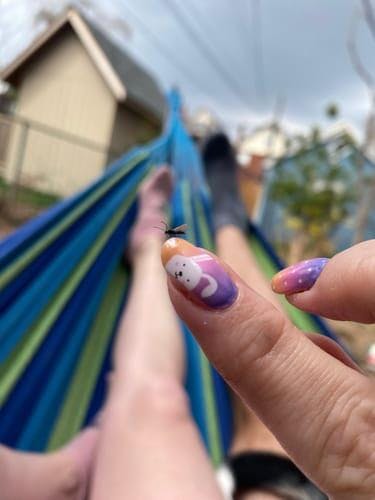 Did this design over my biogel which we’re growing out, for Easter. Didn’t put a top coat, and despite my holiday cooking and cleaning, they lasted a good 2 weeks without chipping or discolouring.