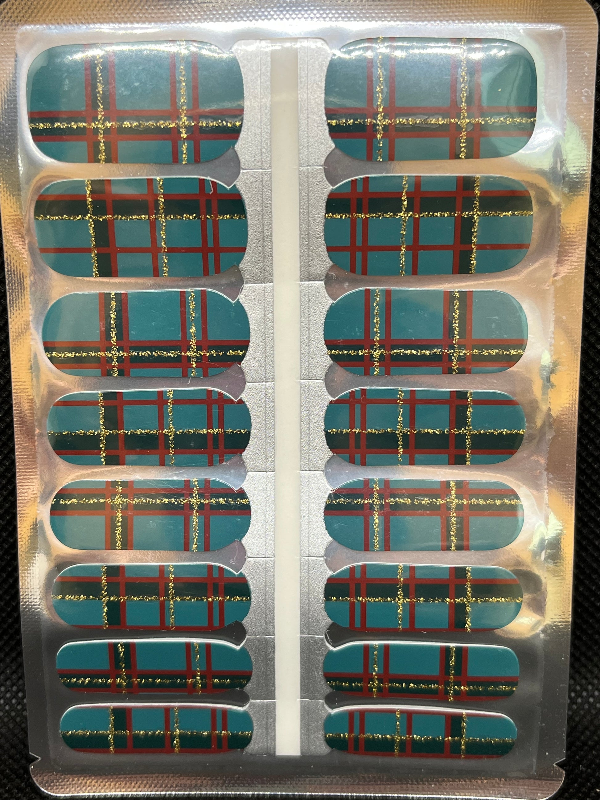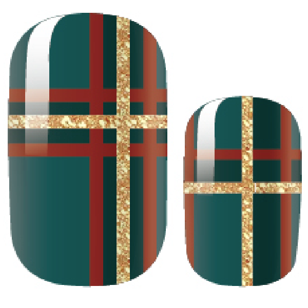 > Get your Tartan On! with this fun design. Intersecting lines of red, dark green and gold sparkly glitter on a lighter green background create a festive and fun tartan for your nails.