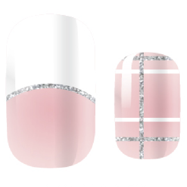 >Semi-translucent pale pink combined with white French tips and white & silver window pane check + silver metallic glitter accents