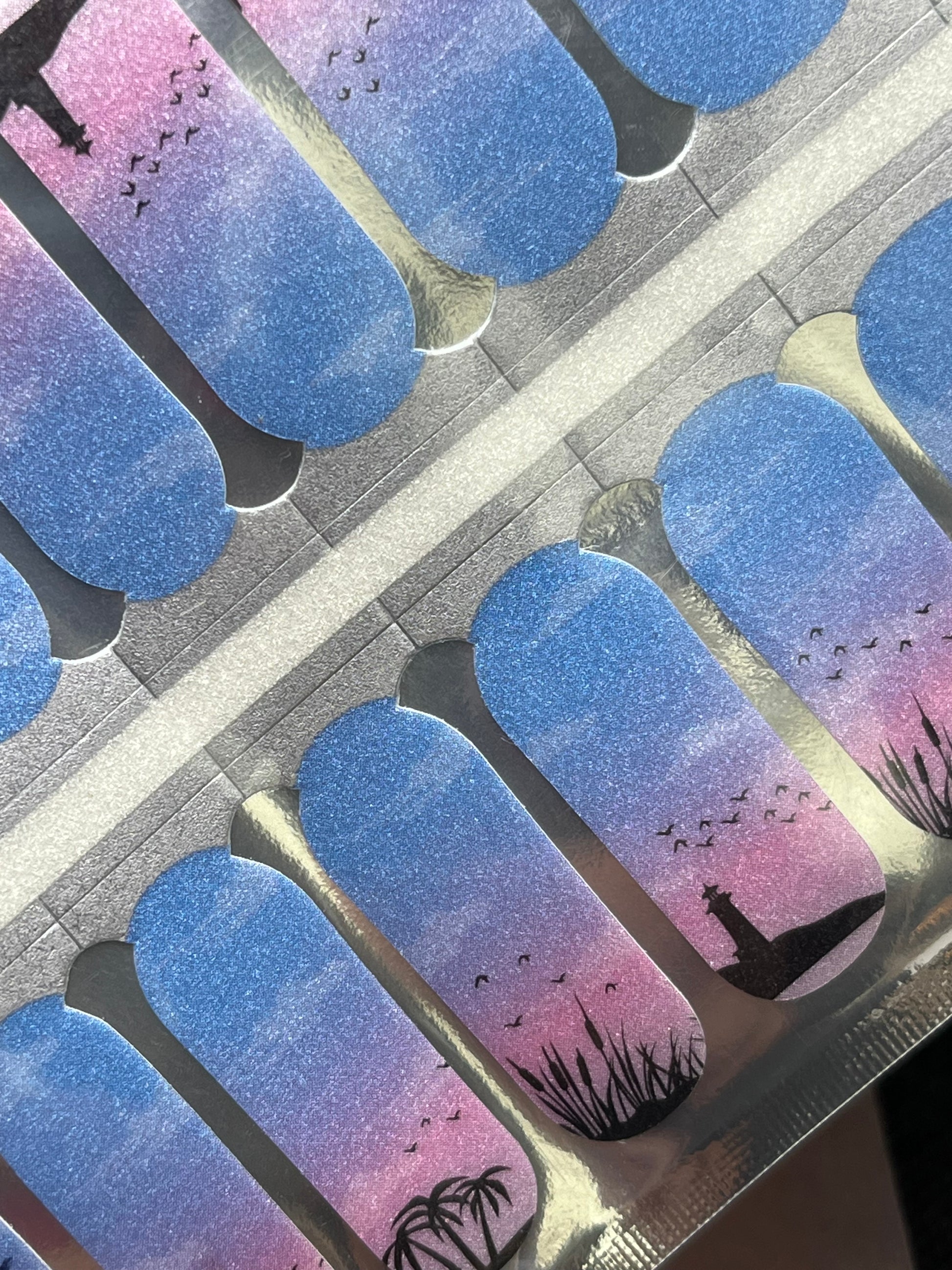 Pale pink to lavender to blue skies over silhouettes of holiday locales.  Palm trees, lighthouses & pine trees.