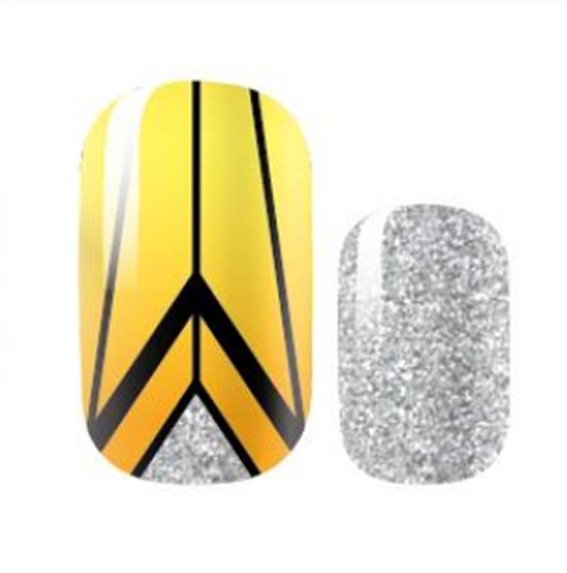 >Bold, fun design, mix of yellow, orange & silver solids + geometric accent nail