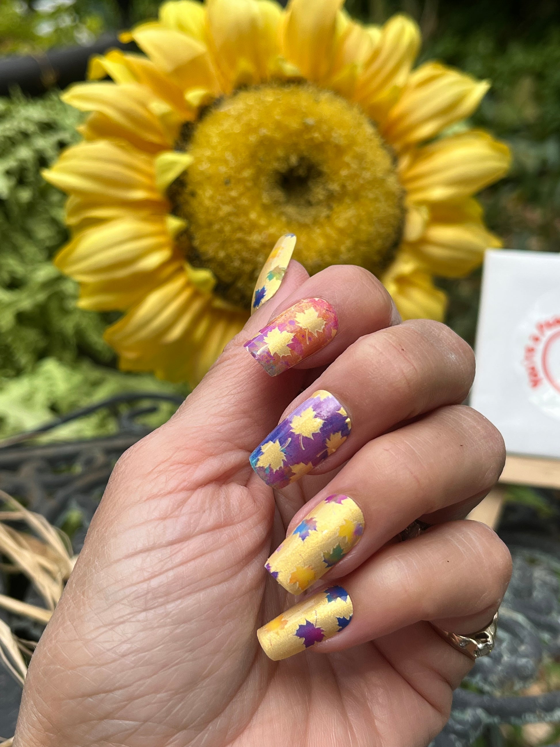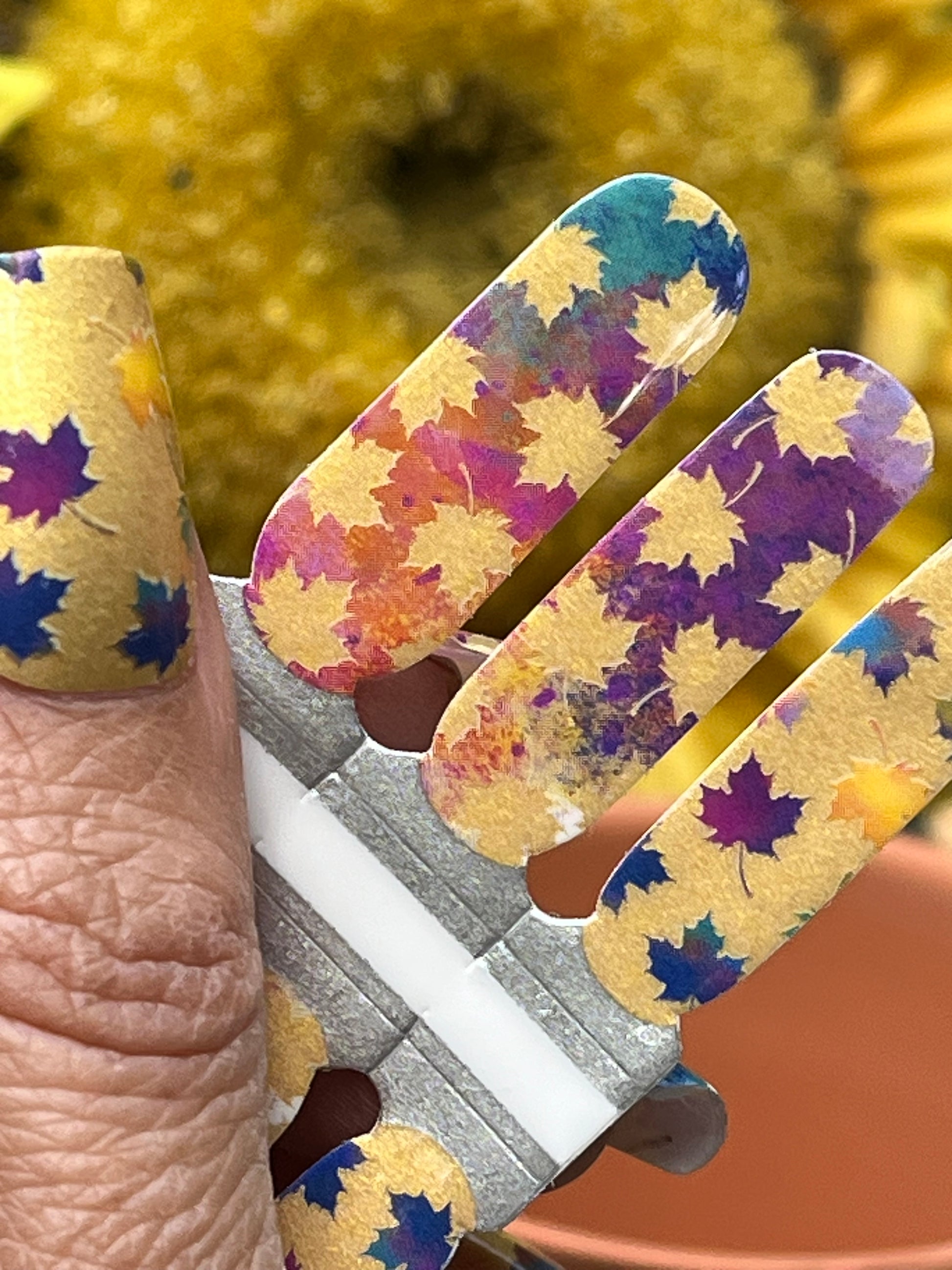 Celebrate autumn’s beauty with Colours of the Wind, a jewel-toned nail wrap set that’s as vibrant as the season itself. This shimmery gloss design features multi-coloured leaves scattered across golden and jewel-tone backgrounds, capturing the magic of crisp fall days and swirling foliage.