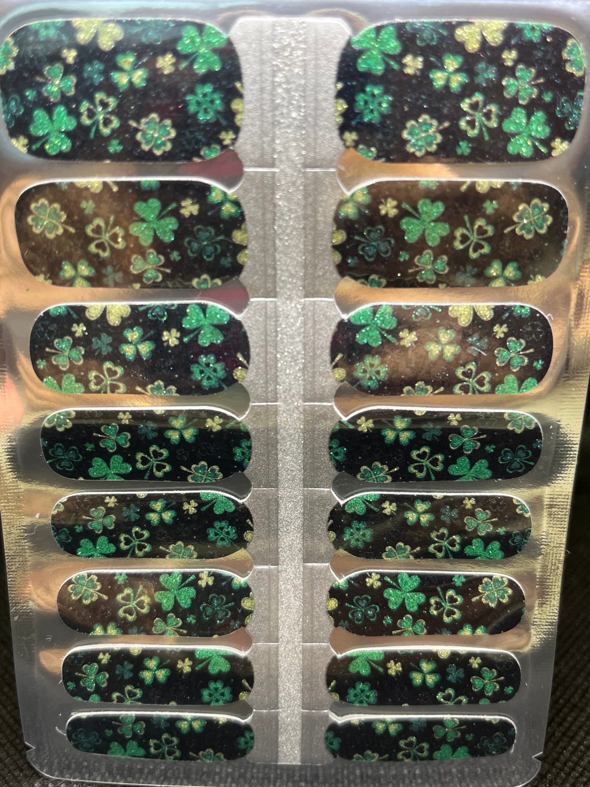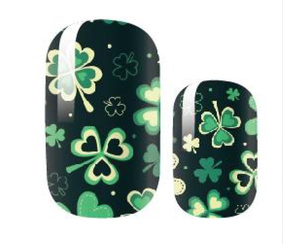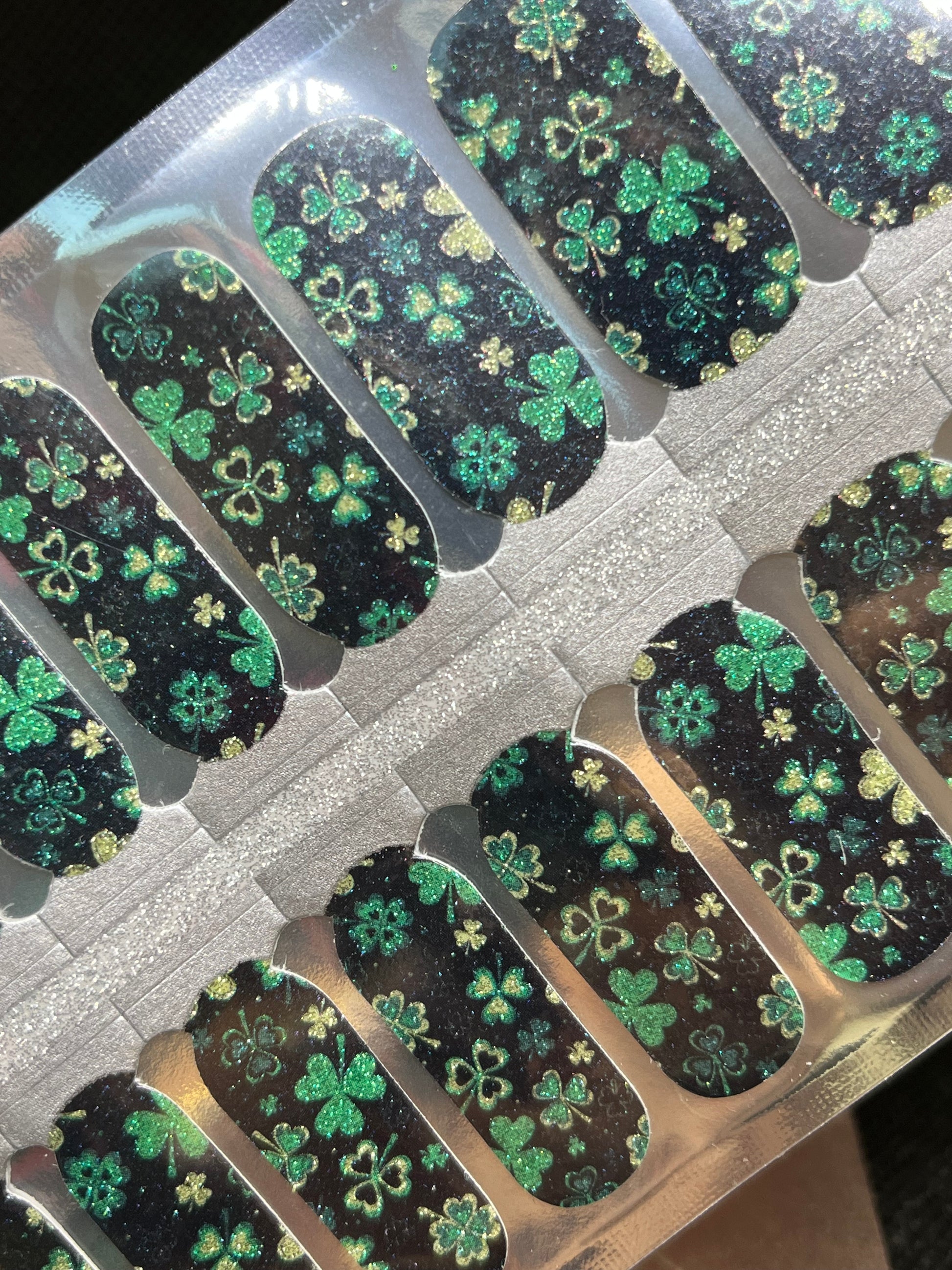 >Dark green background is sprinkled with a glittering mix of multi-coloured green shamrocks. Super fun for St. Patrick's Day!