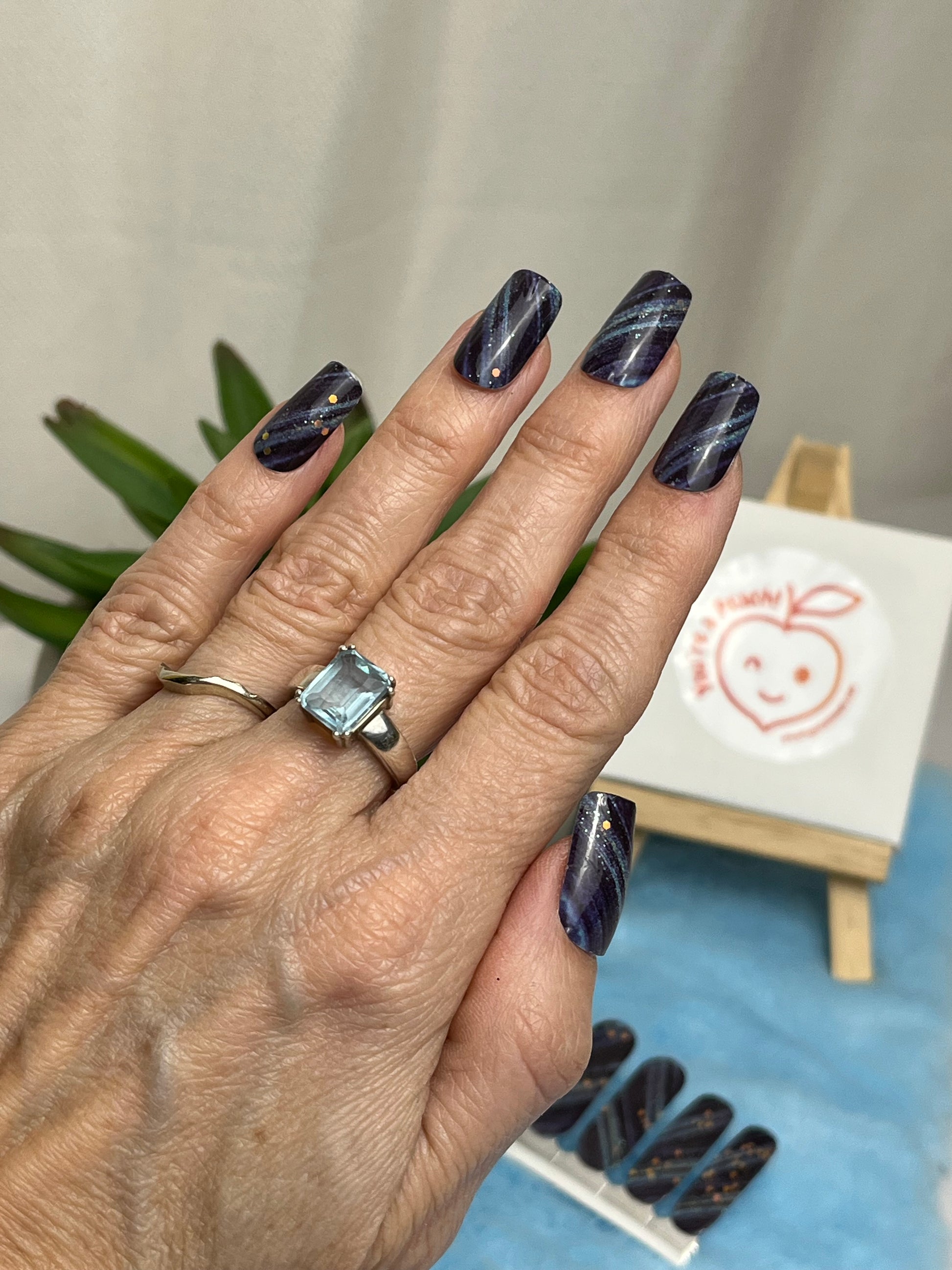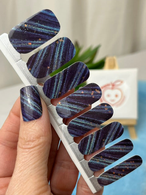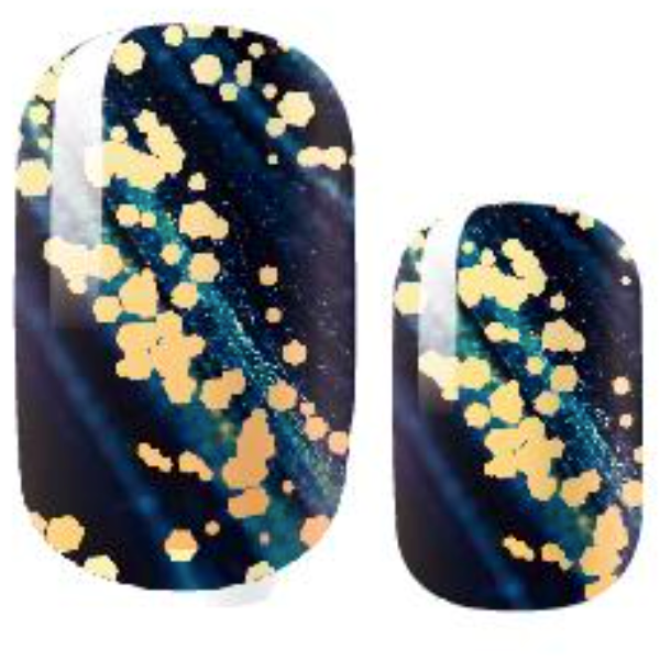 A dark indigo base is streaked with flashes of light blue and micro glitter plus a scattering of large gold glitter.
