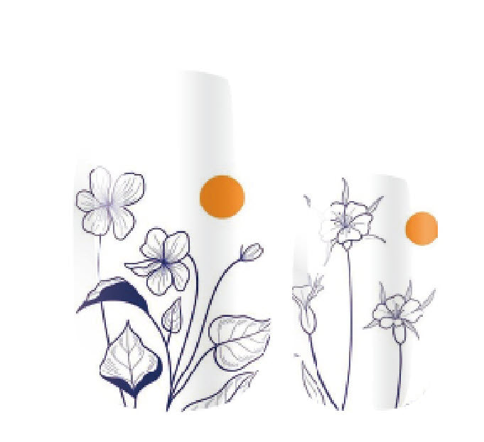 Dramatic white designs with dainty floral sketch pattern and orange & navy accent solids