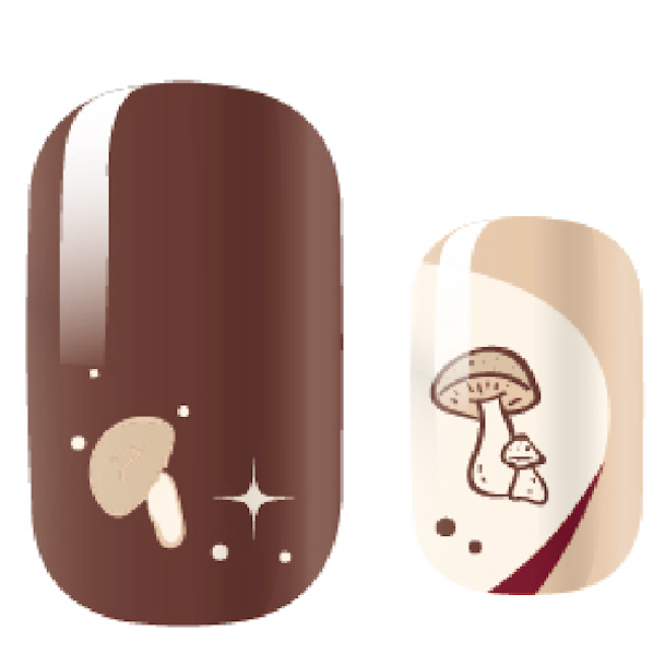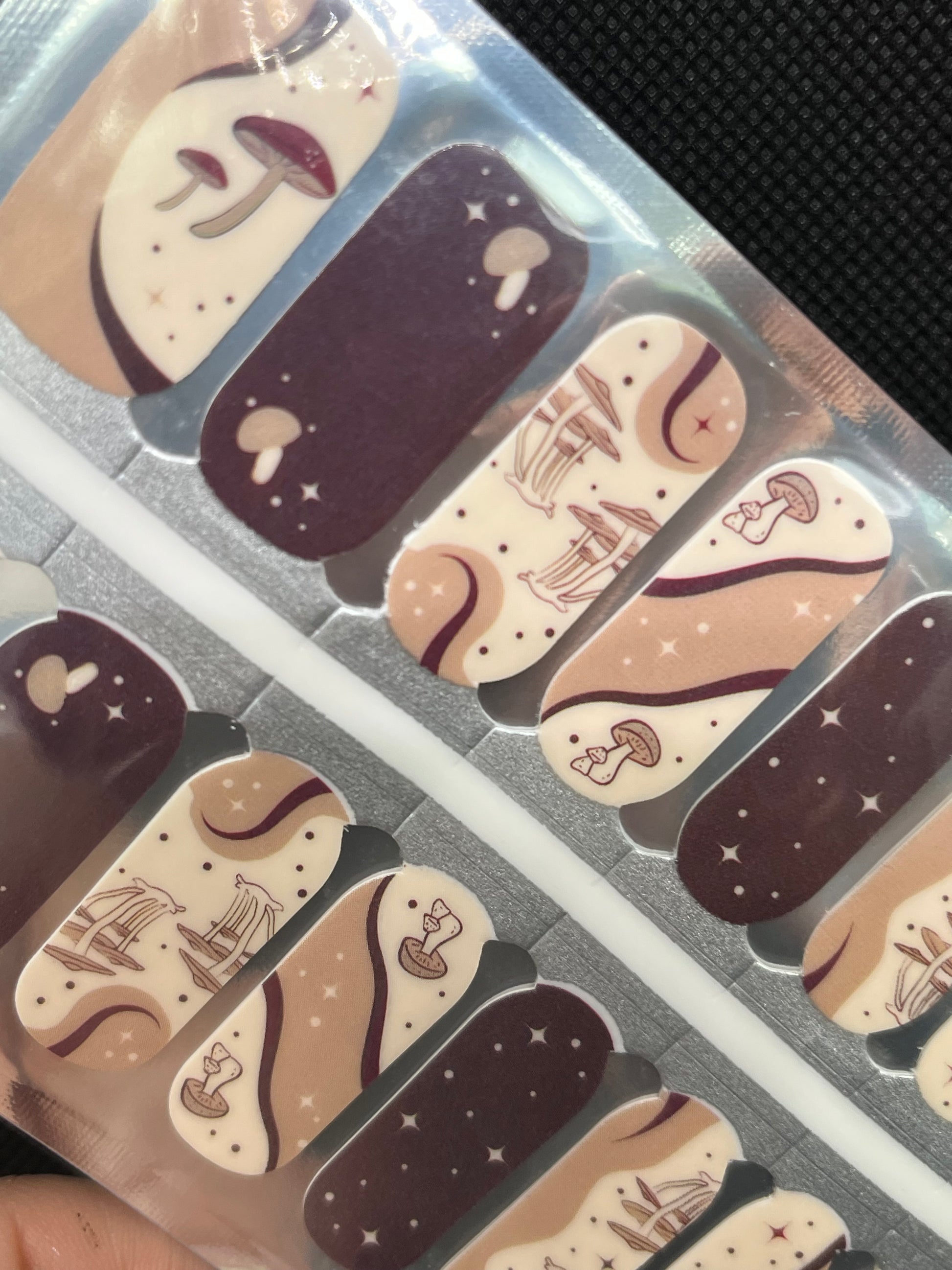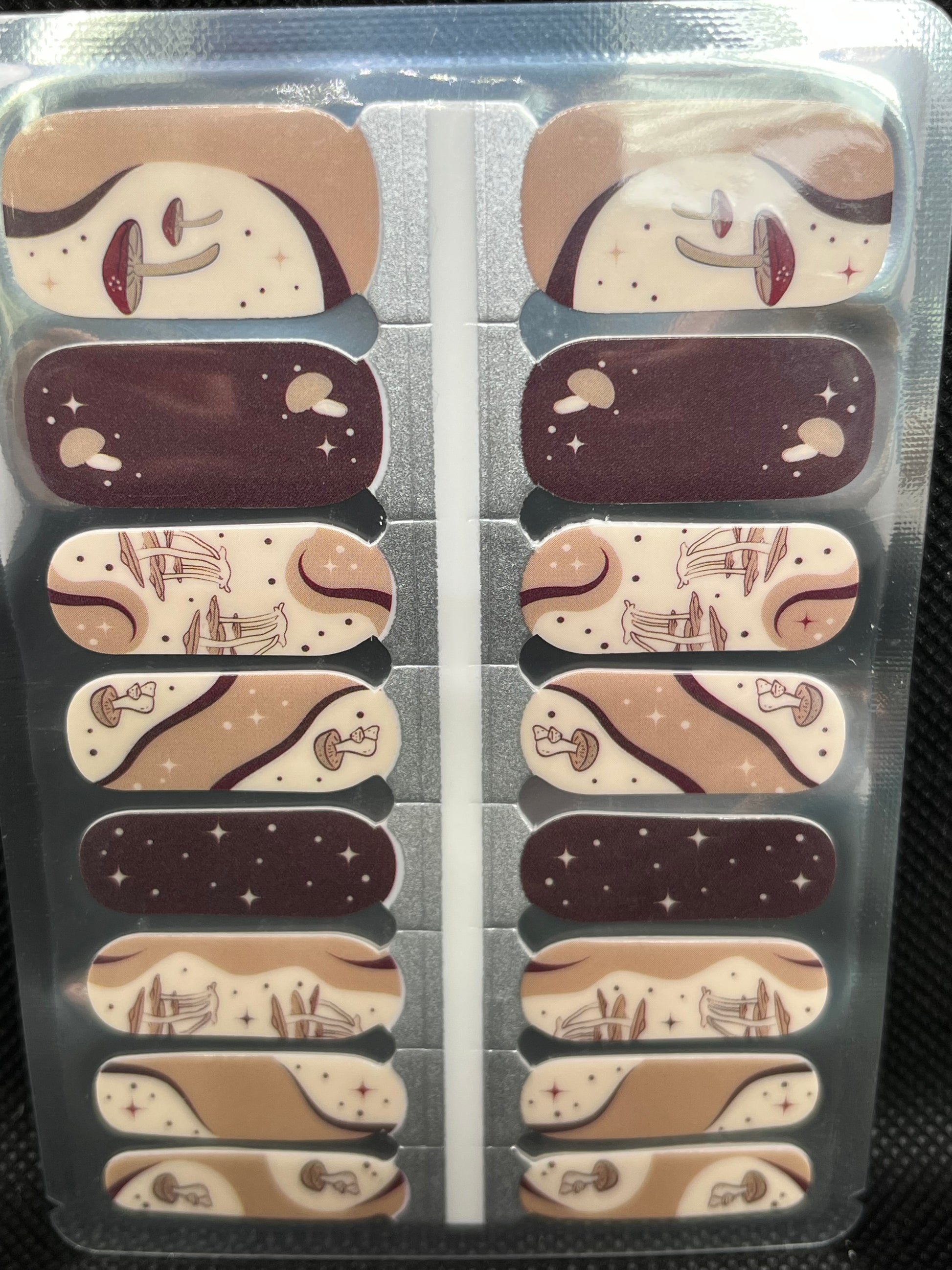 >Mix of beige, taupe and brown backgrounds with a swirling design featuring various mushrooms, stars and dots