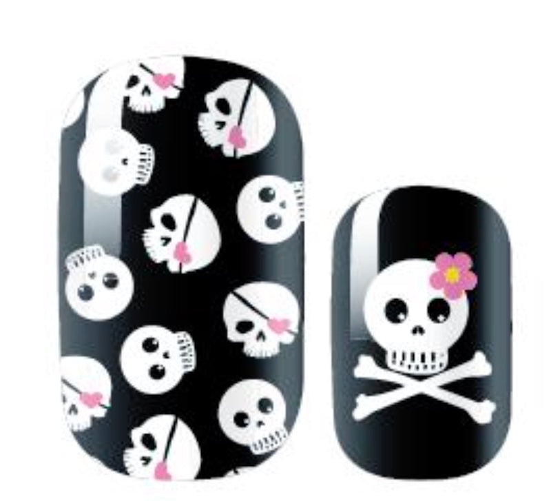 >Fun mix of girlie skull and cross bone floral pattern on a black background