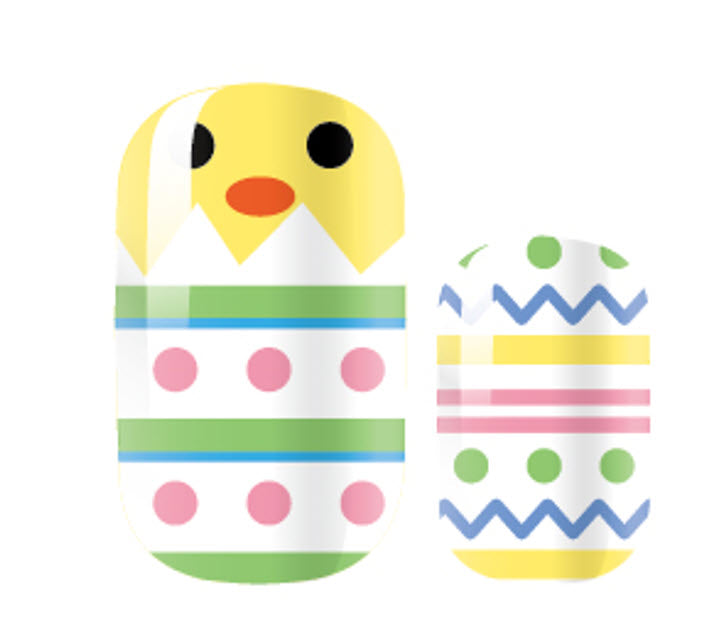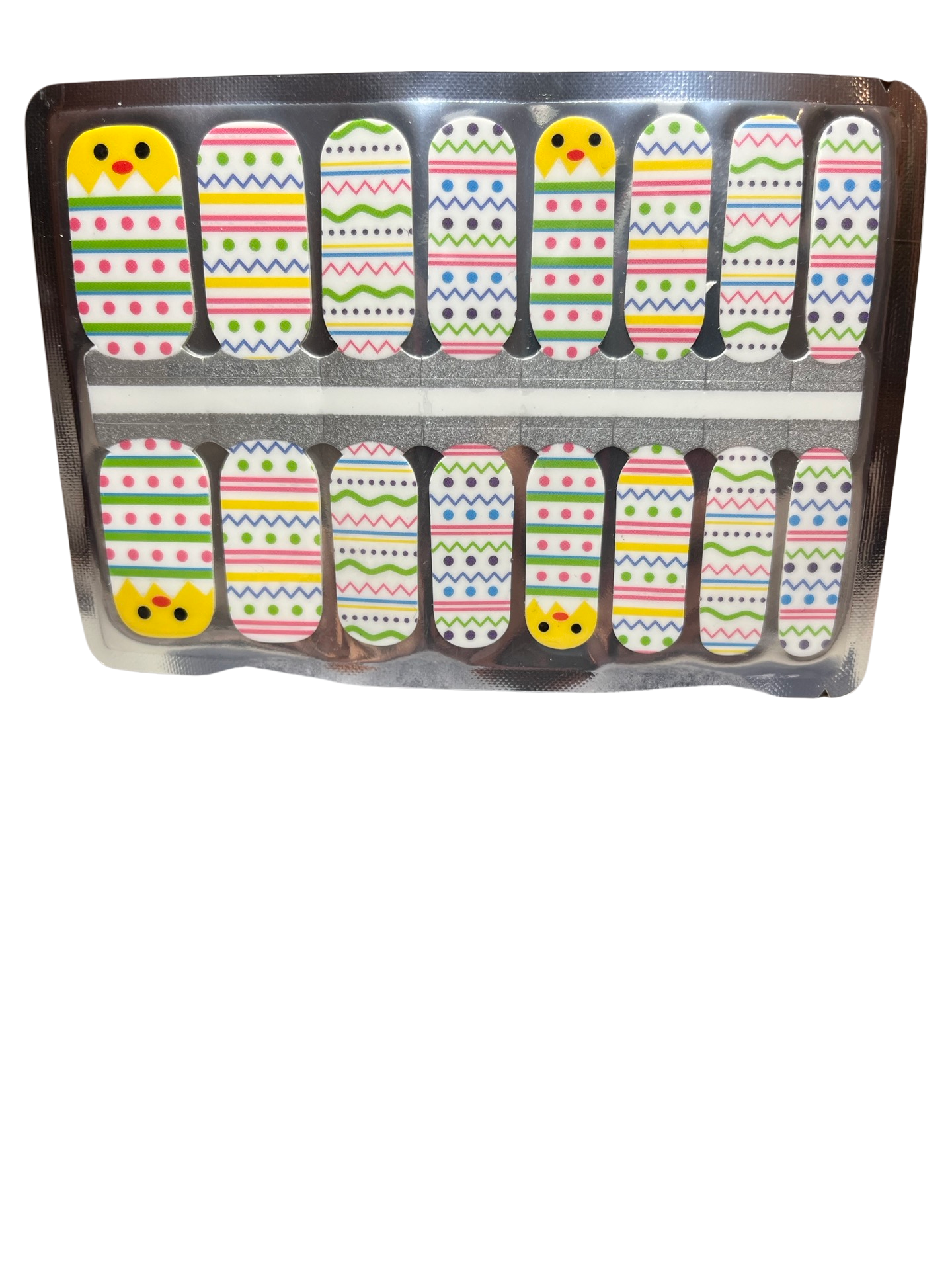 Fun & colourful Easter egg stripes on white background with cute baby chicks