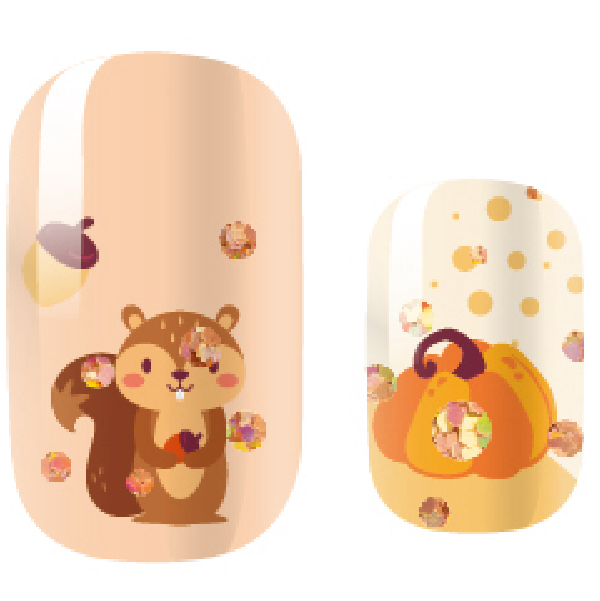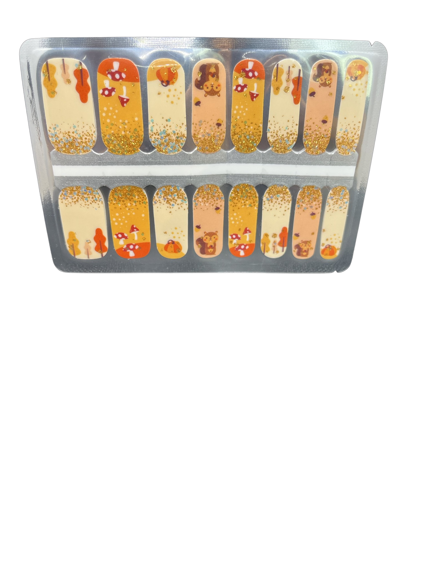 >Too cute for words. Mix of 3 base colours - off-white, pale orange & pale peach covered in a mix of cartoon toadstools, squirrels, pumpkins and trees + gold glitter.