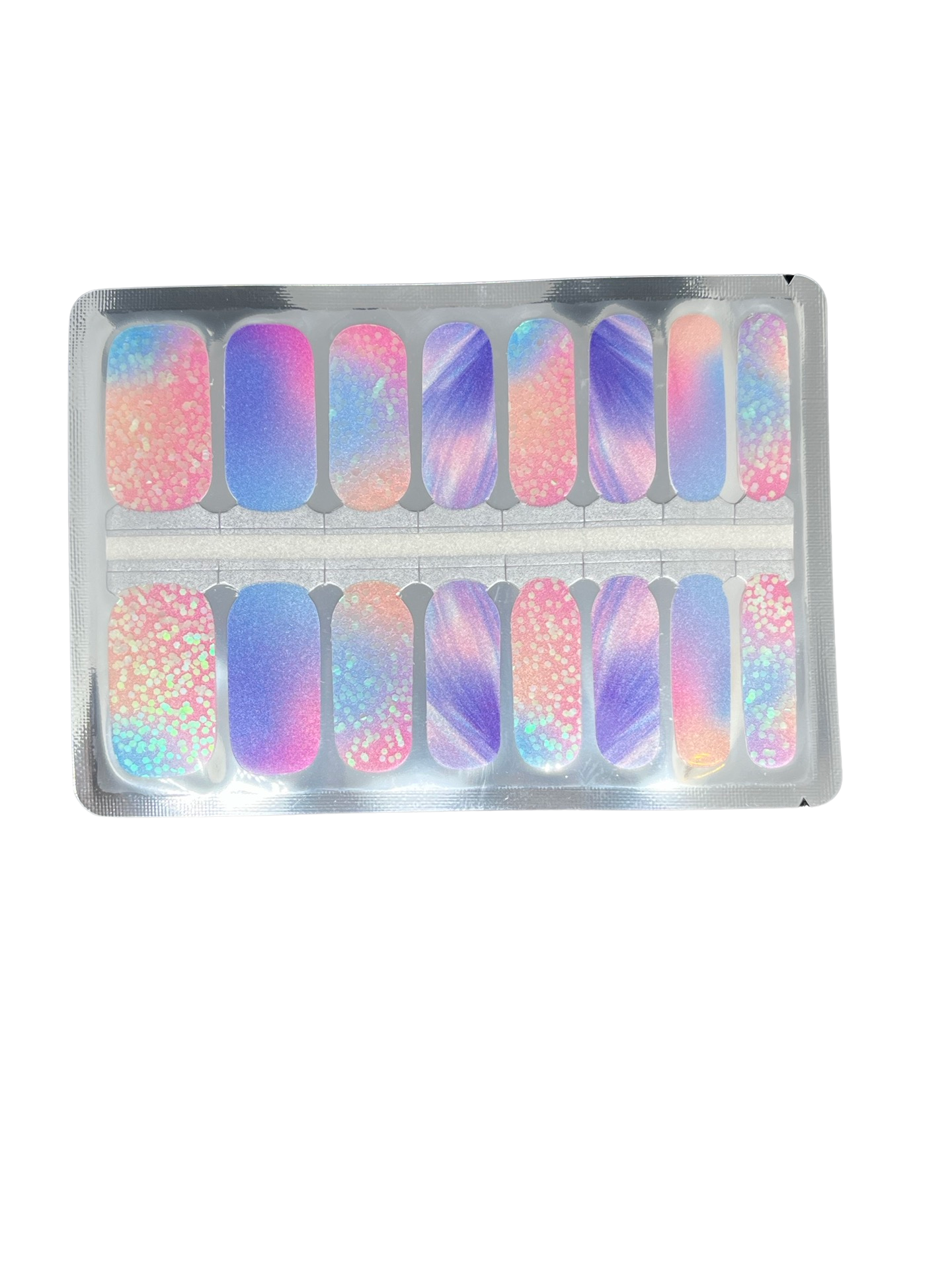 >Mix of 8 pink, purple & light blue swirls and 8 pink & blue accents wraps with large all-over pearlescent glitter