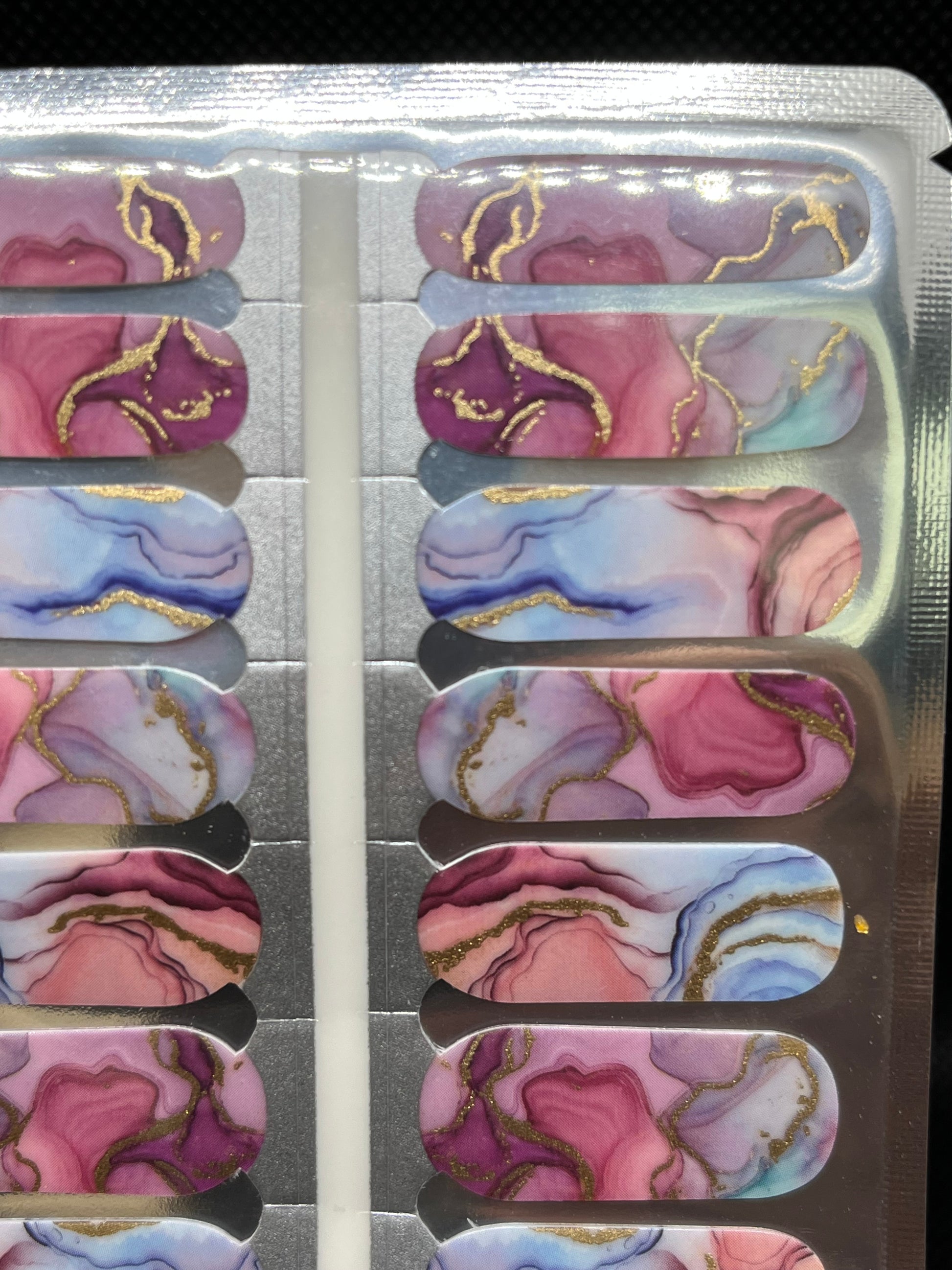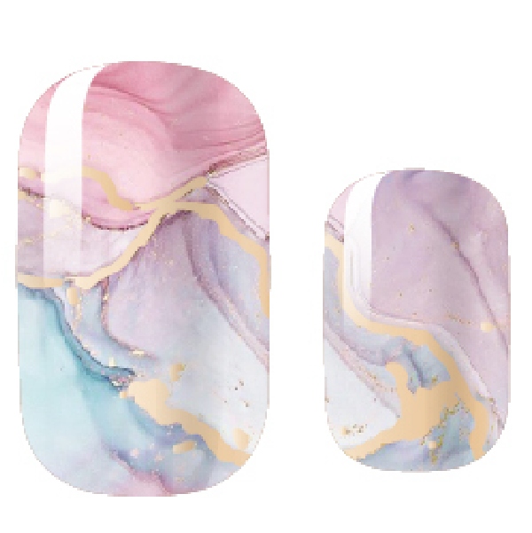 > Pink, blue, mauve and grey marble design with veins of gold leaf accents.