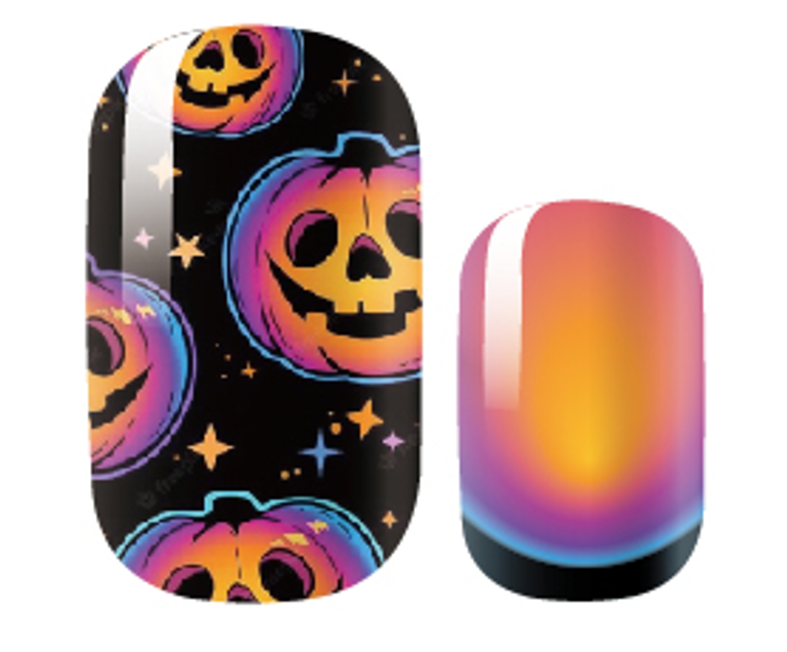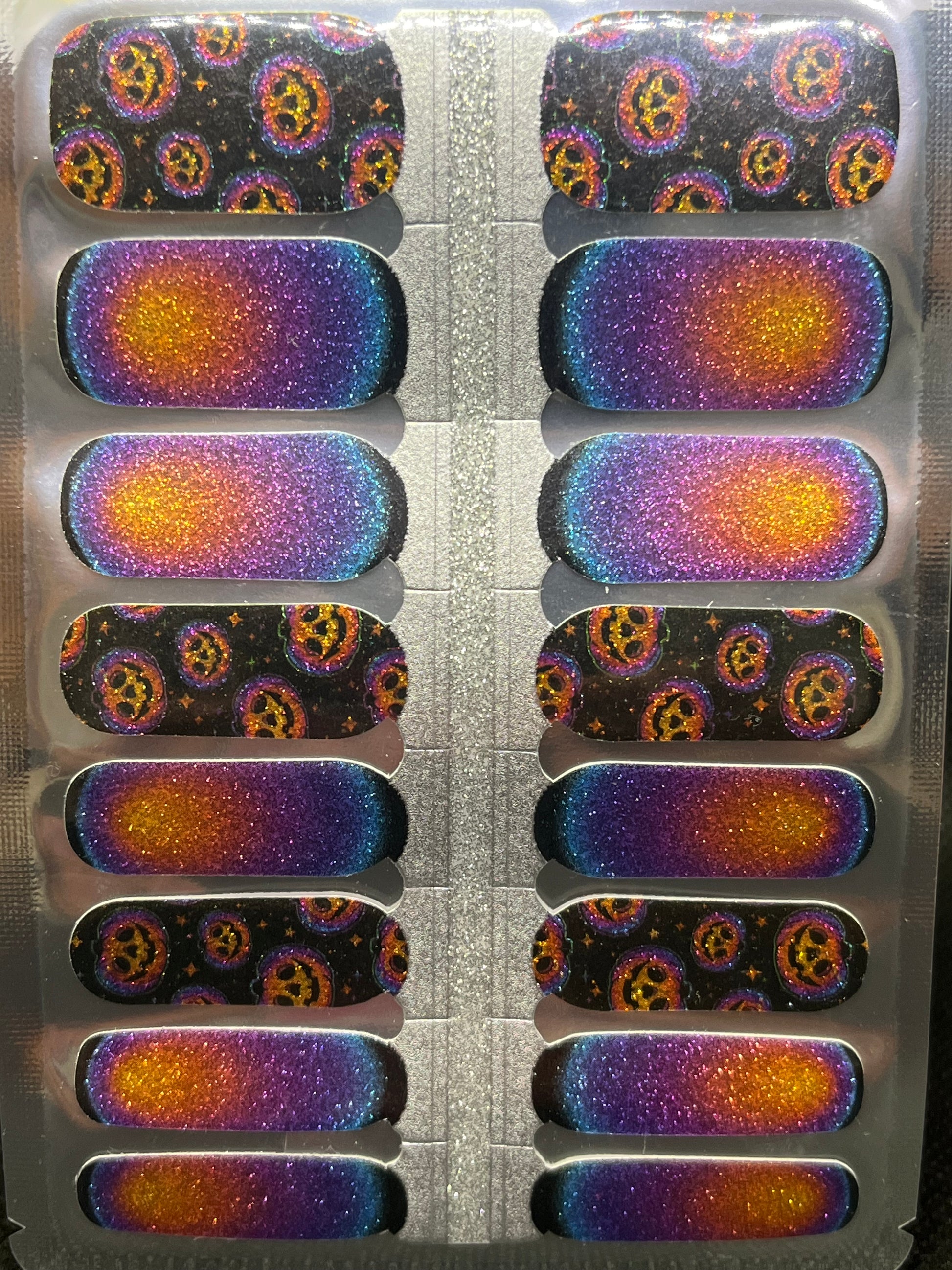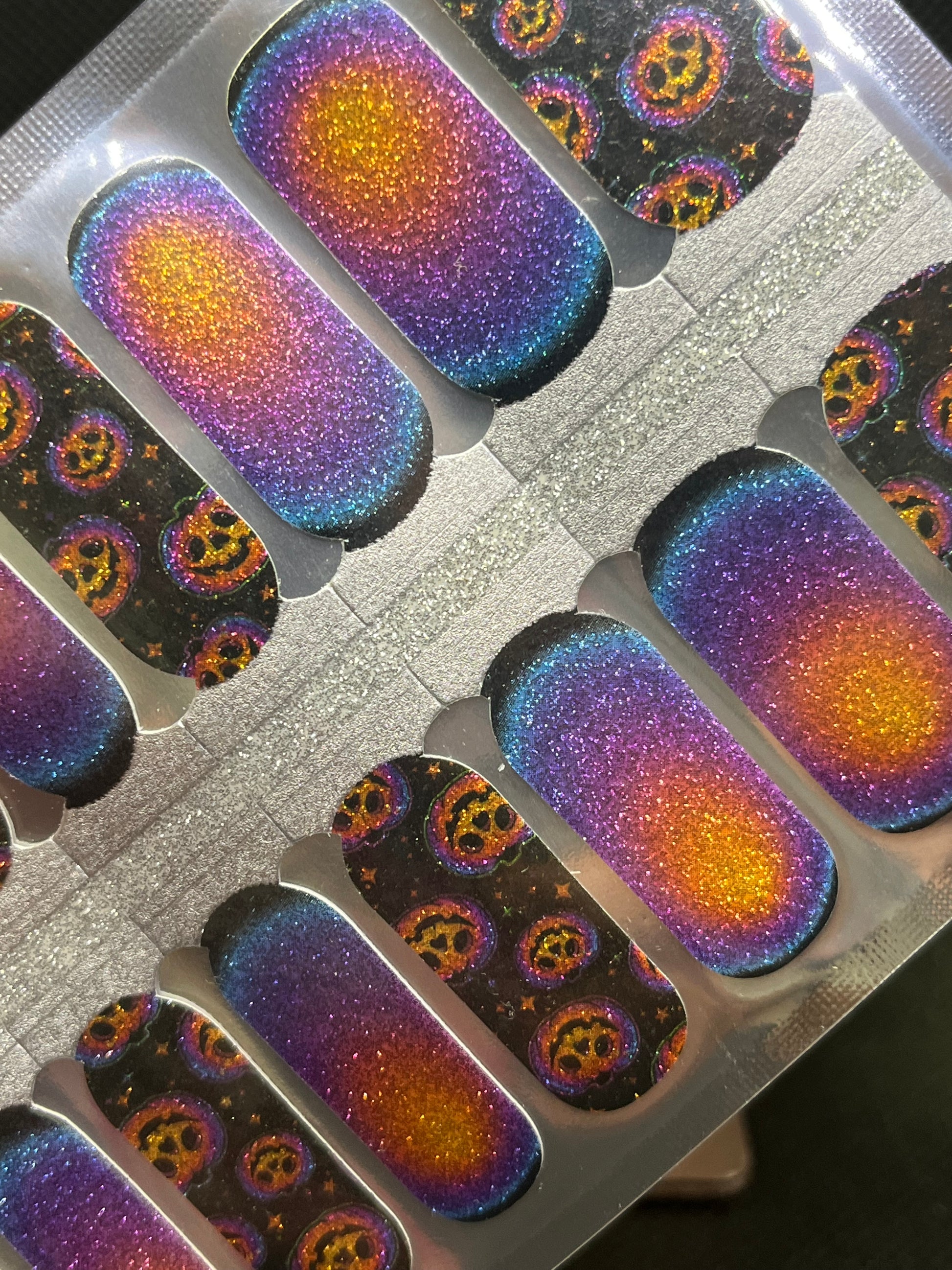 Bright, fun Hallowe'en design with a load of bright glitter and jewel-tone happy jack-o-lanterns.