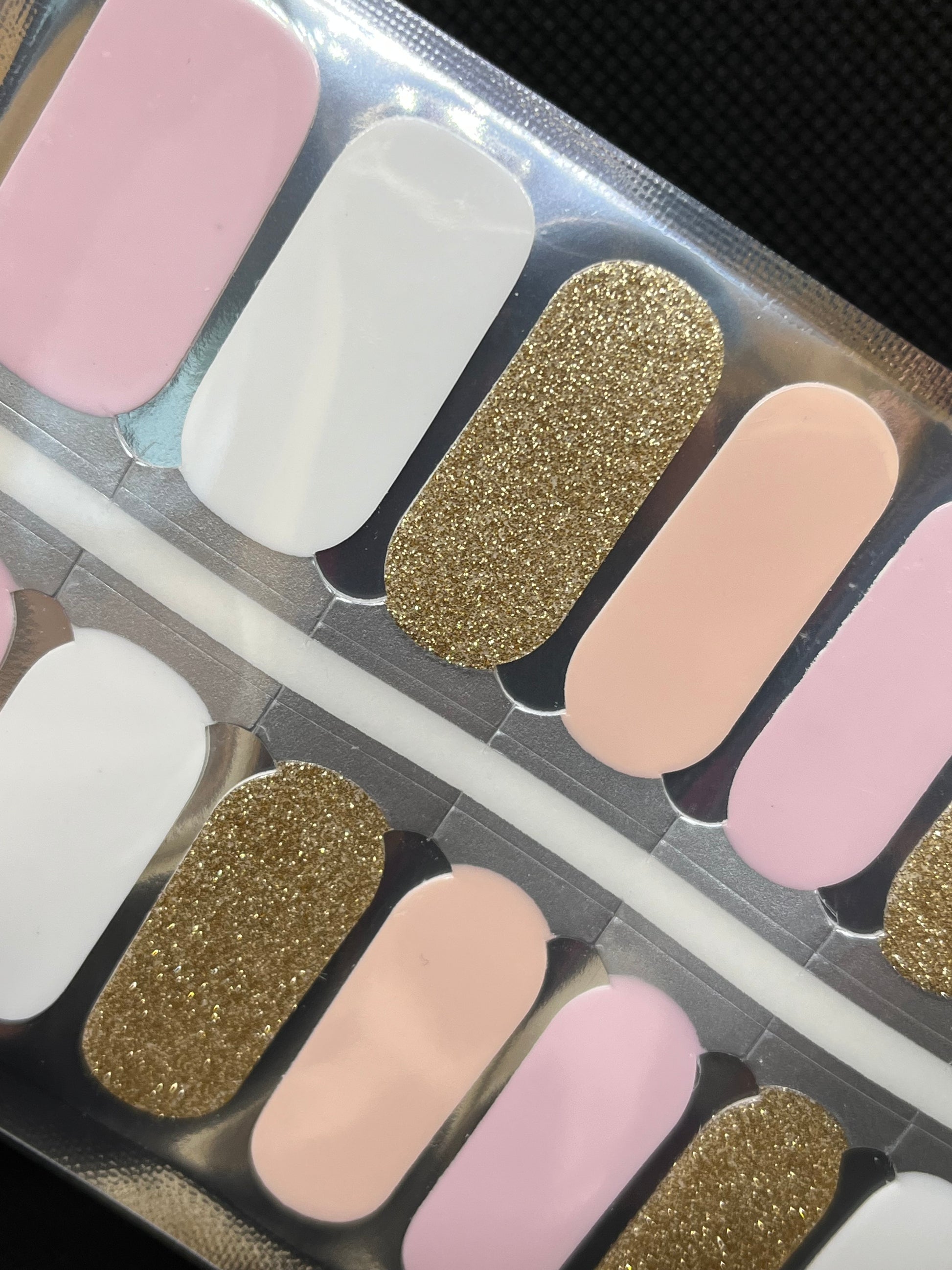 >A set comprised of 4 different solid coloured wraps. Two wraps in each colour - white, light blush pink, very light peach and gold glitter.