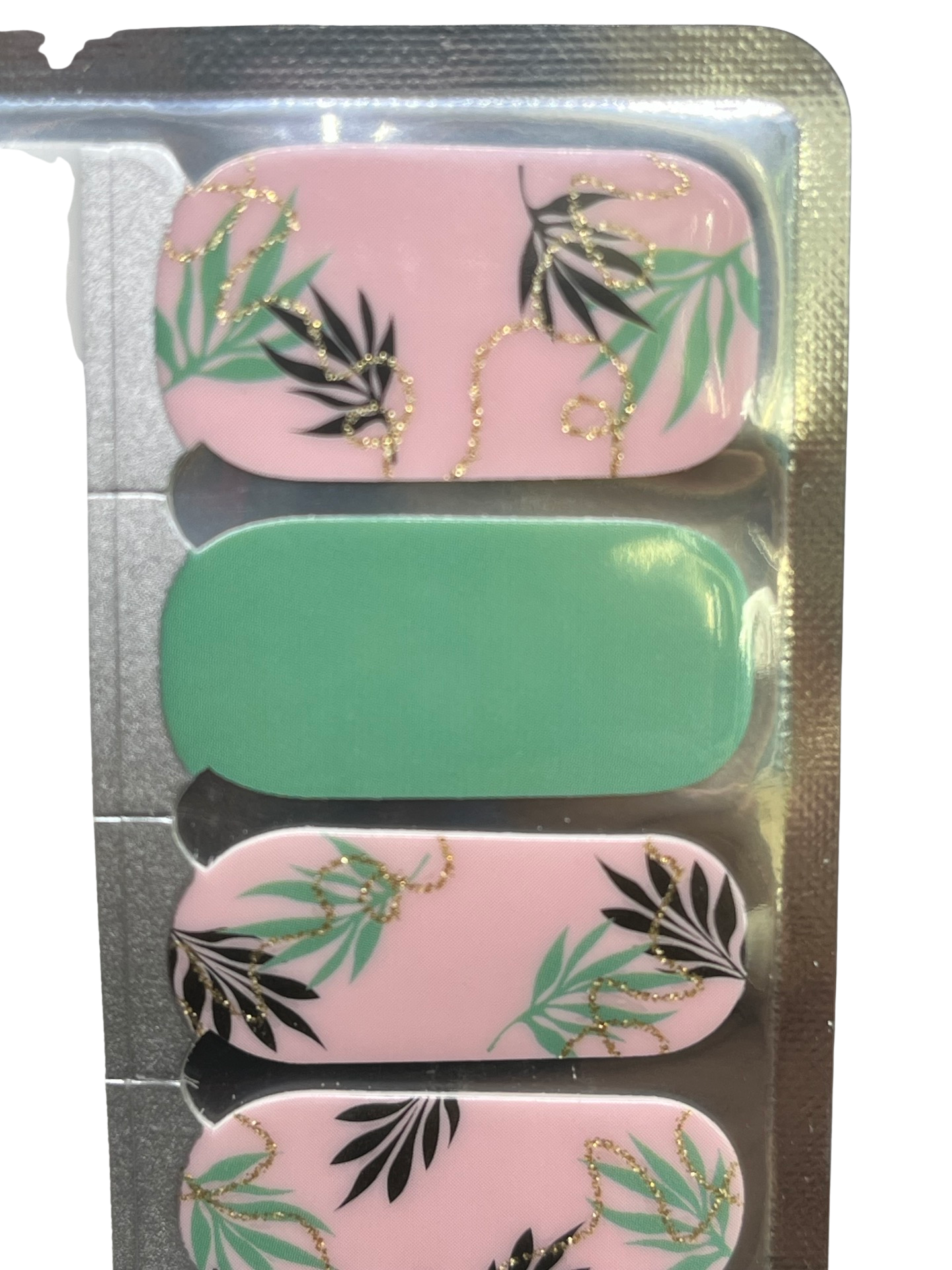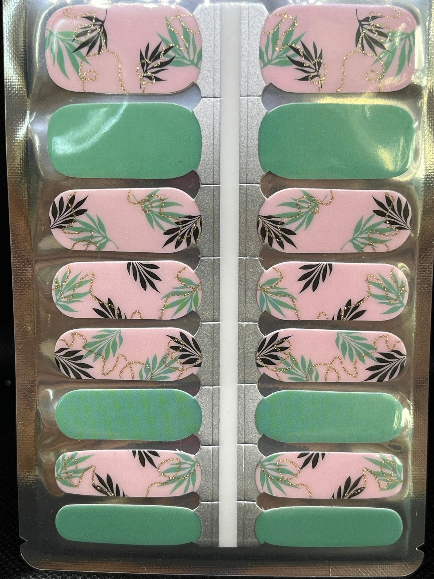> Mix of minty green solids + pale pink with black & green leaves with gold accent ribbon. 6 green wraps. 10 pink floral wraps.