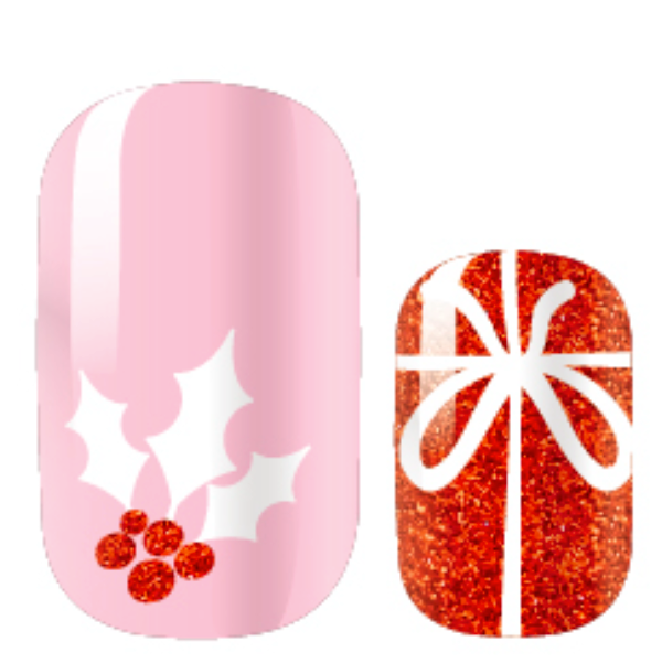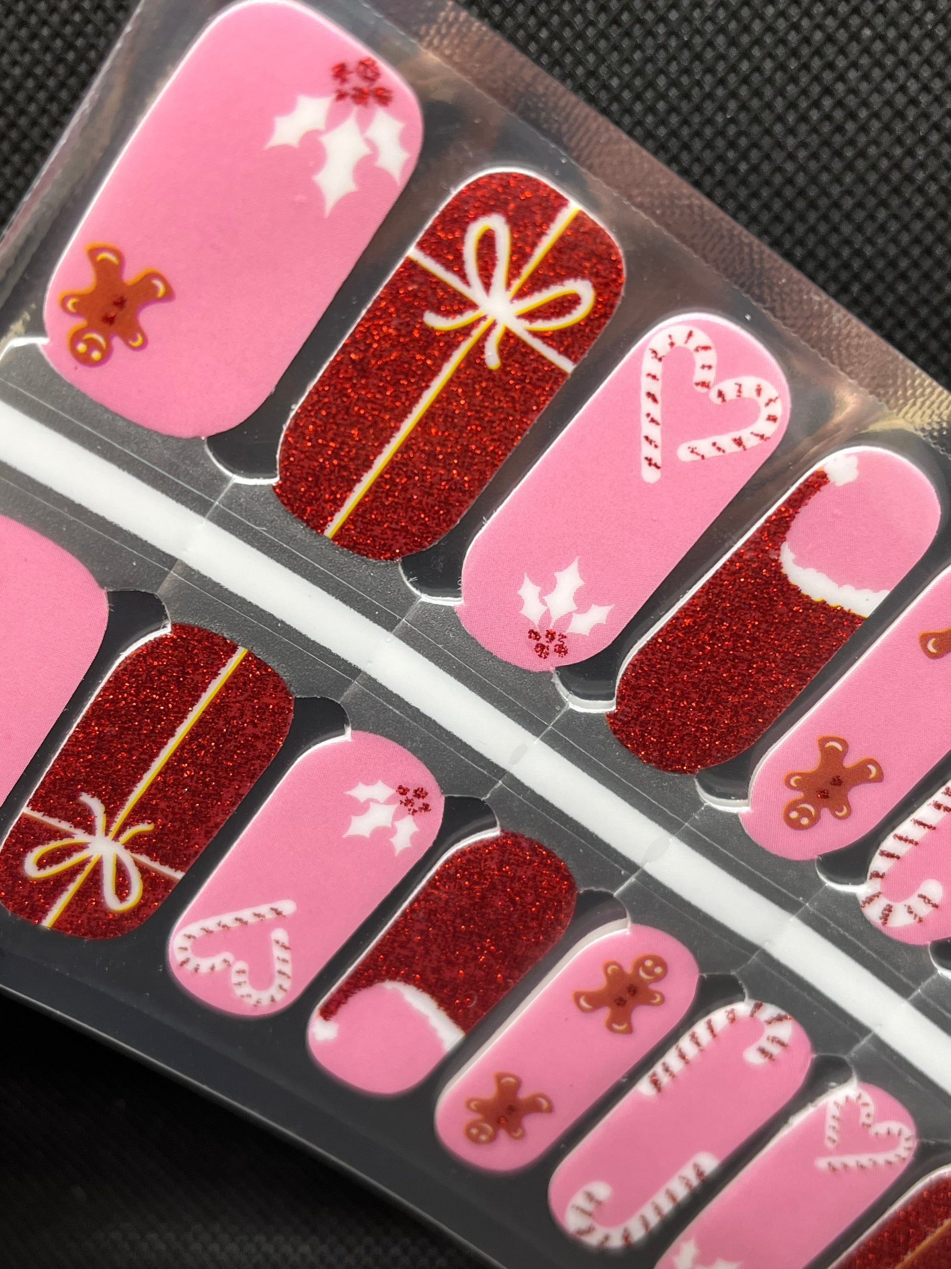 >Bright pink & red glitter combine to create a design that features gingerbread men, candy canes, holly and red glitter wrapped gifts.