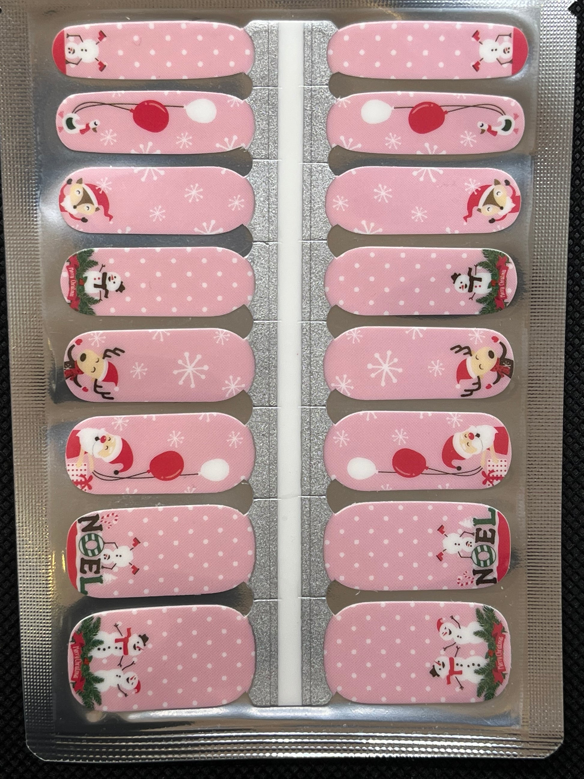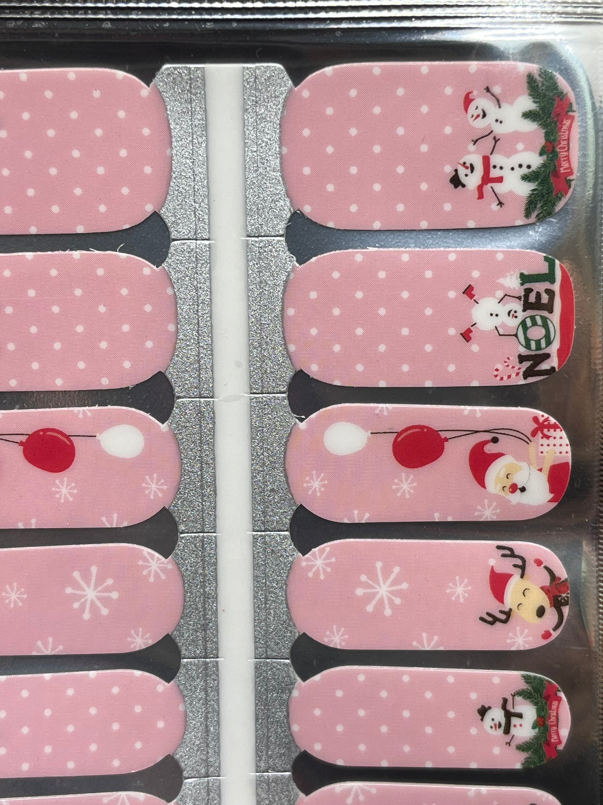 >Super fun design that features Santa and his holiday friends on a pale pink background with white polka dots and snowflakes.