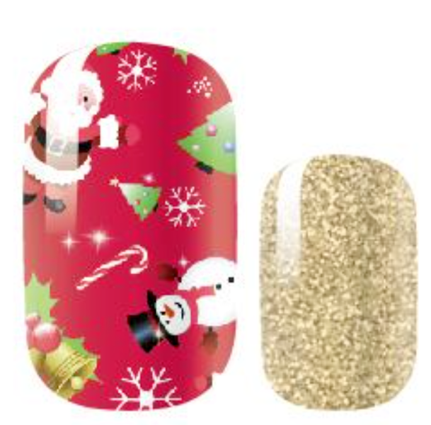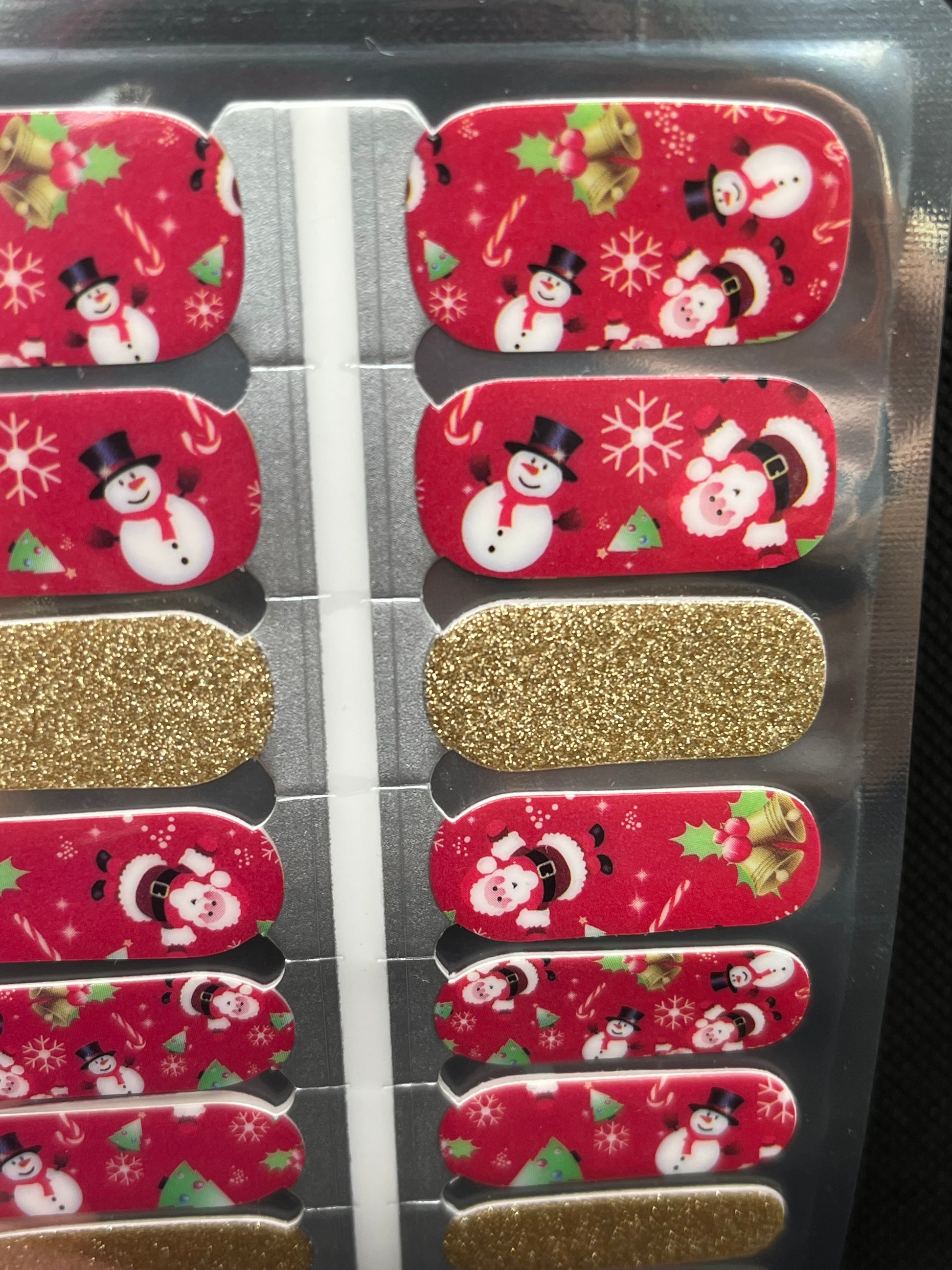>12 bright red wraps covered in small snowmen, candy canes, Santa, Christmas trees and bells PLUS 4 bright gold glitter accent wraps.