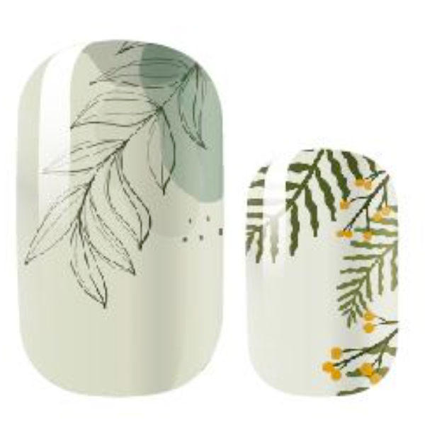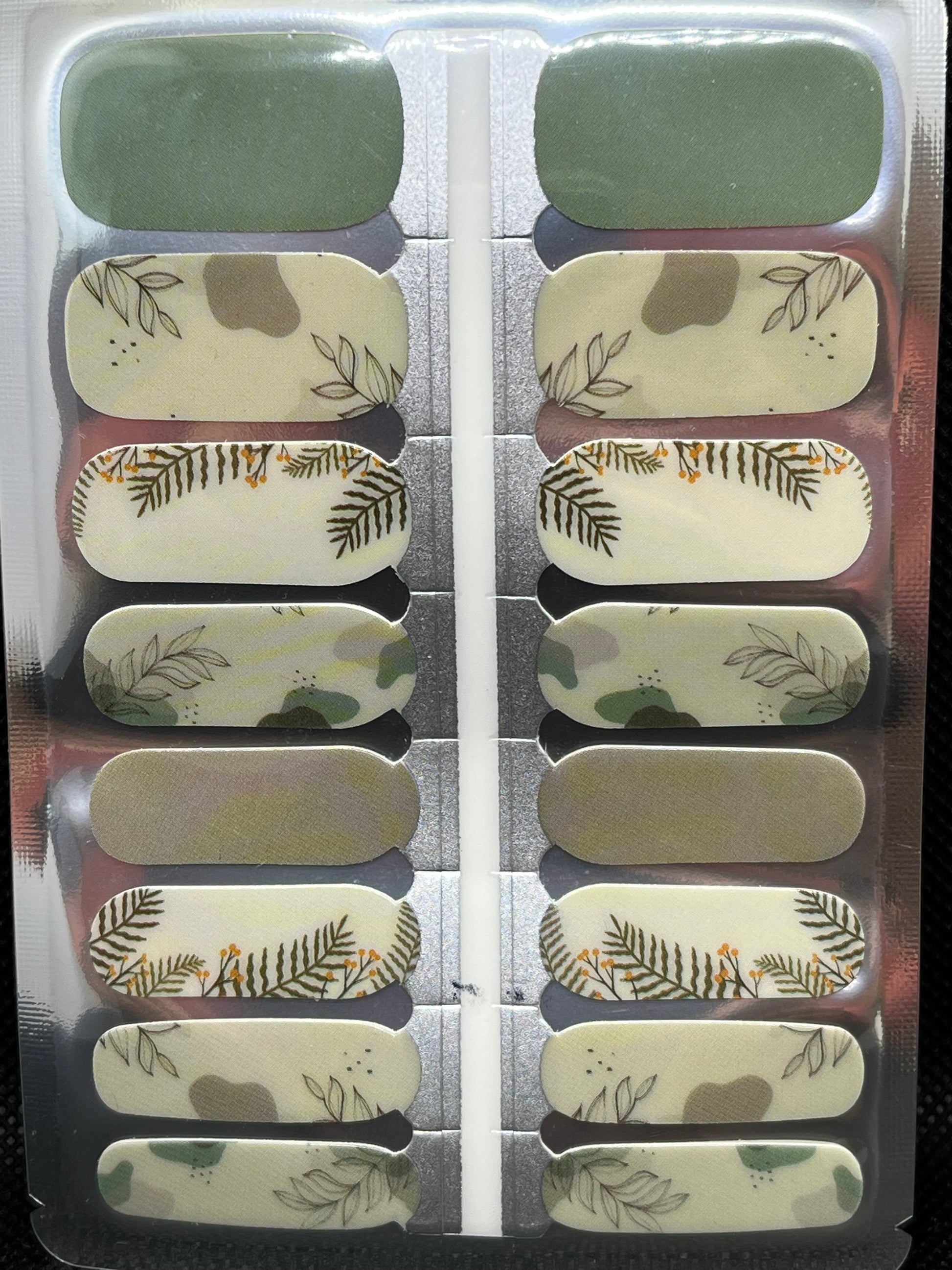 >Mix of subtle greens and khakis - 4 solid wraps in two colours + 12 wraps with light beige backgrounds and abstract leaves, ferns & flowers.