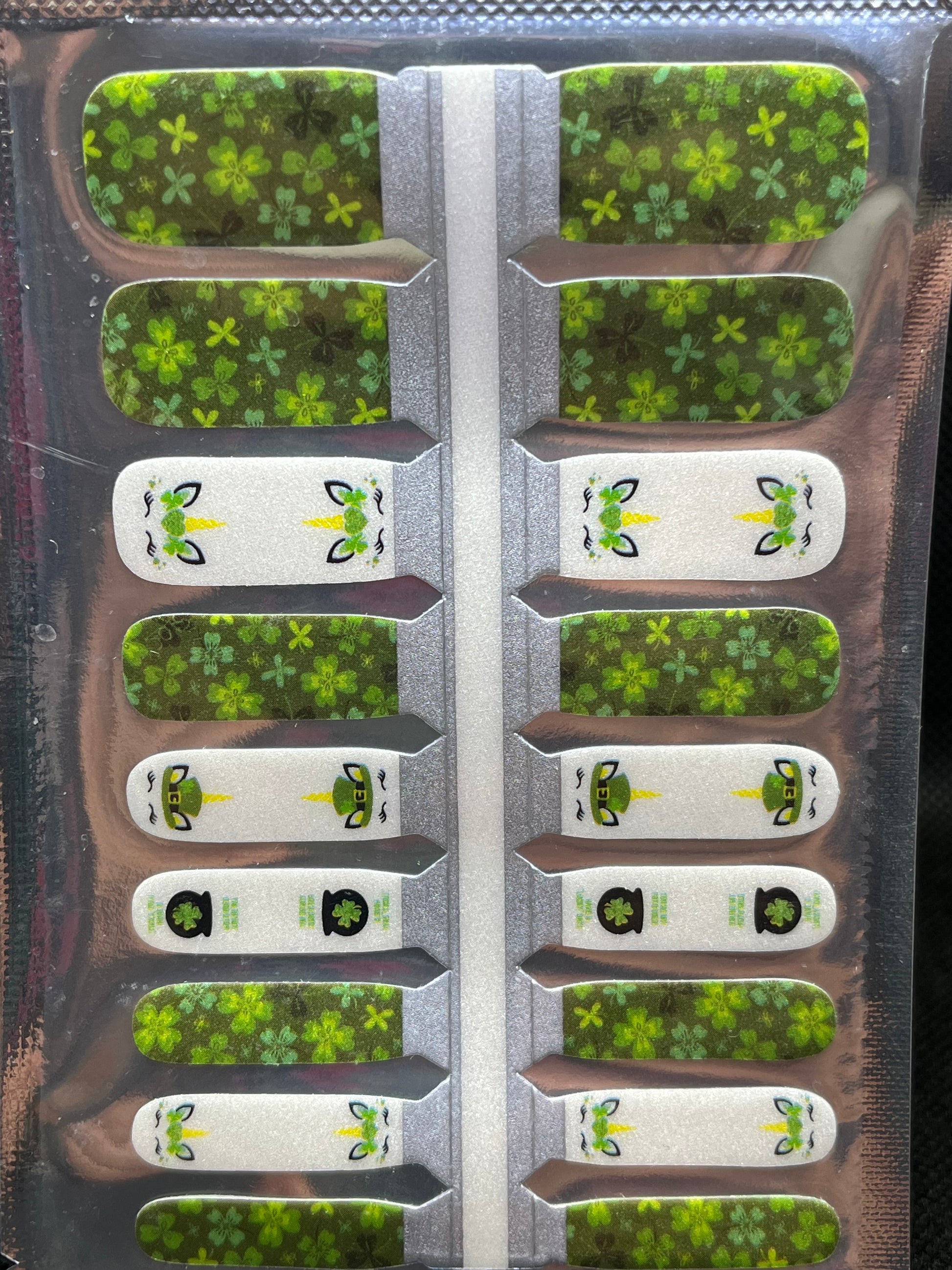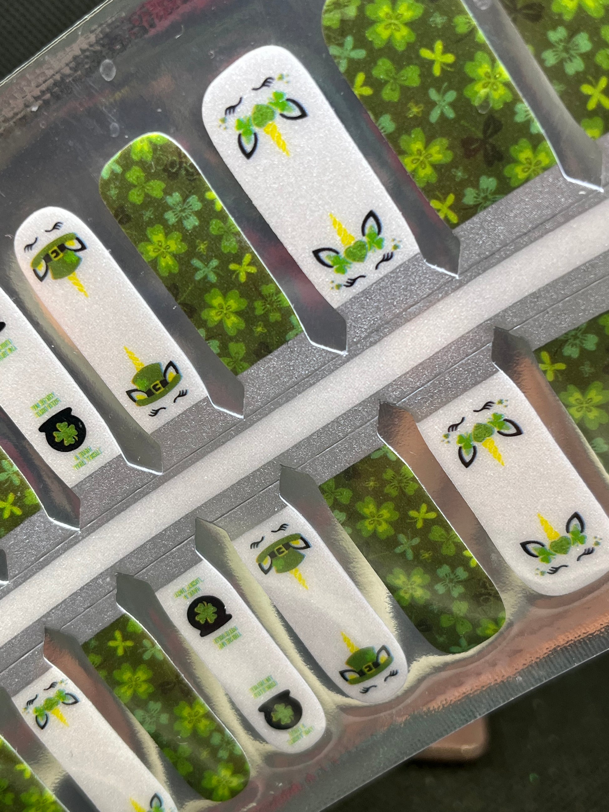 > A fun design for St Patrick's Day! Green shamrocks, cute unicorn faces and pots of leprechaun gold decorate this set.