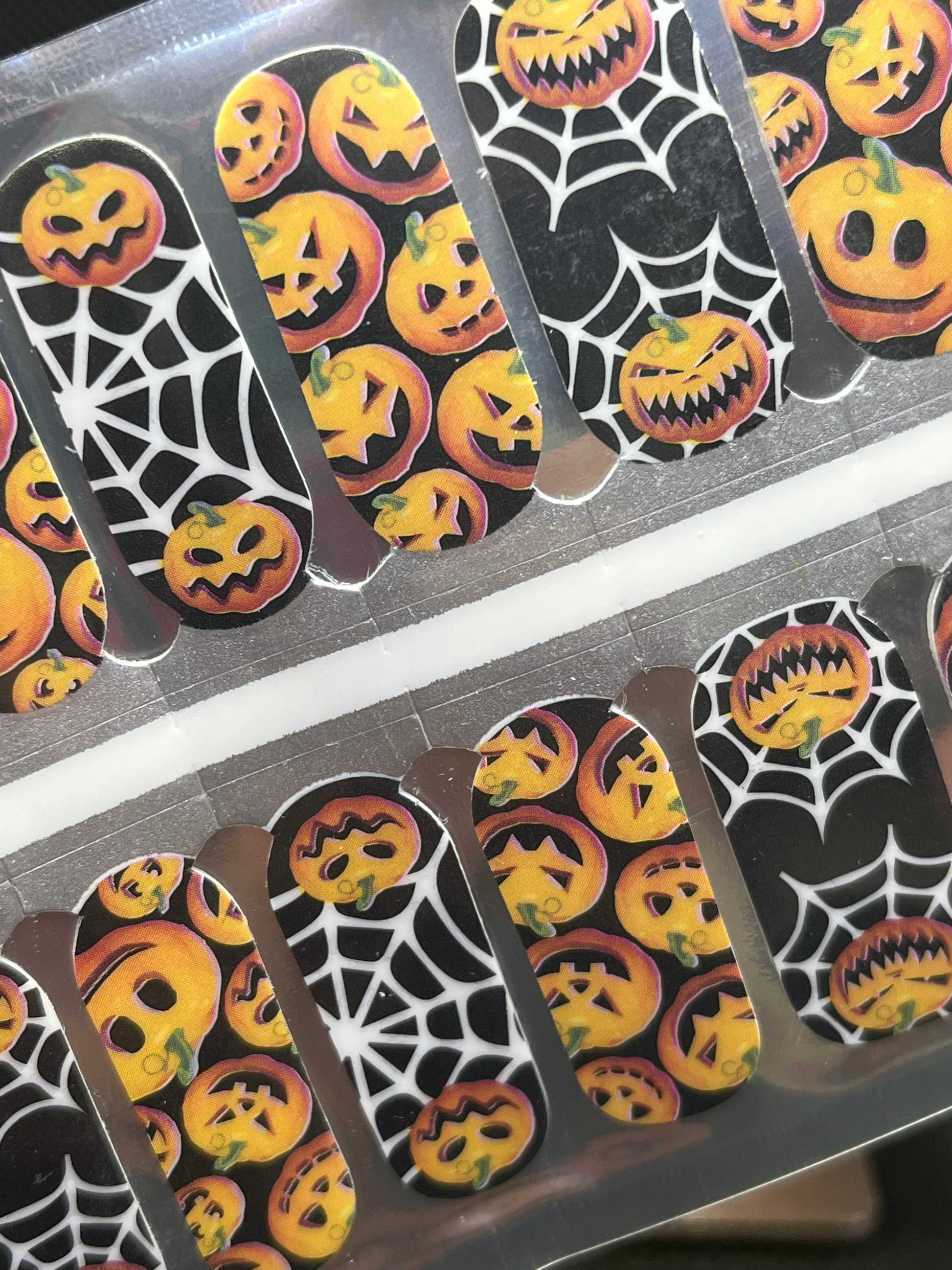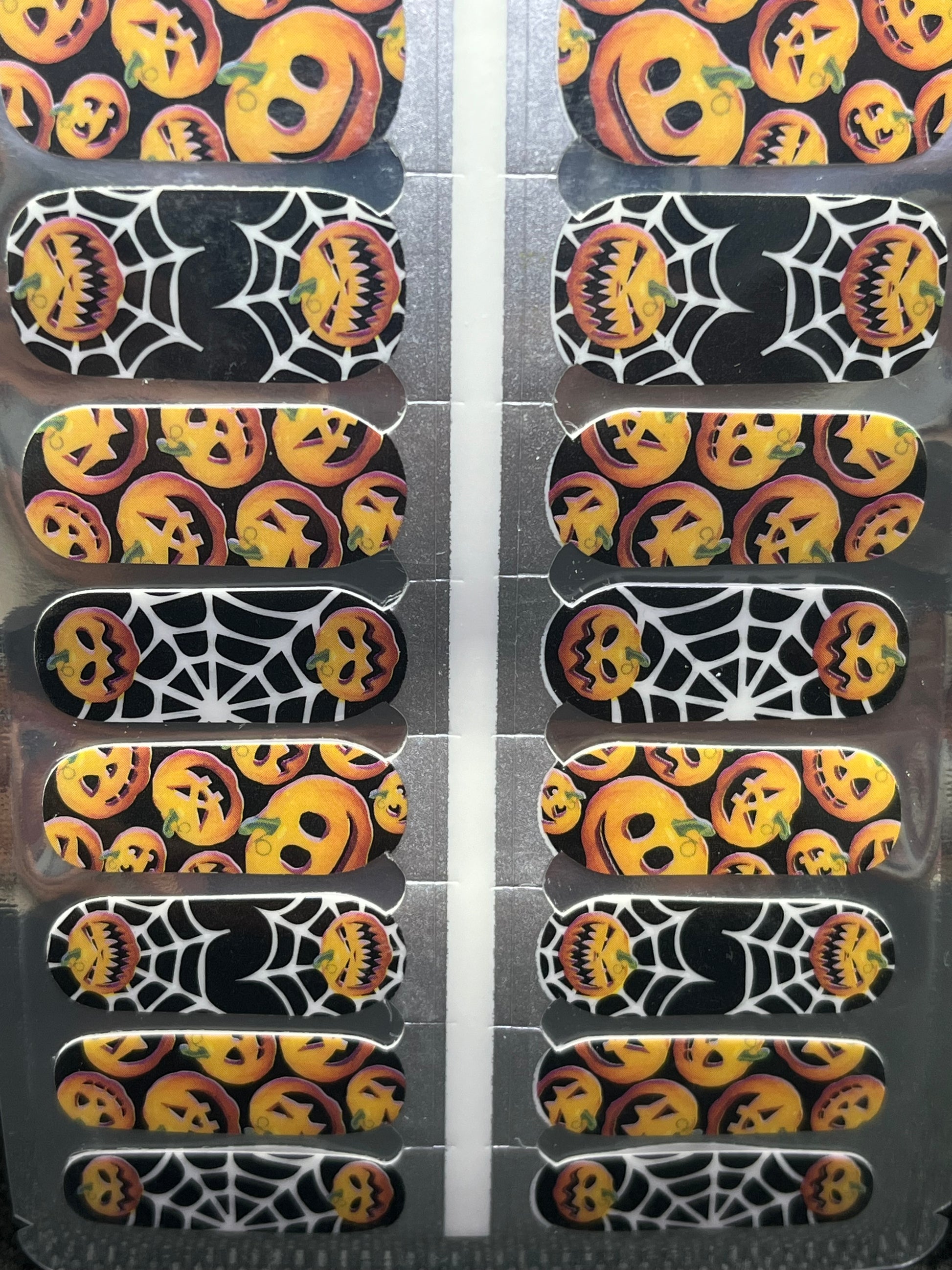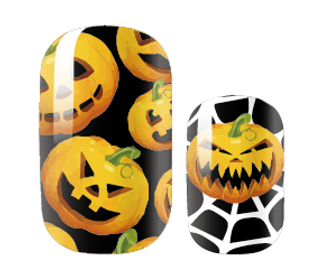Be ready for Trick or Treating with these fun nails. Jack-o-lanterns and spider webs cover a black background to create a perfect Hallowe'en manicure!