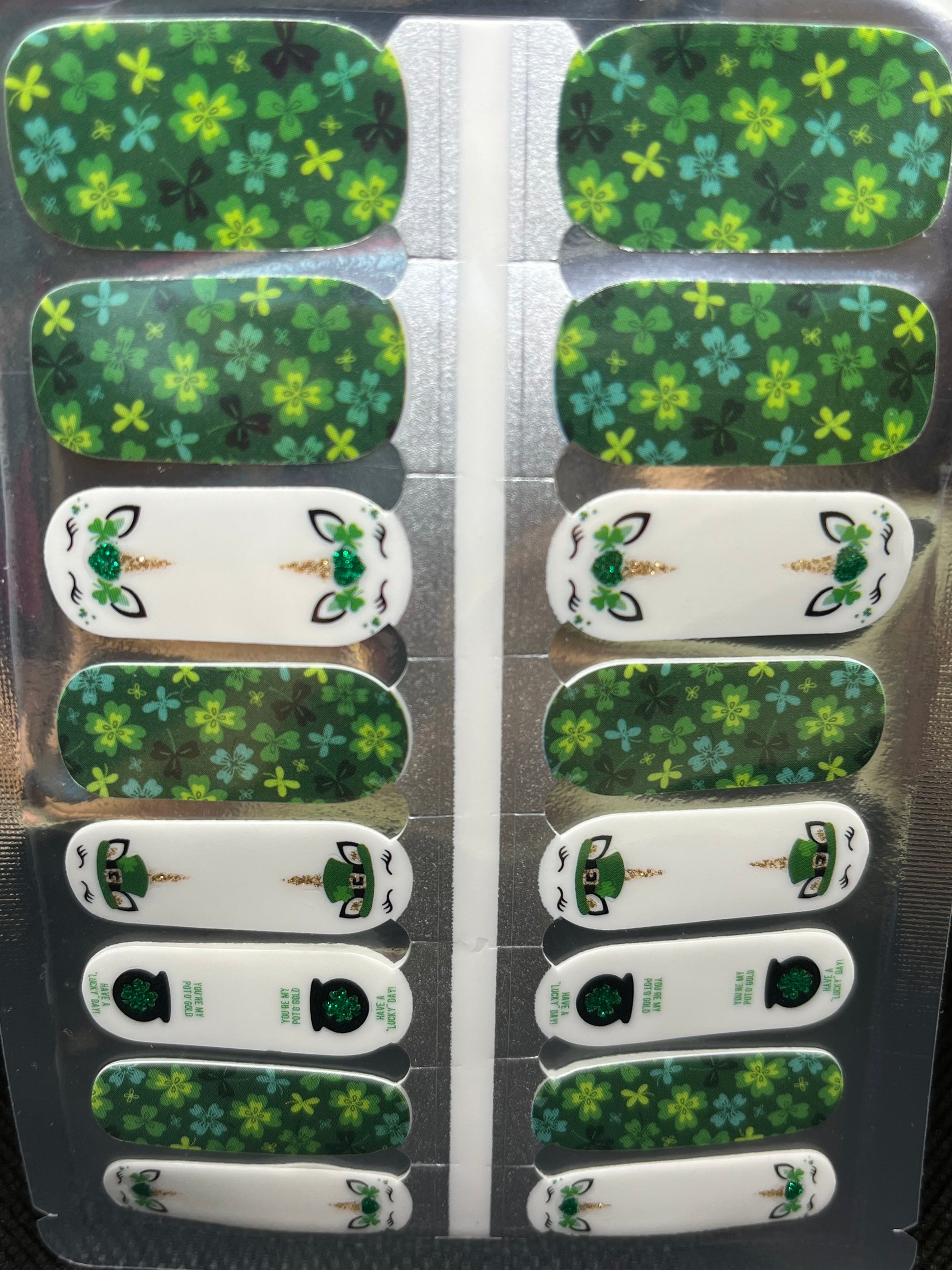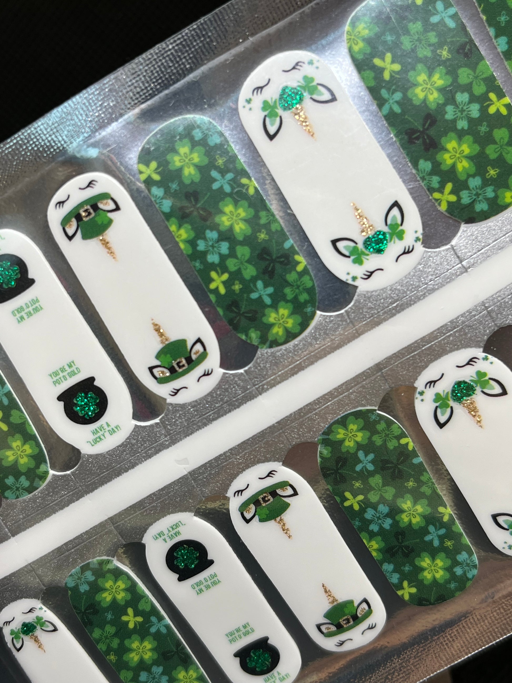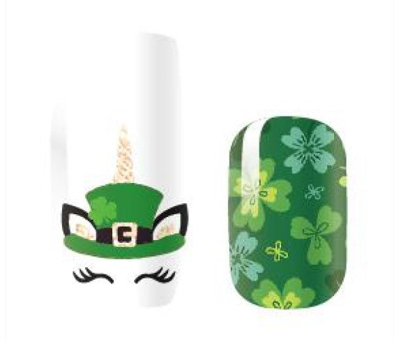 >Mix of 8 wraps sprinkled with multi-coloured mini shamrocks + 8 wraps with white backgrounds and super cute graphics featuring smiling St Patty's unicorn faces or a sparkly pot of gold. Text reads "You're my pot of gold' and "Have a lucky day!"