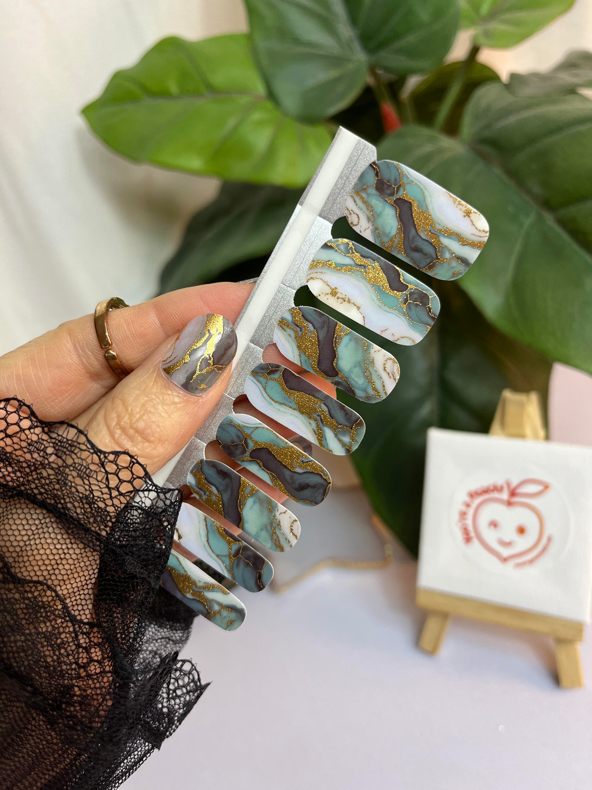 >Semi-translucent design of white and shades of green swirl together to create a marble look topped with veins of antique gold.