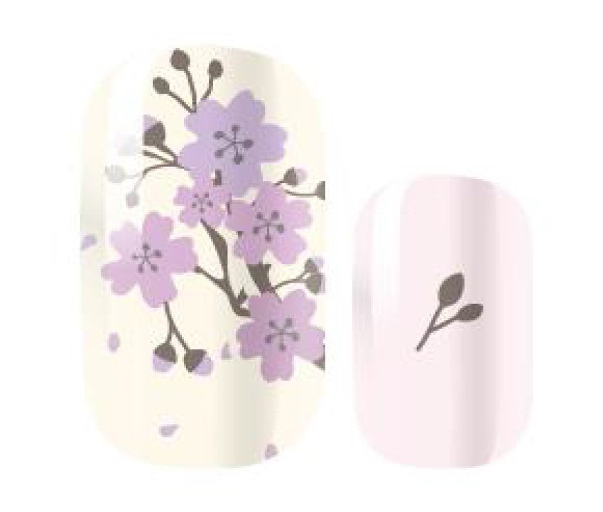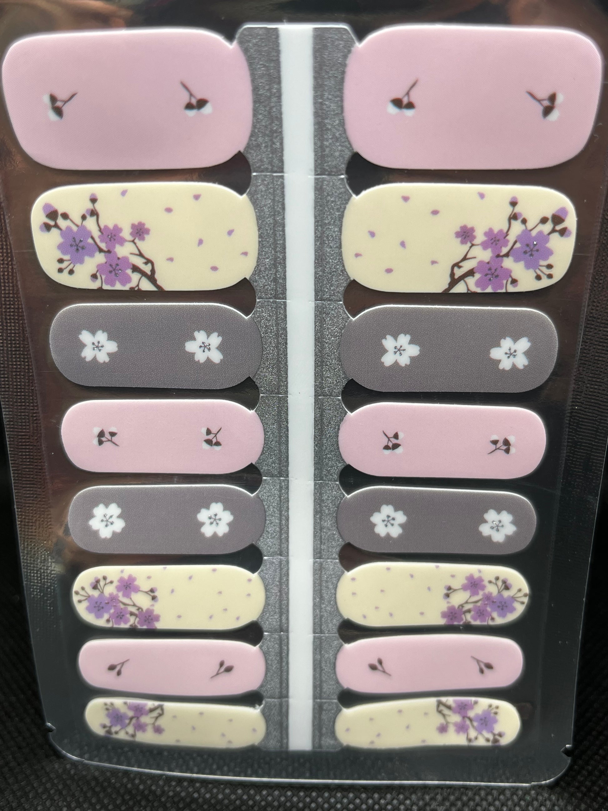 >A delicate design comprised of 6 pale pink wraps, 6 pale yellow wraps and 4 light grey wraps that are accented with tiny cherry blossom branches and little white flowers plus teeny shots of sparkly silver glitter.