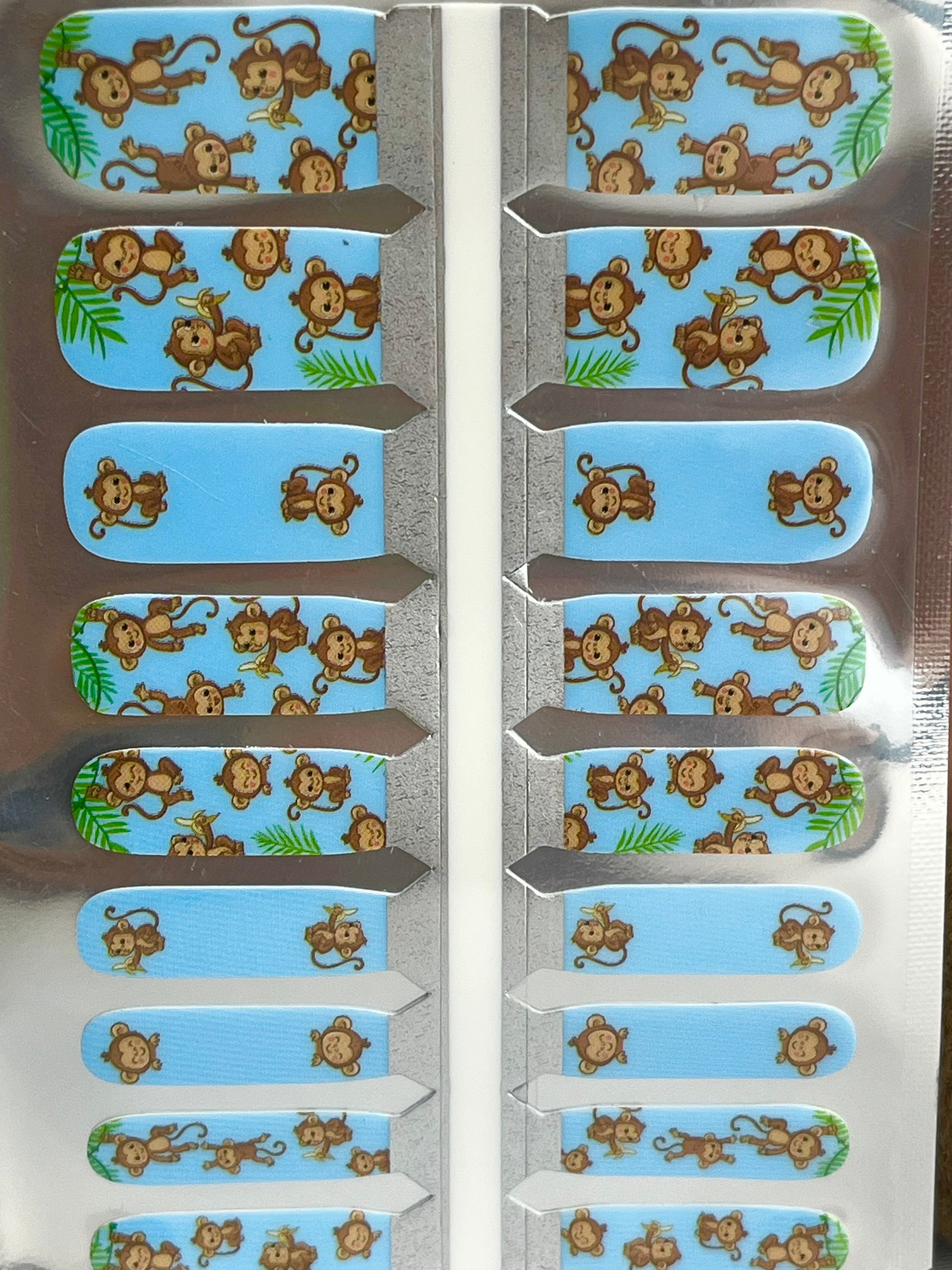 • 16 light blue wraps decorated with happy, smiling tiny monkeys swinging from trees