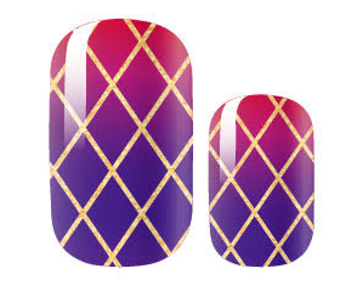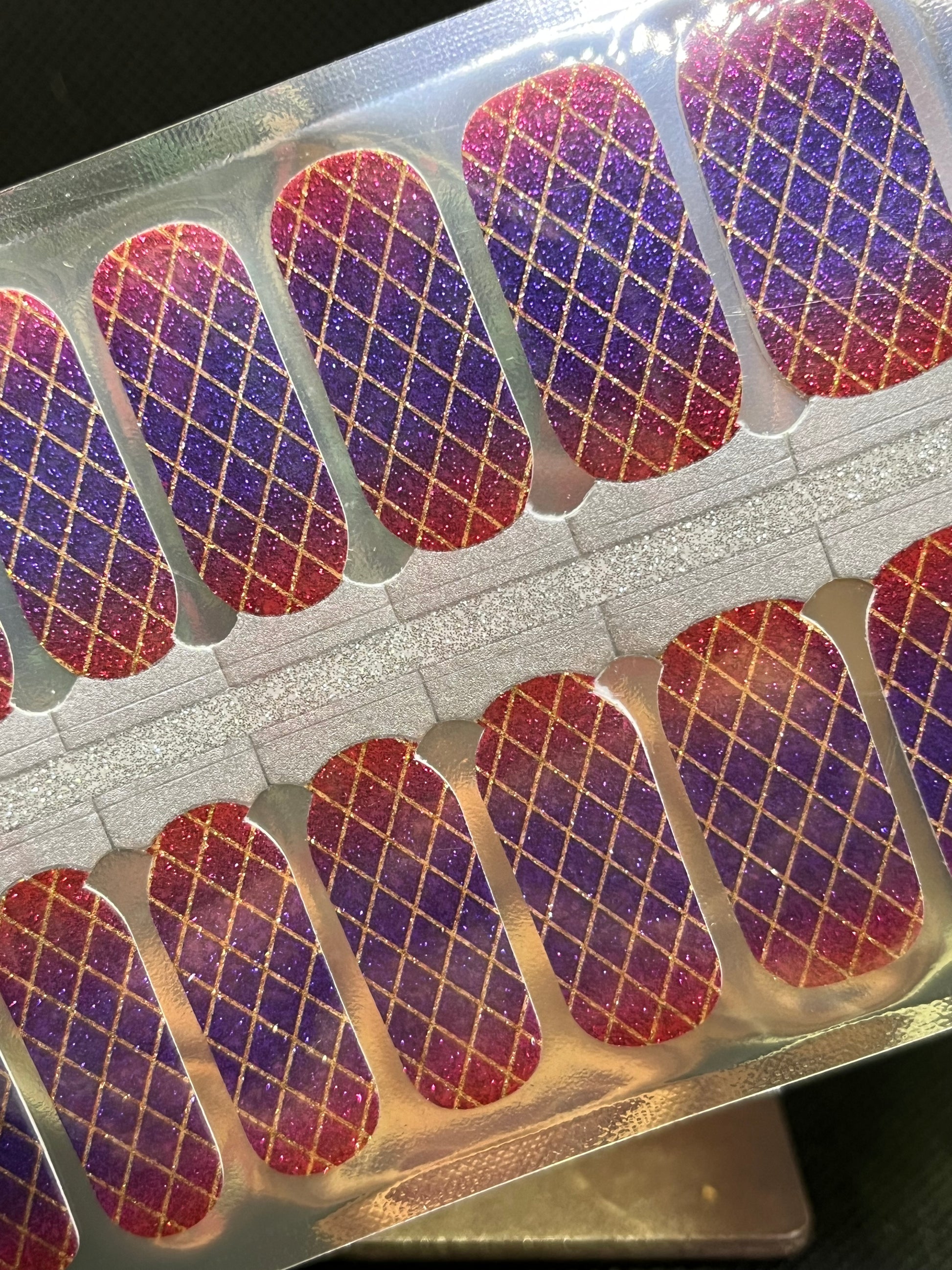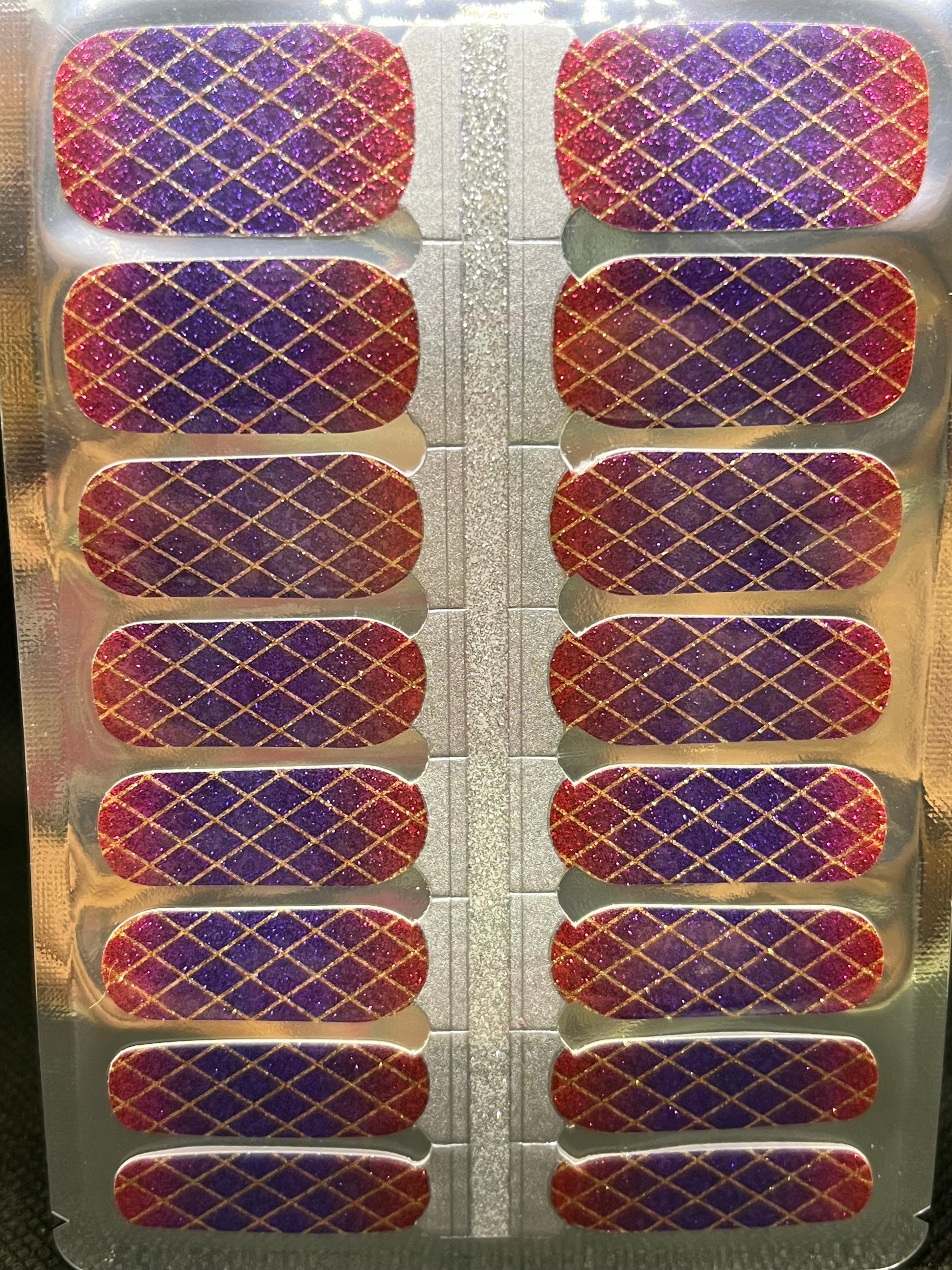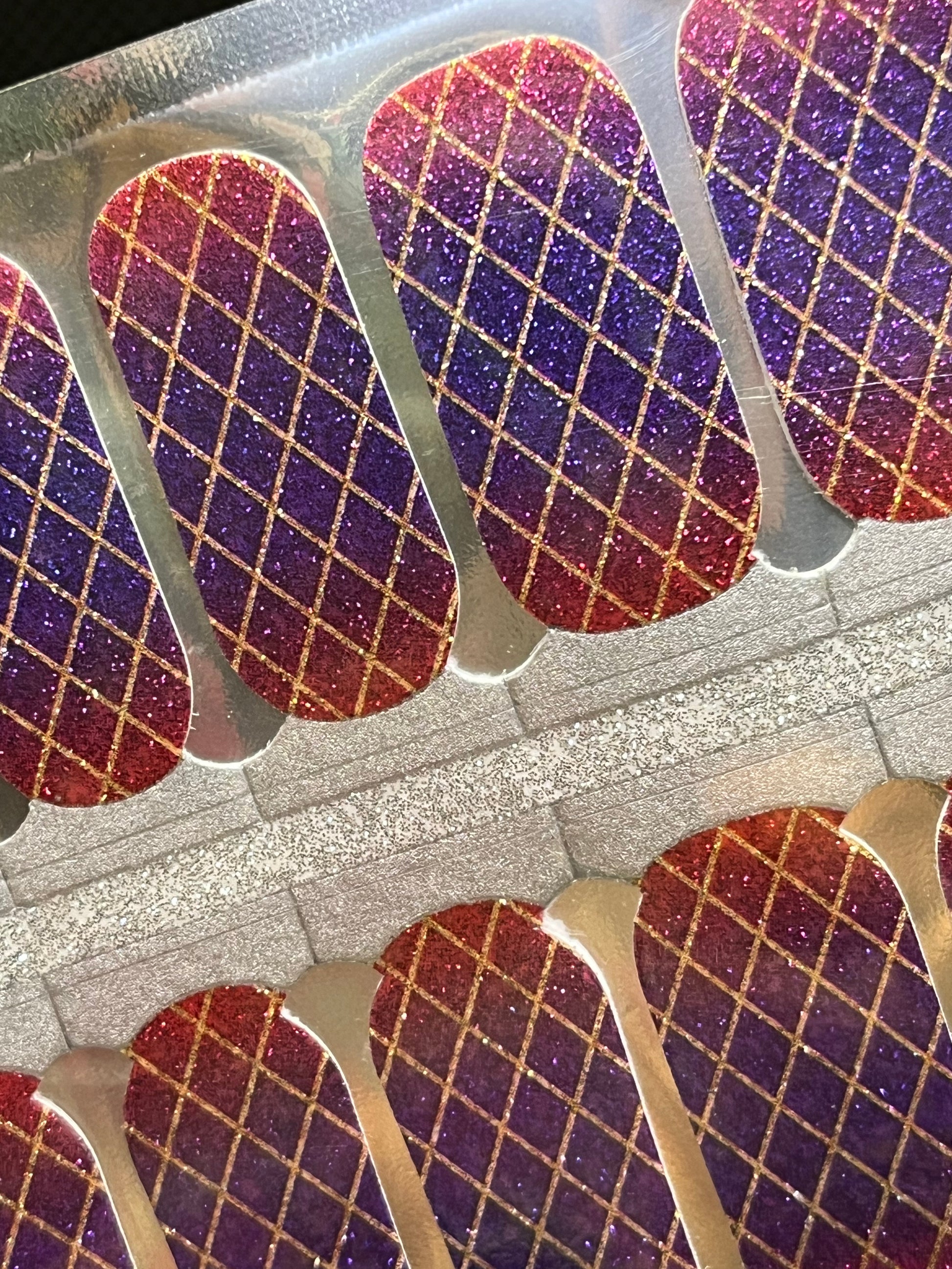 Gold glitter mesh covers bright purple wraps with bright red tips and base.
