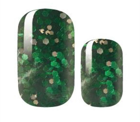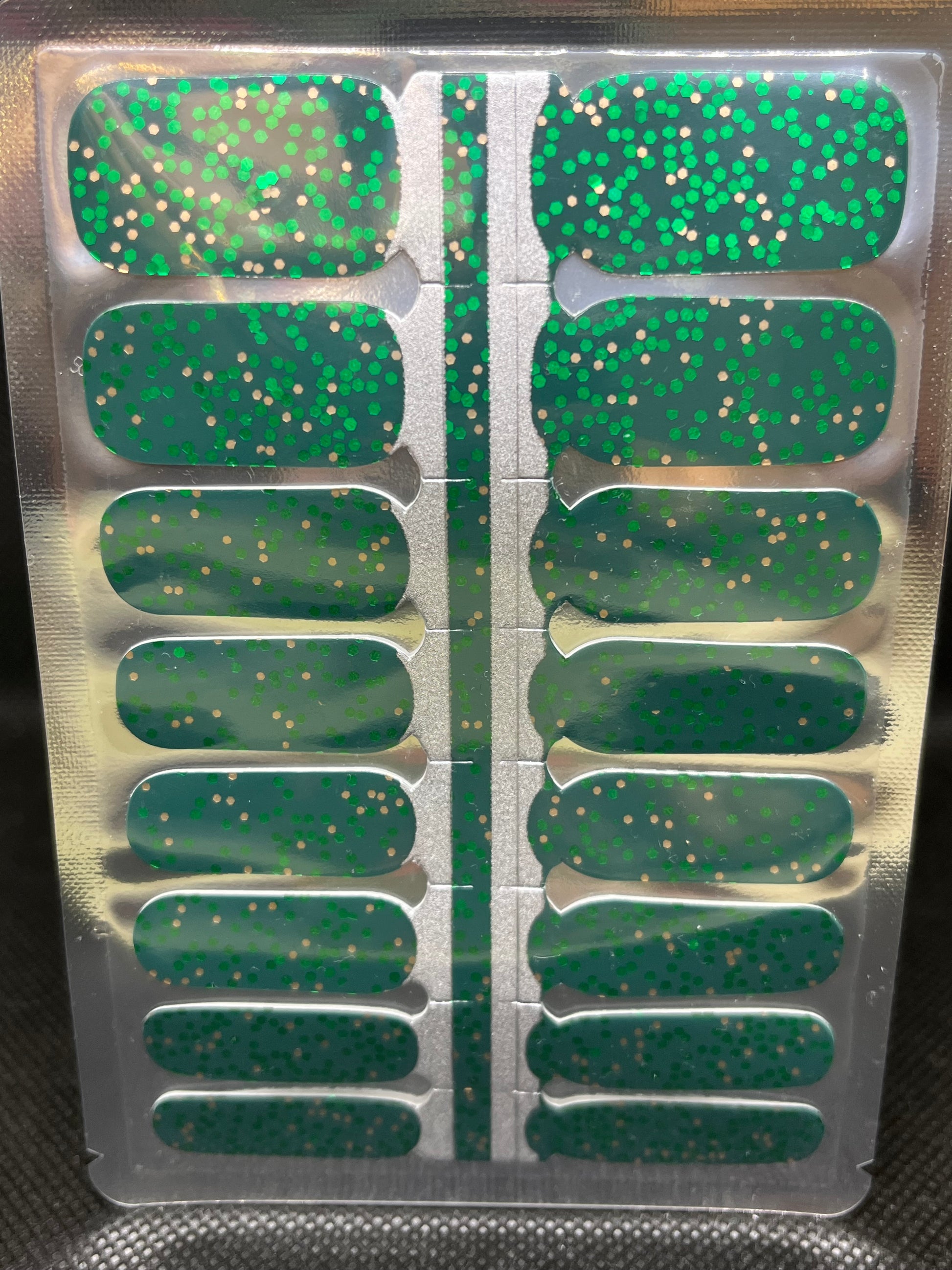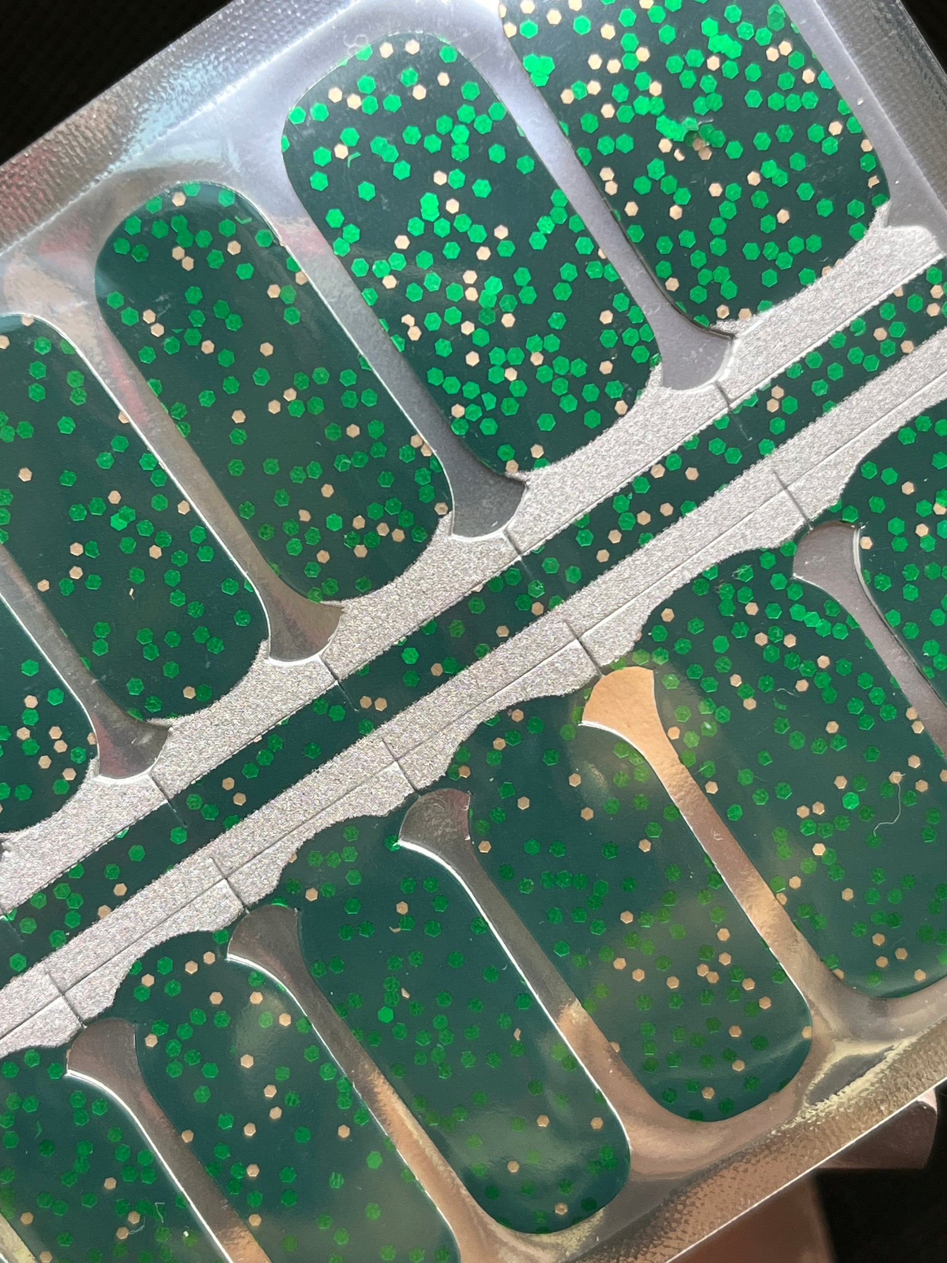 >Dark green background sprinkled with light green and gold sparkles.  A fun, sophisticated design for St. Patrick's Day.