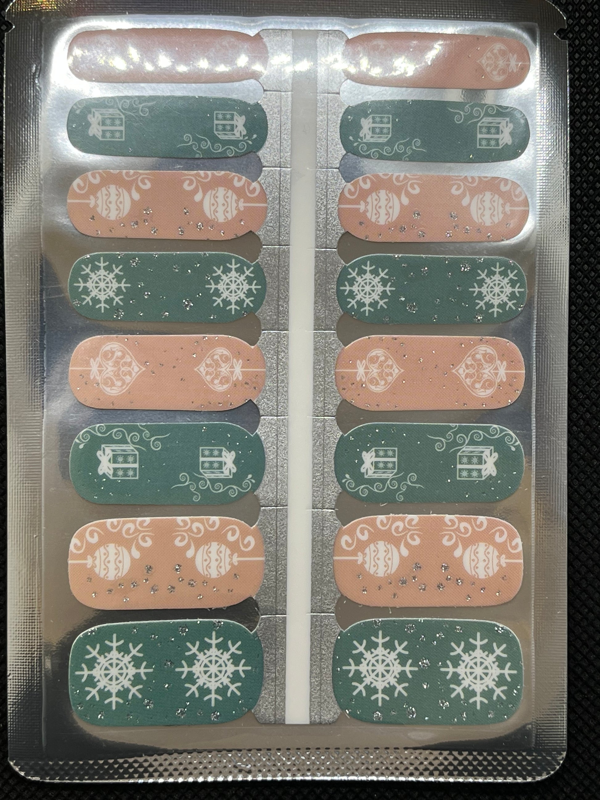 A mix of soft dusty pink and green wraps decorated with Christmas ornaments and sprinkled with silver glitter.  Four pink and four green wraps
