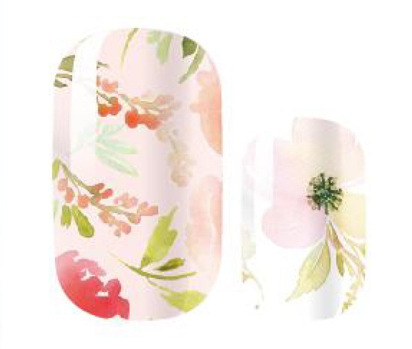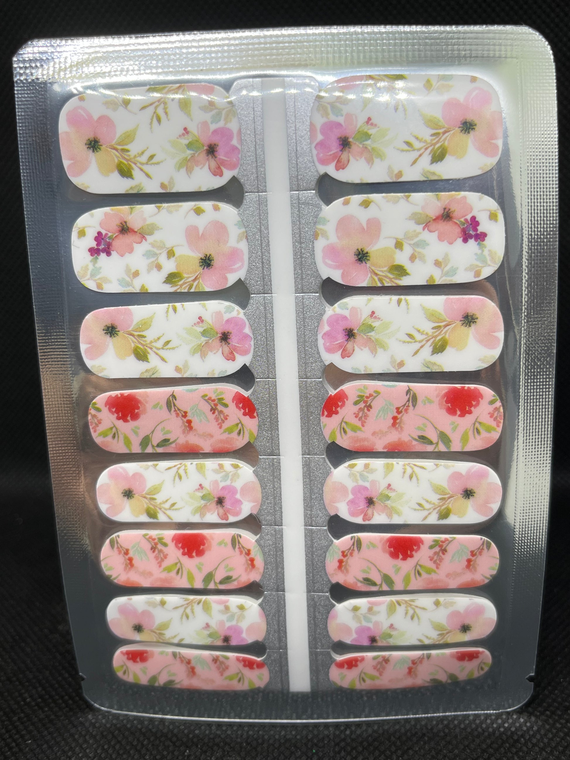 >Ten white and 6 light dusty pink wraps covered by sprays of spring flowers of pink and red. Delicate watercolour design.