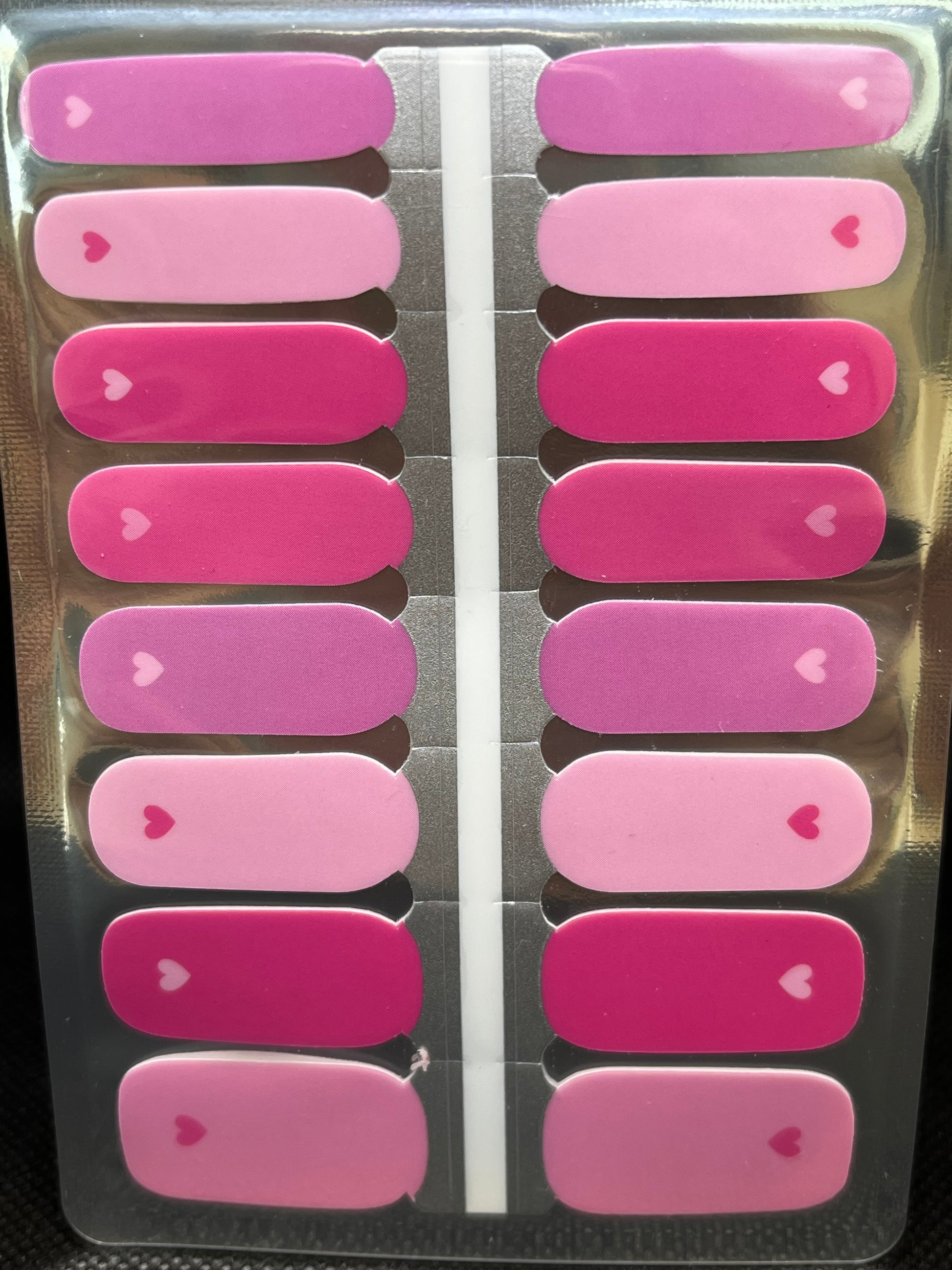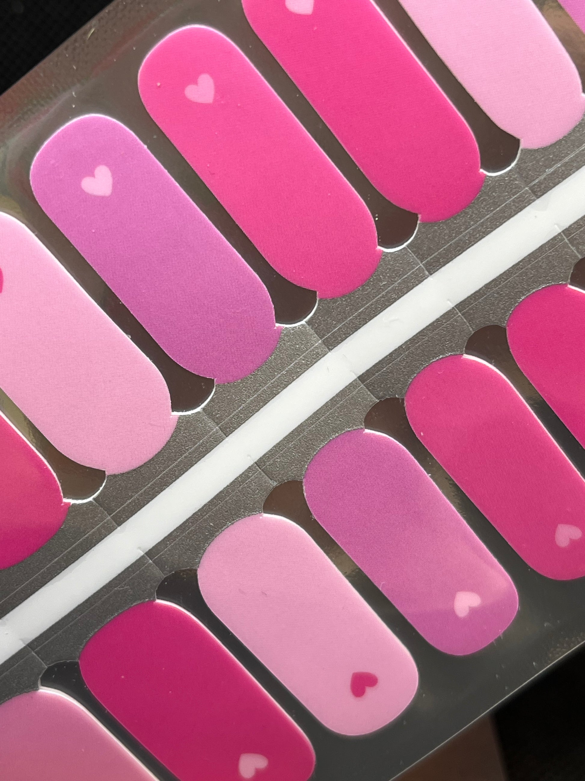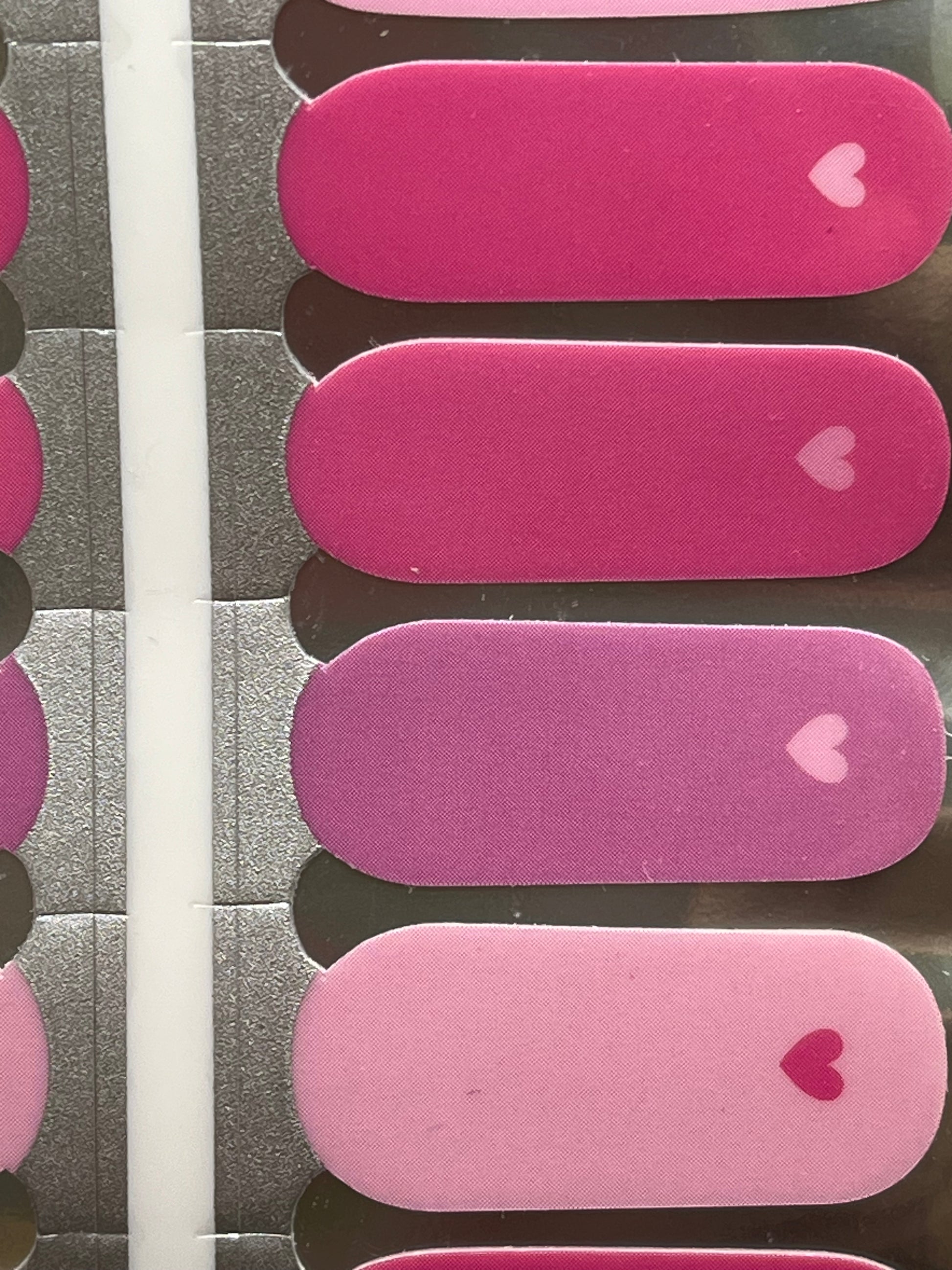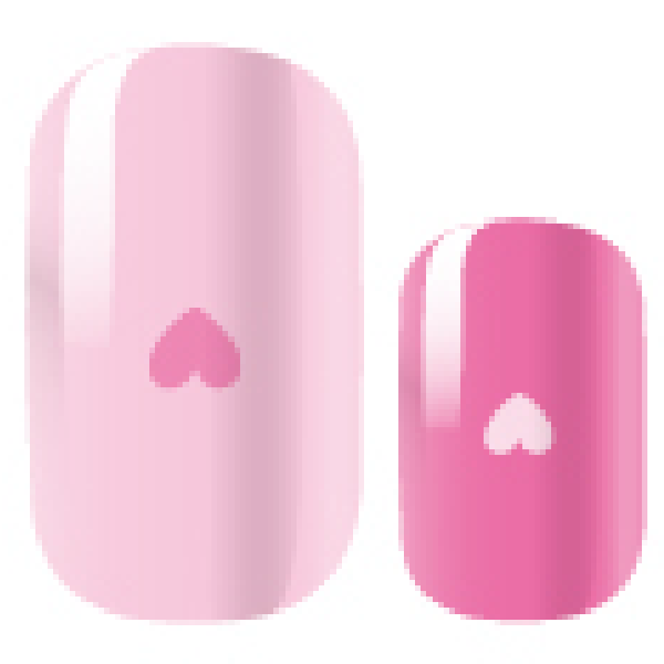 >Four shades of pink decorate these solid-coloured wraps, each with a tiny heart at the nail base in a coordinating pink shade.
