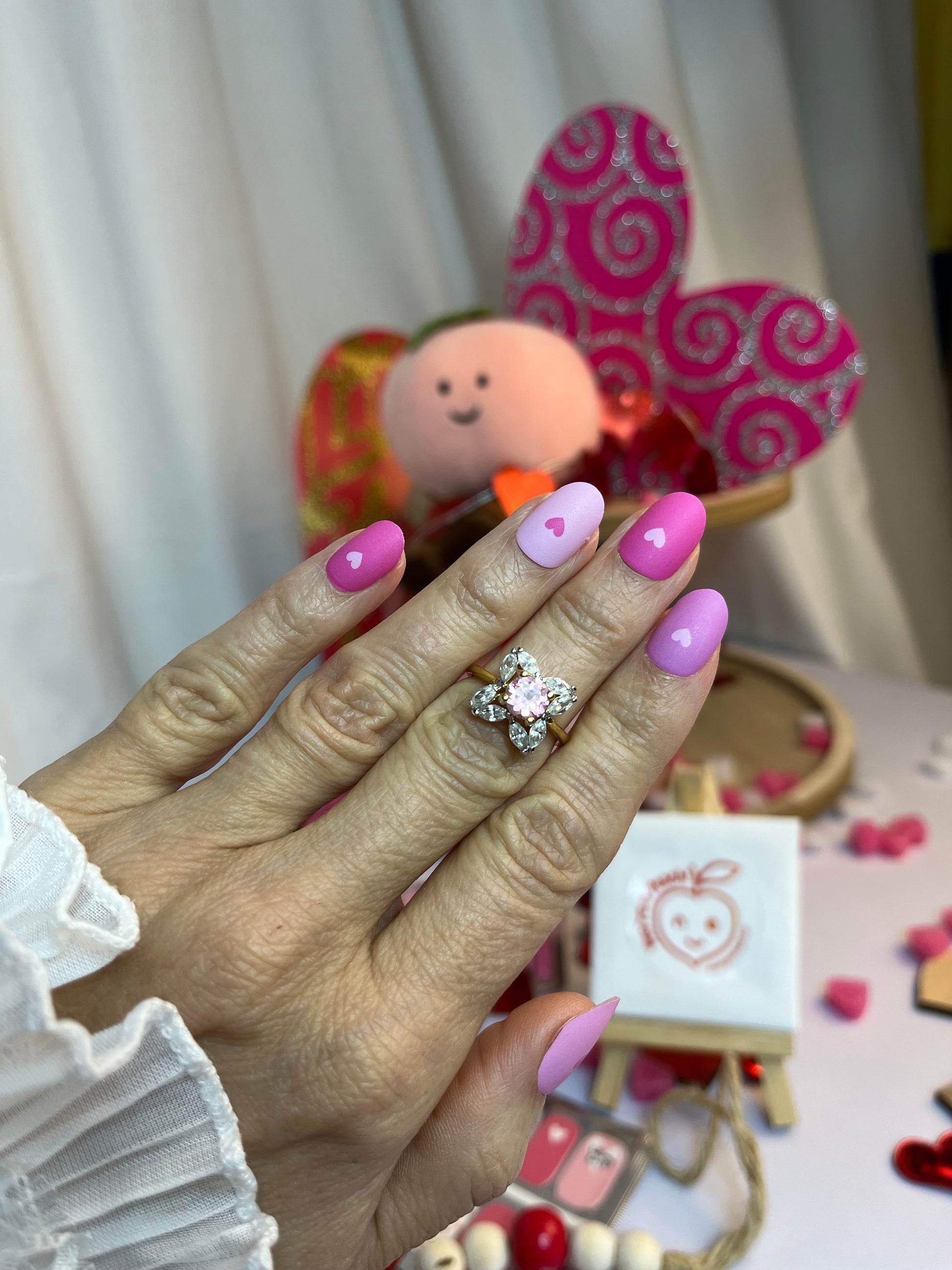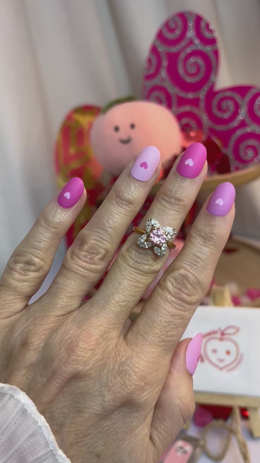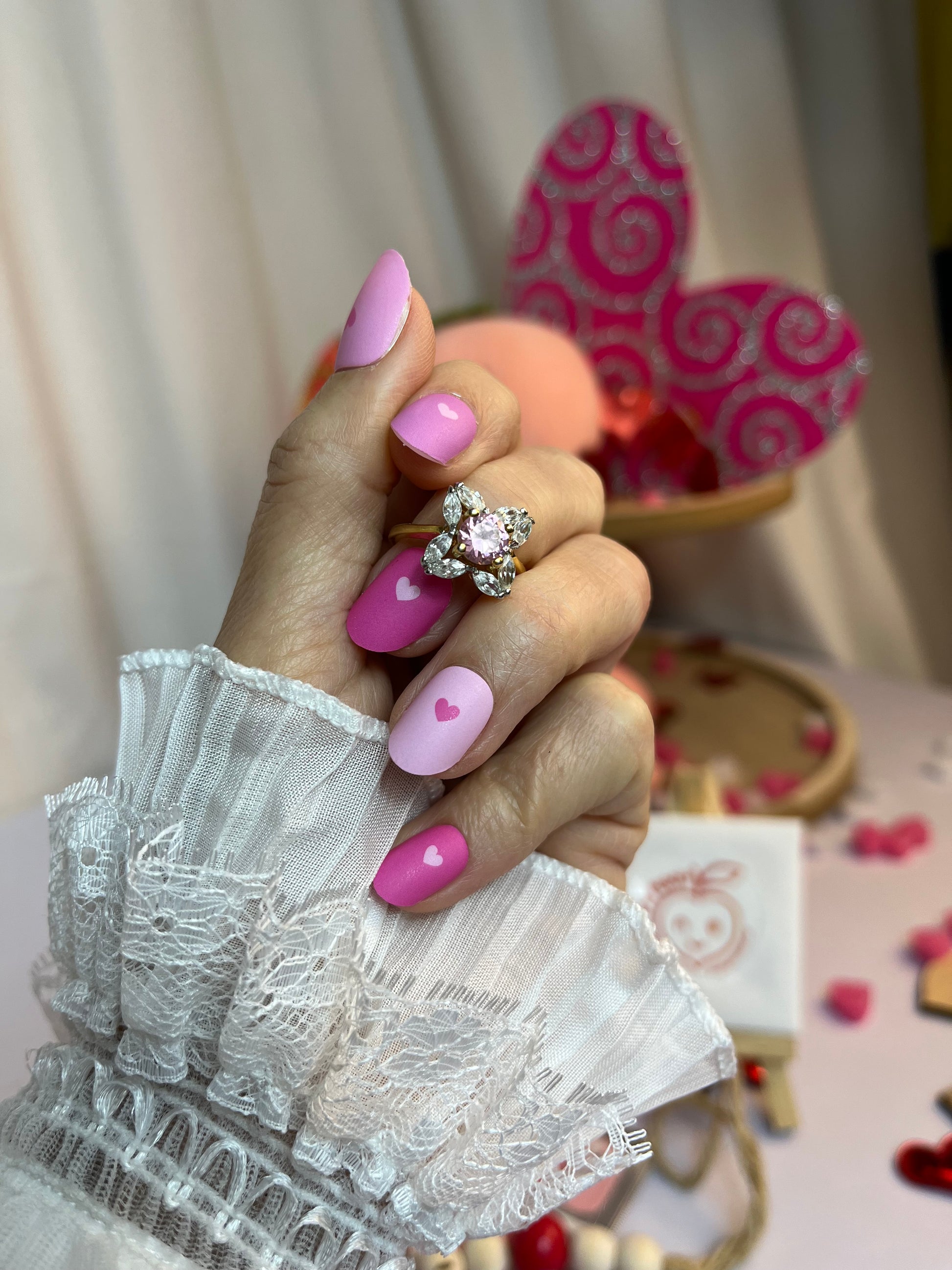>Four shades of pink decorate these solid-coloured wraps, each with a tiny heart at the nail base in a coordinating pink shade.