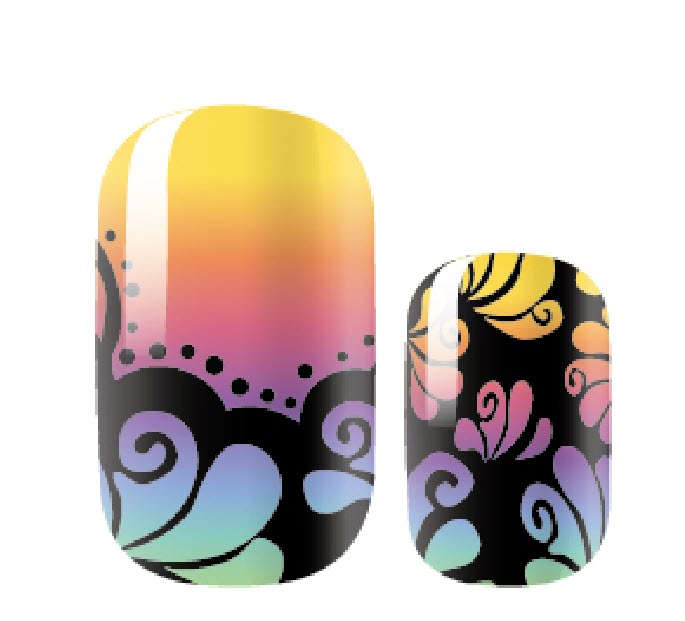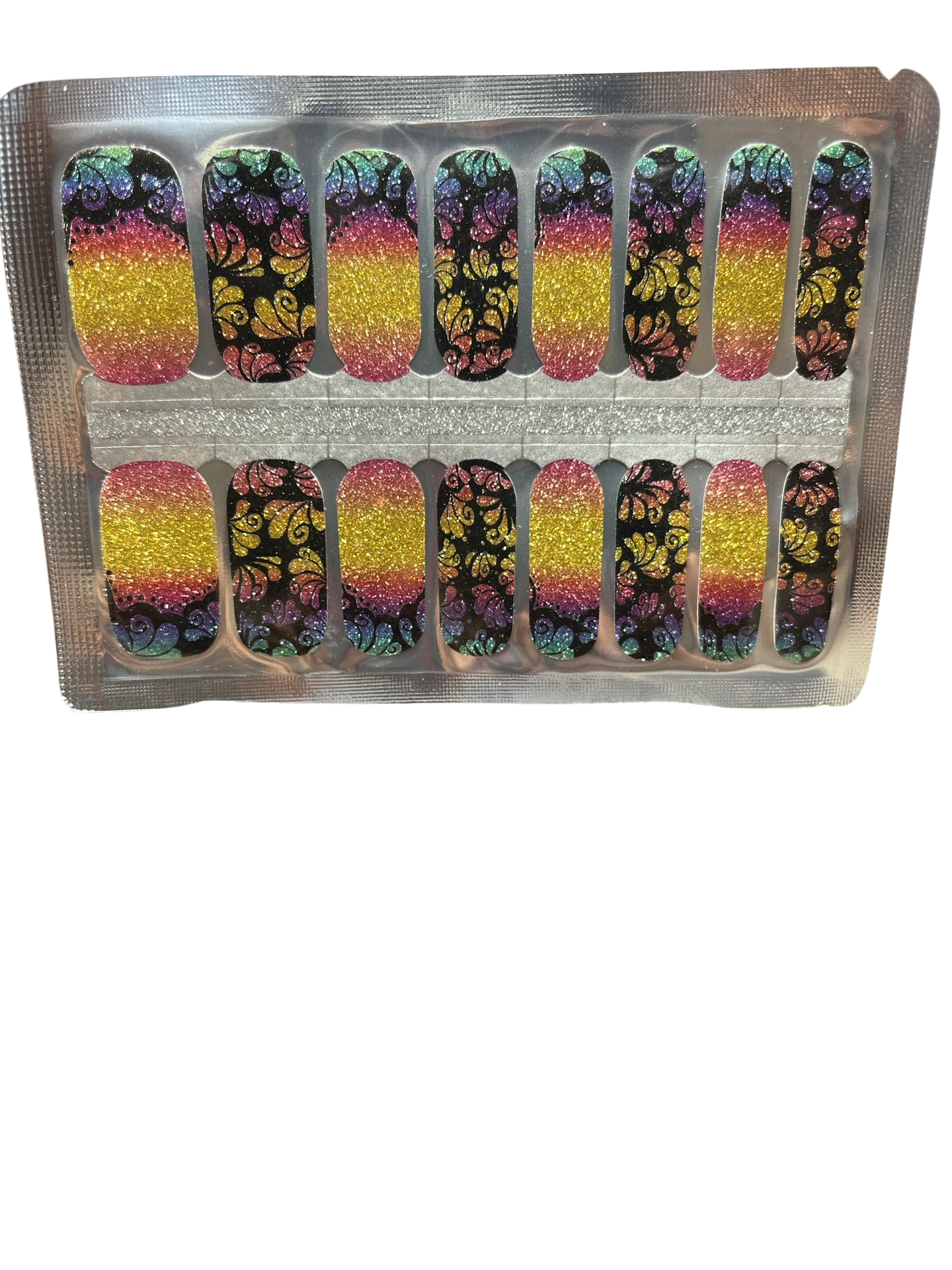 Super shimmery, multi colour rainbow gradient w black background and floral