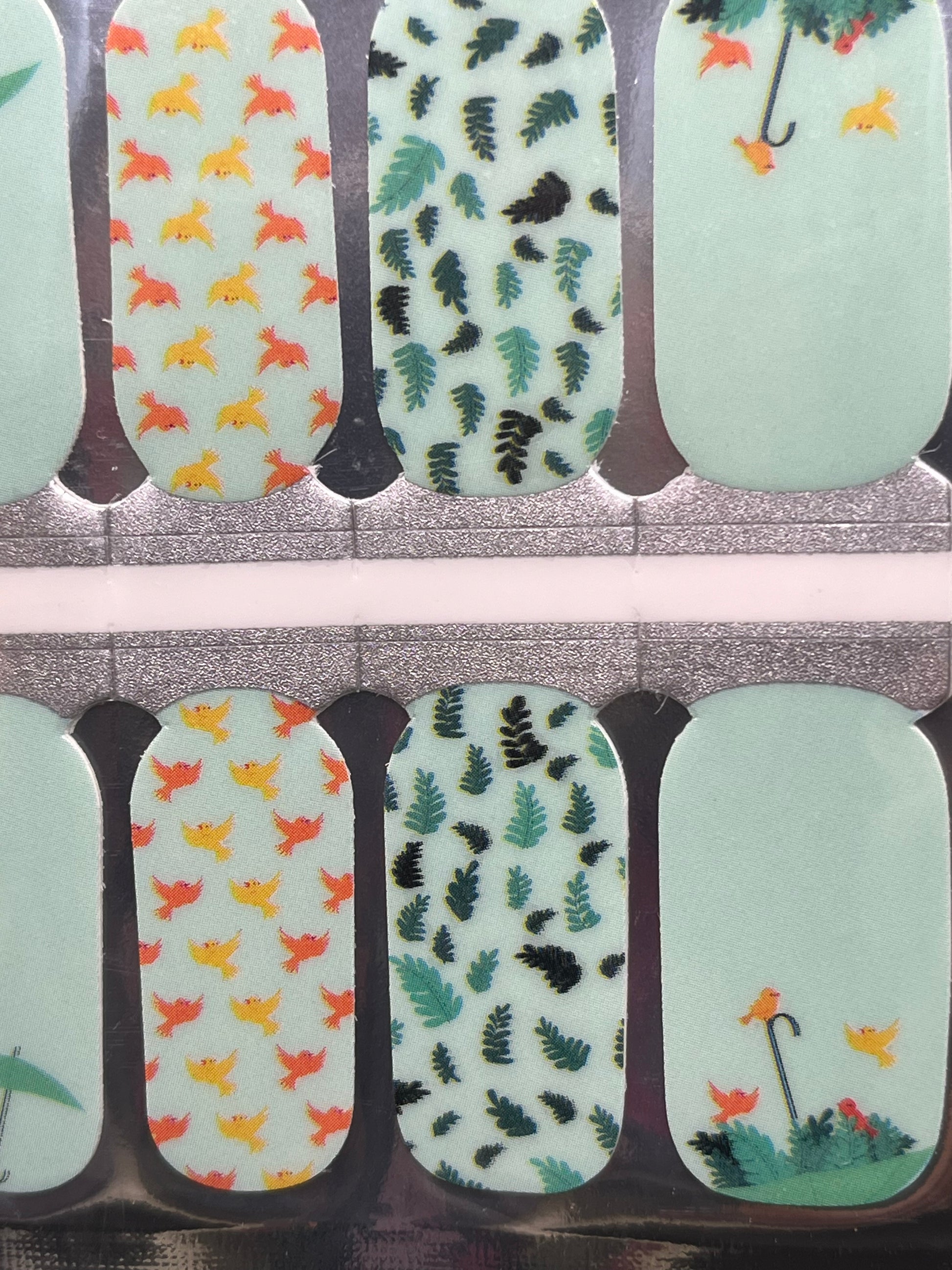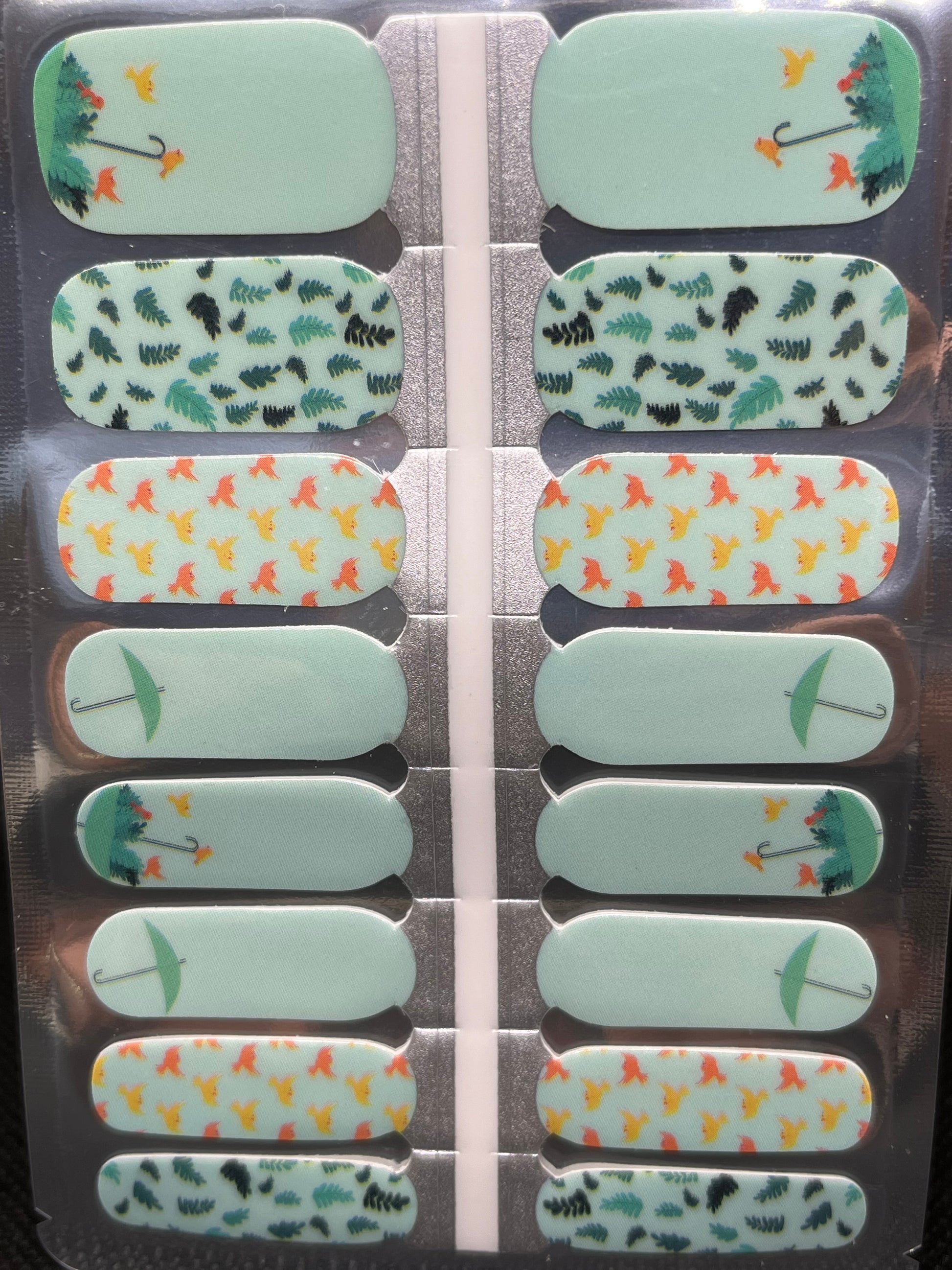 >Light turquoise background with little green leaves covering 4 wraps, tiny yellow & orange birds covering 4 wraps, 4 wraps featuring tiny umbrellas and 4 wraps with a combo of all - umbrella upturned on a bed of leaves and little birds flitting around.