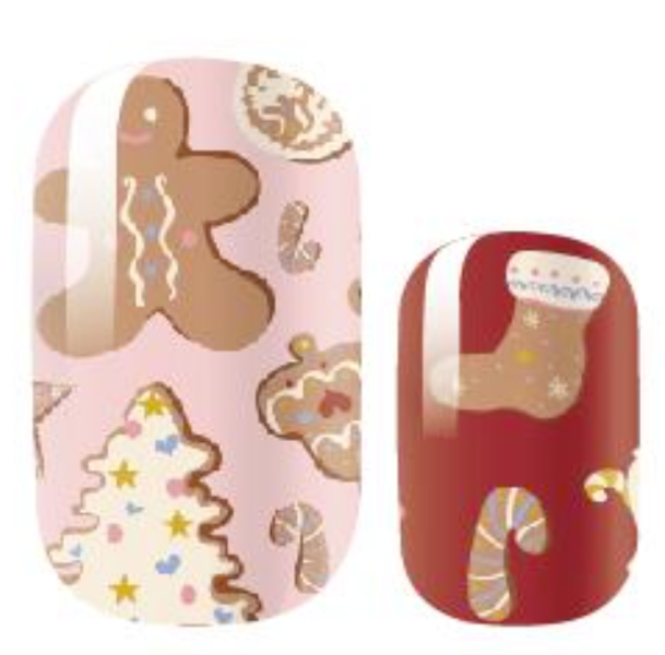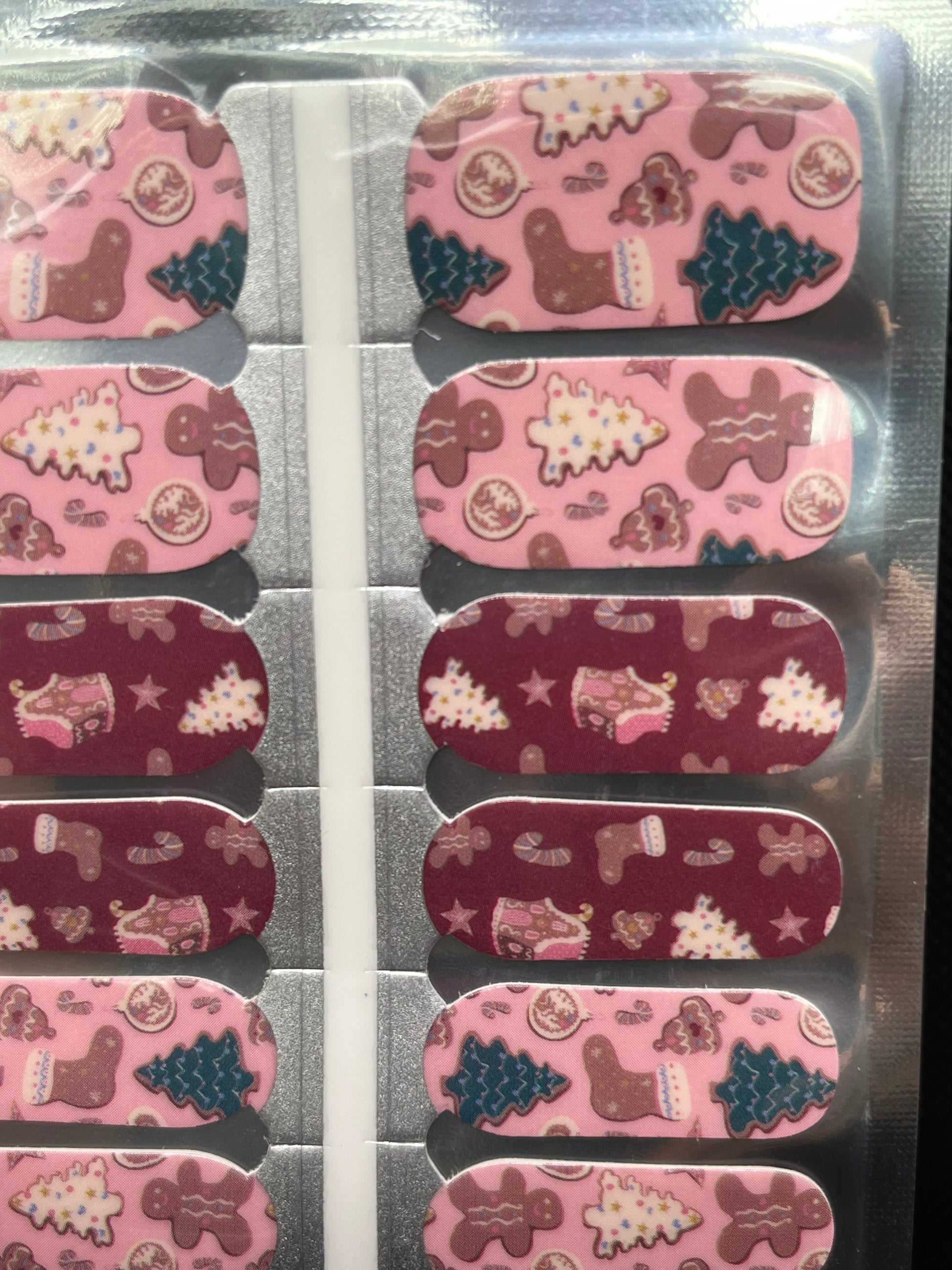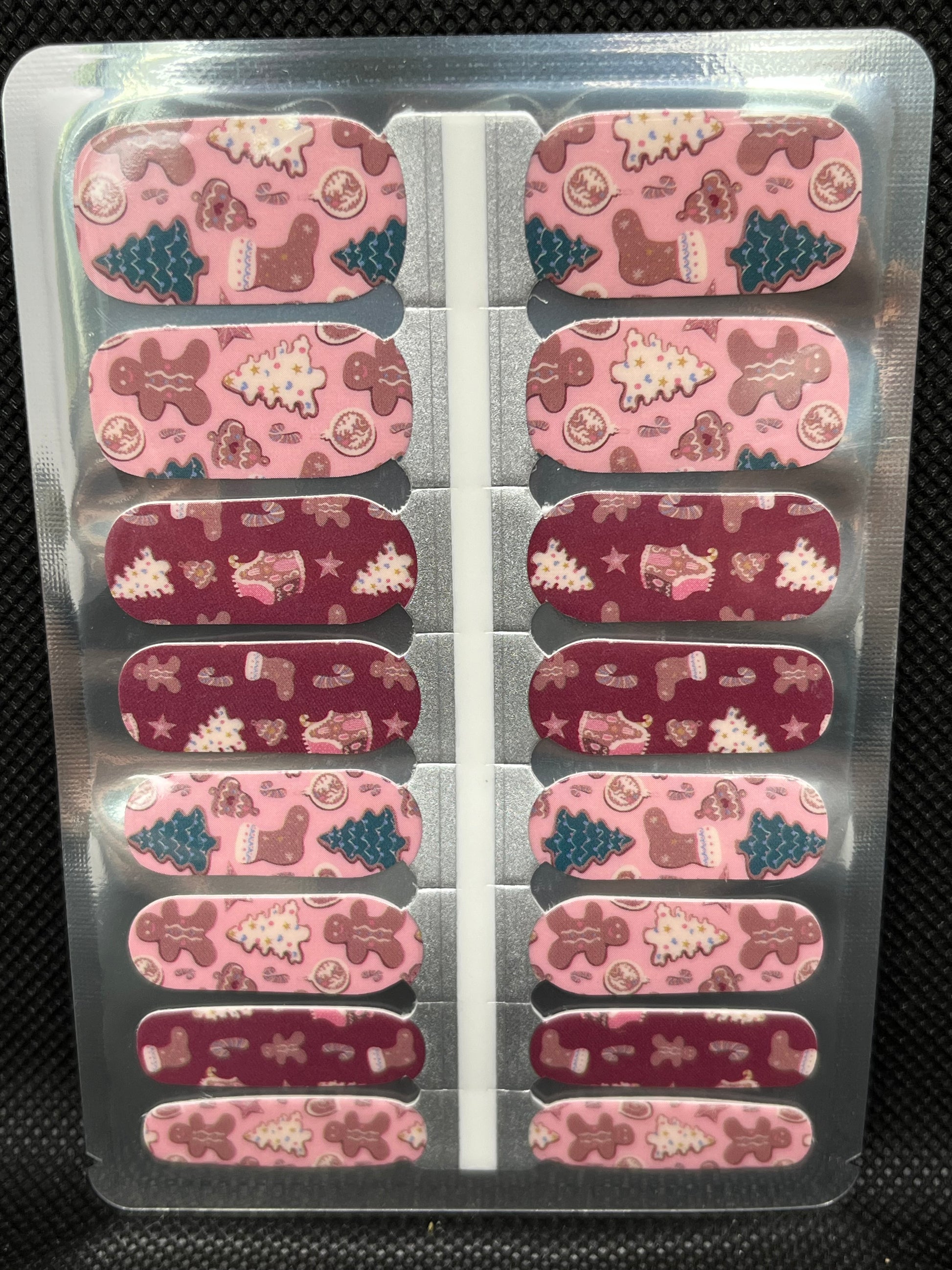 >A mix of Christmas cookies and gingerbread houses cover the pink or plum backgrounds of this set of wraps - 10 with a pink background and 6 with a plum coloured background