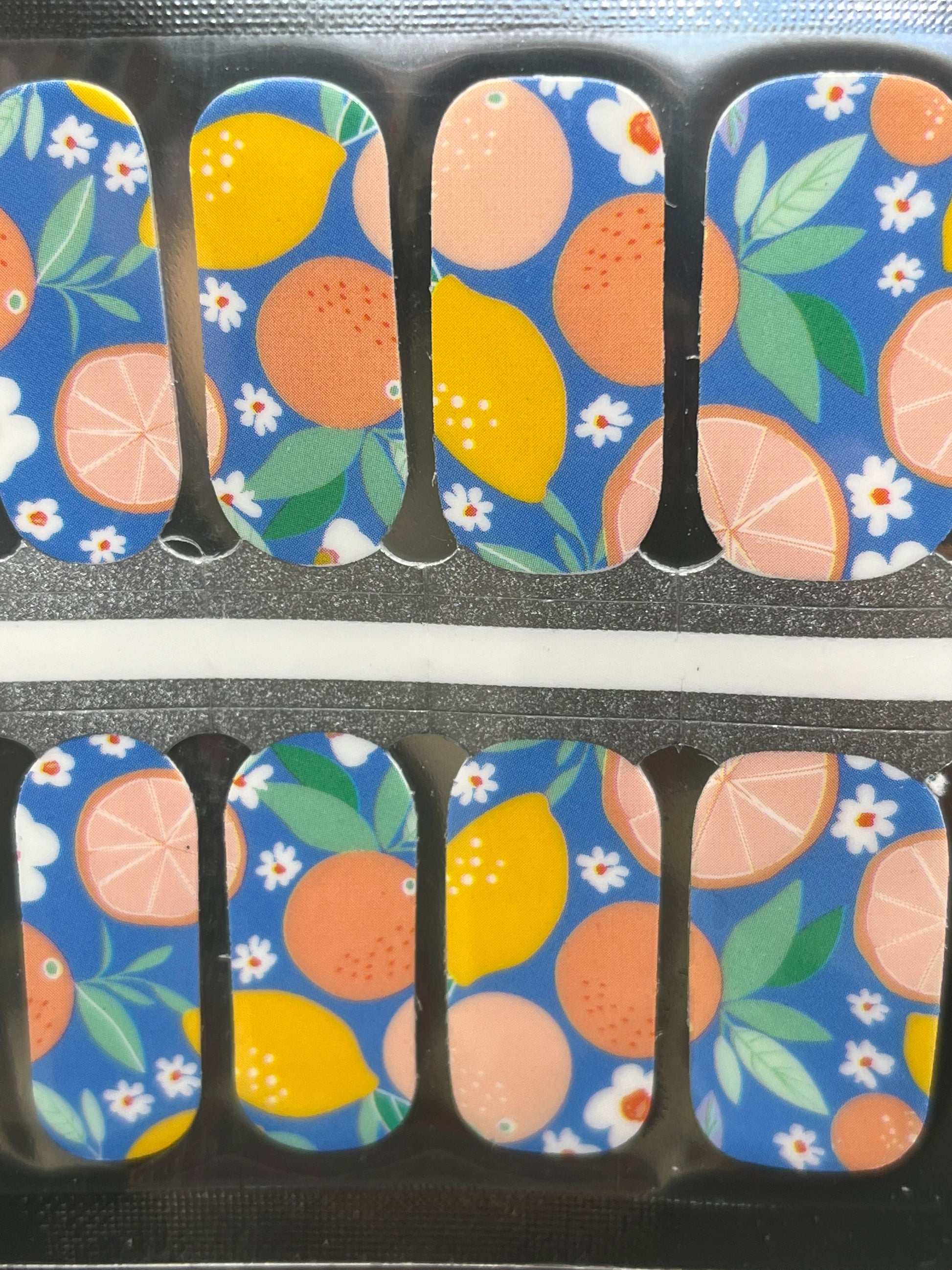 >Lemons, oranges, slices of pink grapefruit and citrus blossoms of white with orange centres are scattered over a light blue background.