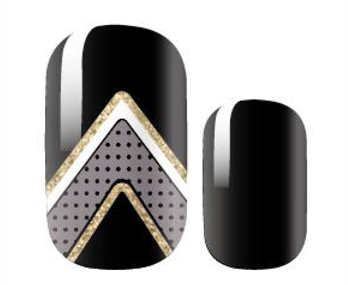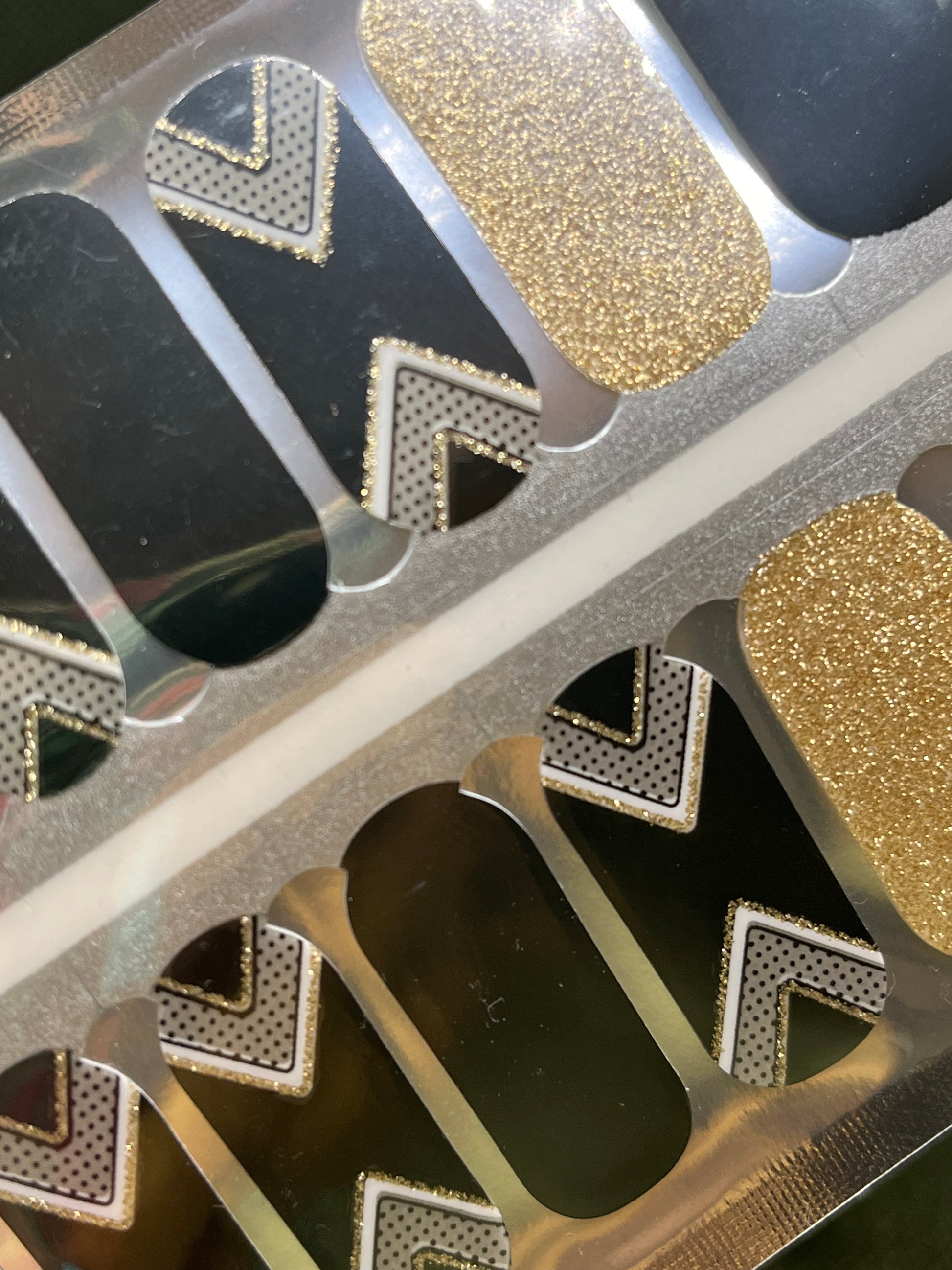 >Drama! Six solid black wraps, four bright gold glitter wraps and six wraps featuring a dramatic art deco design of white, gold and grey on a black background.