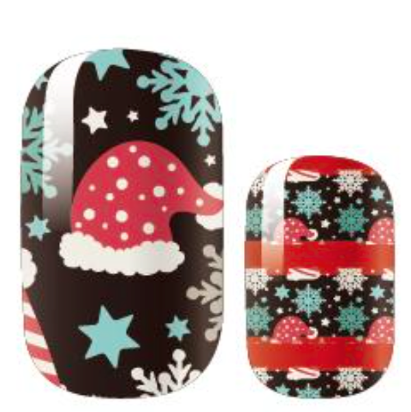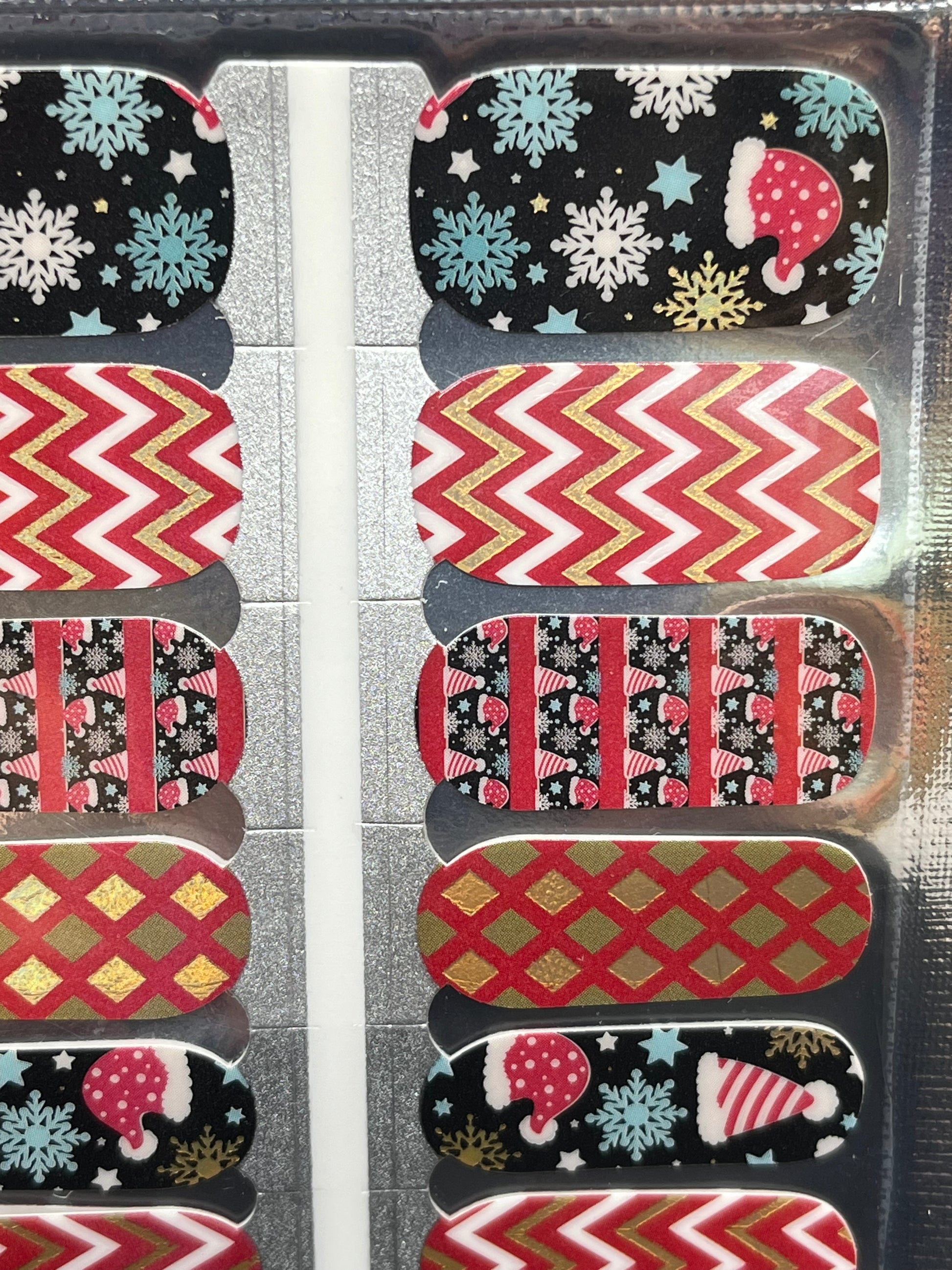 >A fun design that features a mix of zigzags, diamonds, snowflakes and Santa hats on red and black backgrounds.  Is it the nail wrap equivalent of an Ugly Christmas Sweater?  Maybe it is!  Super fun!!