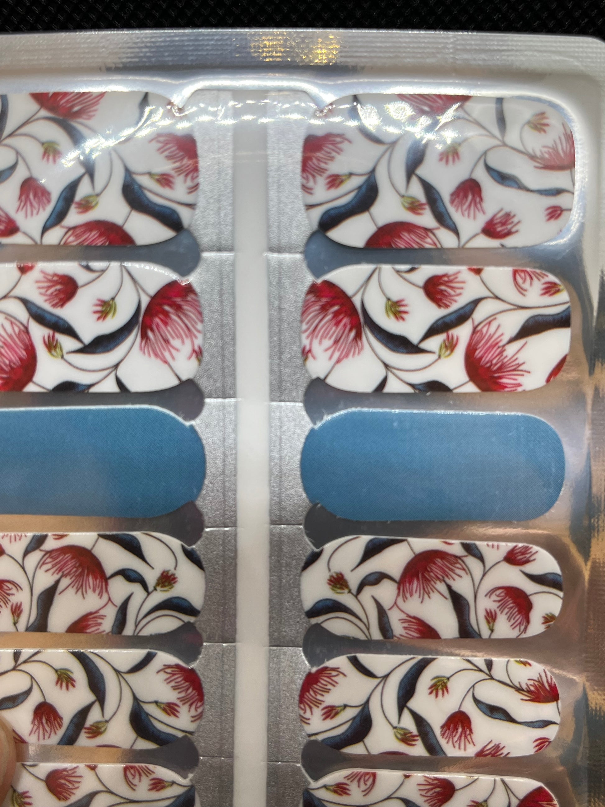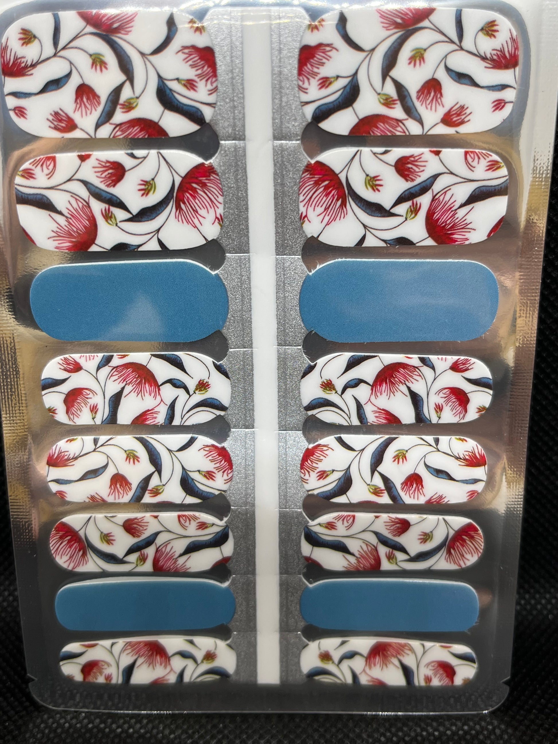 >Fun design featuring 12 wraps with garlands of fluffy red flowers and blue-green leaves on a white background plus 4 with accent wraps of blue.