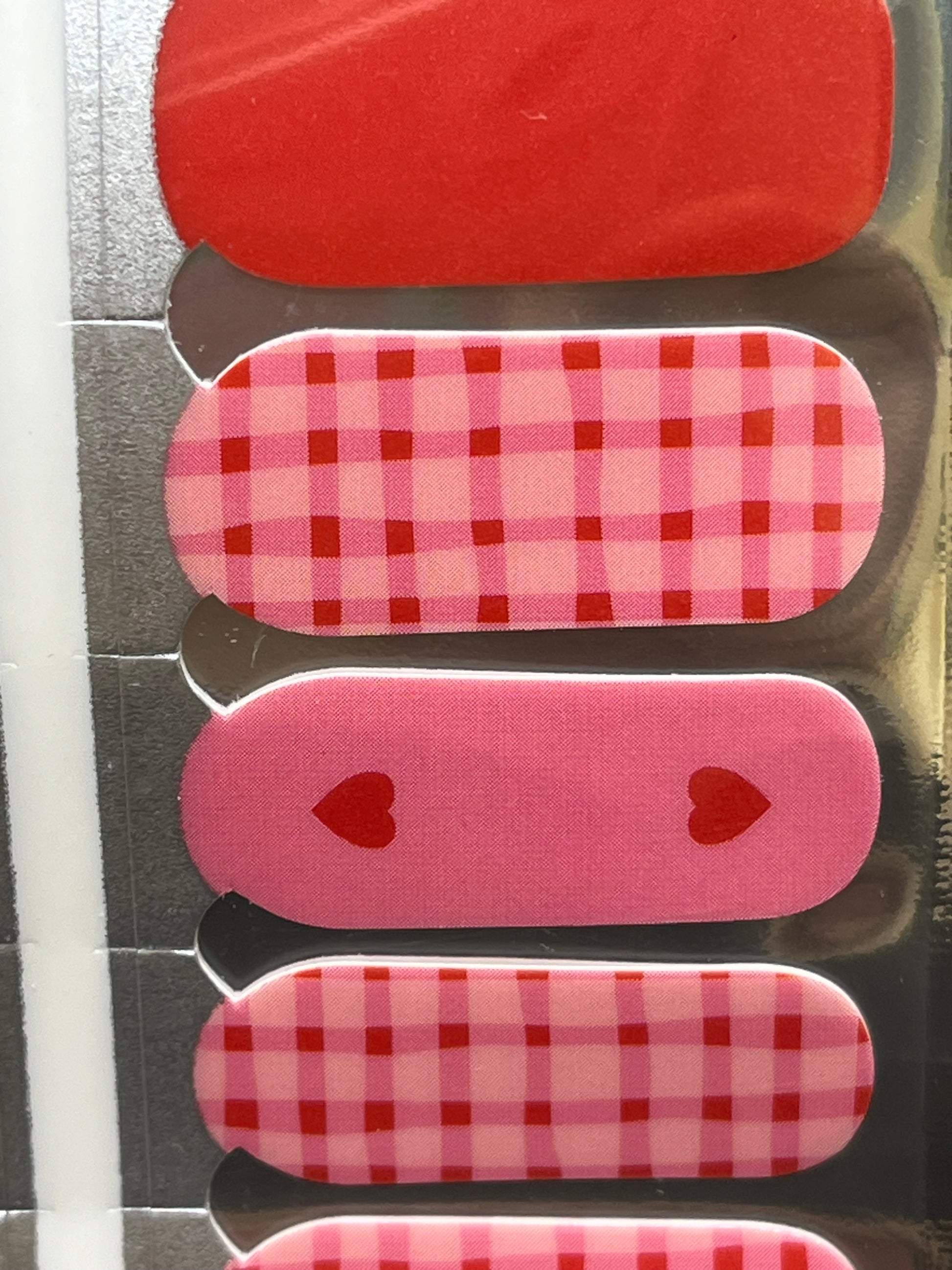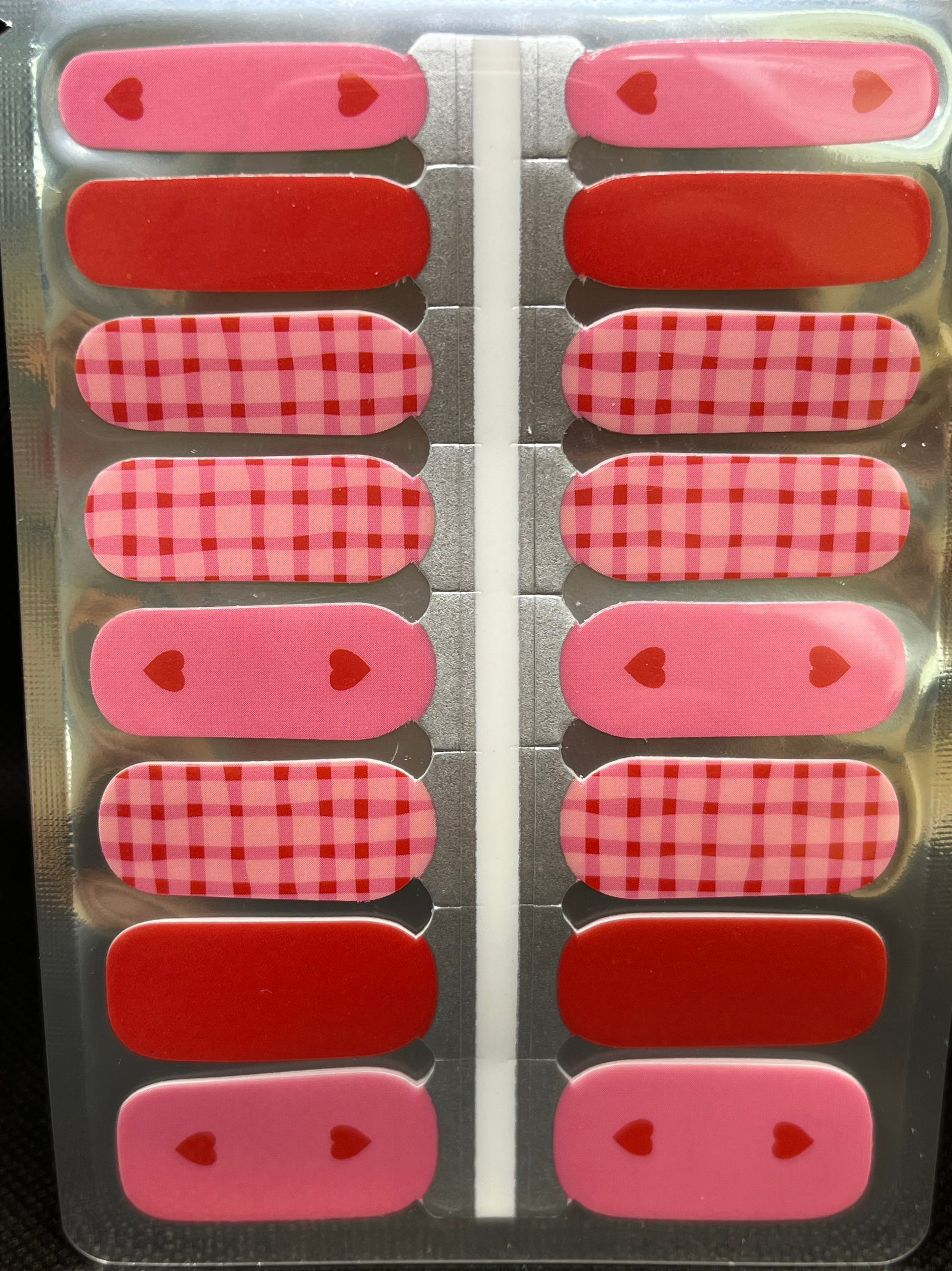 > 4 solid red wraps, six red & pink plaid and six pink with a small red heart at each end.