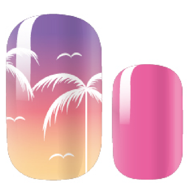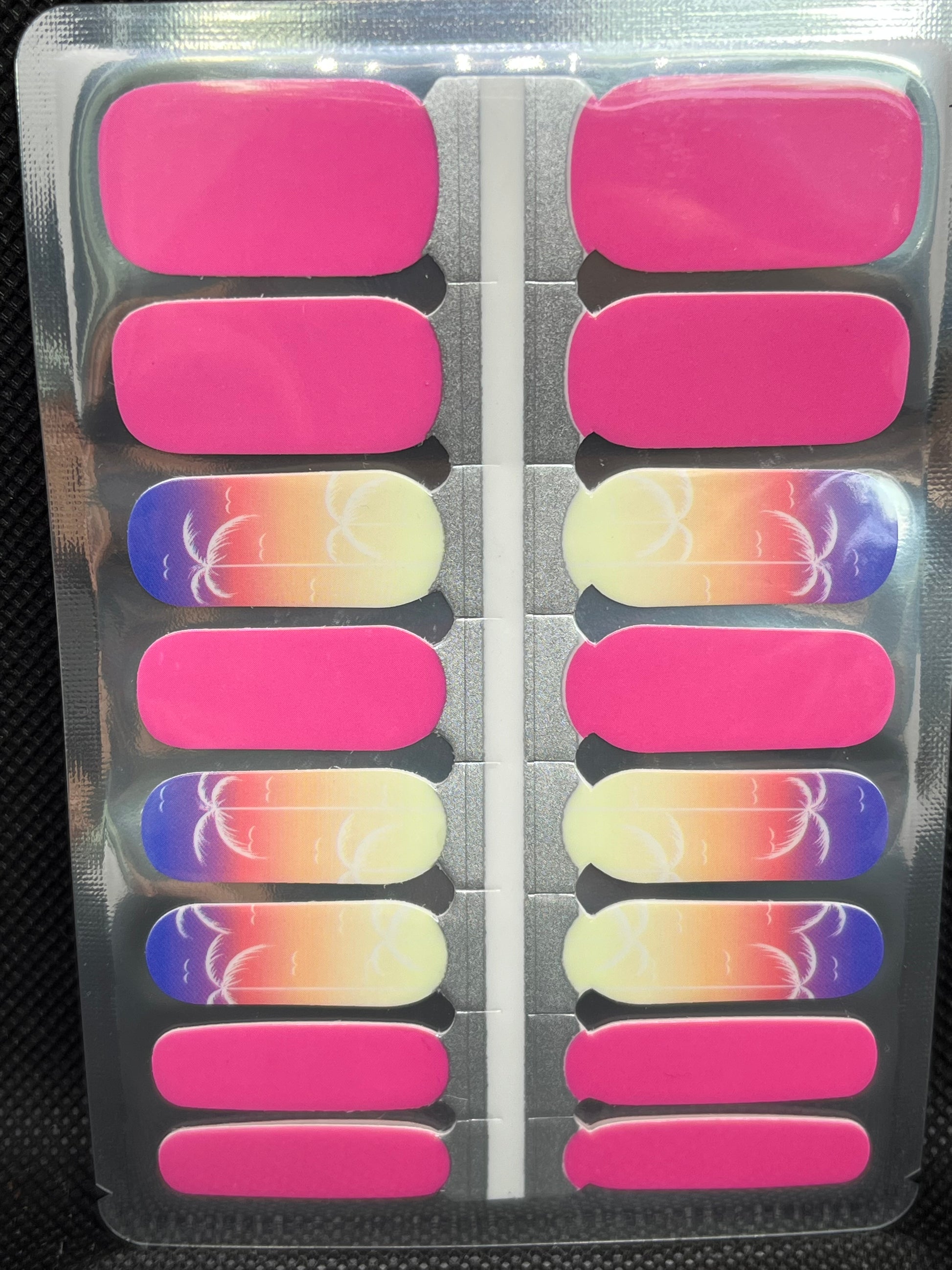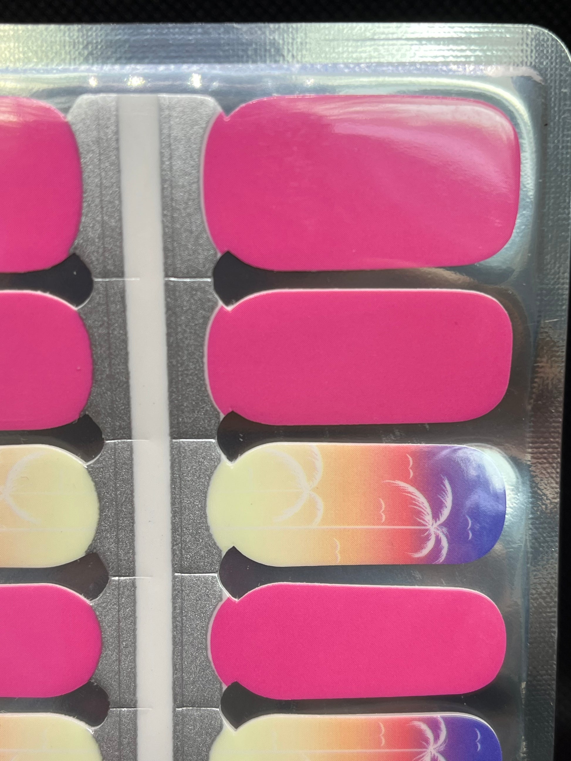 >10 bright, hot pink wraps + 6 pale yellow to purple gradient wraps with white palm trees and birds