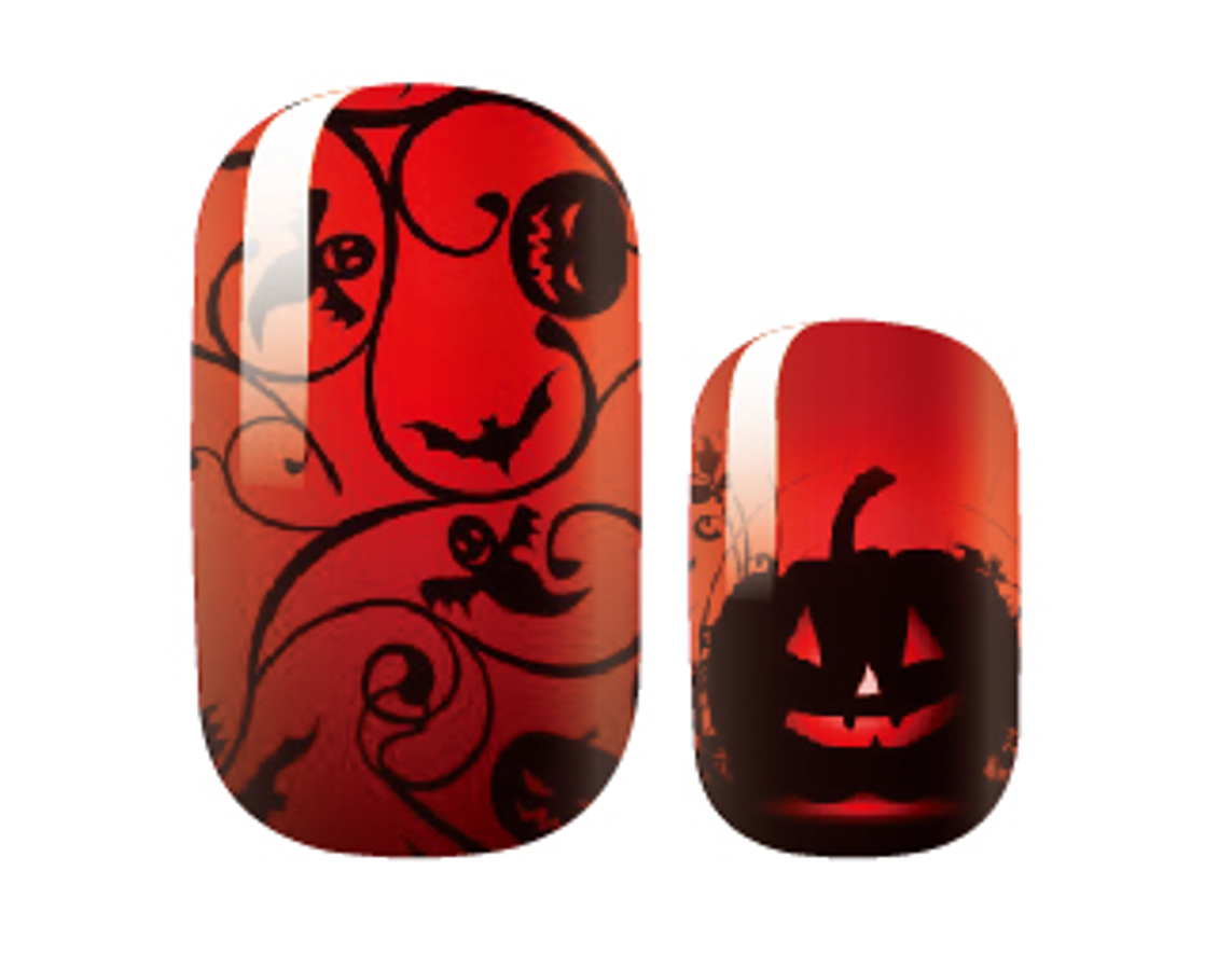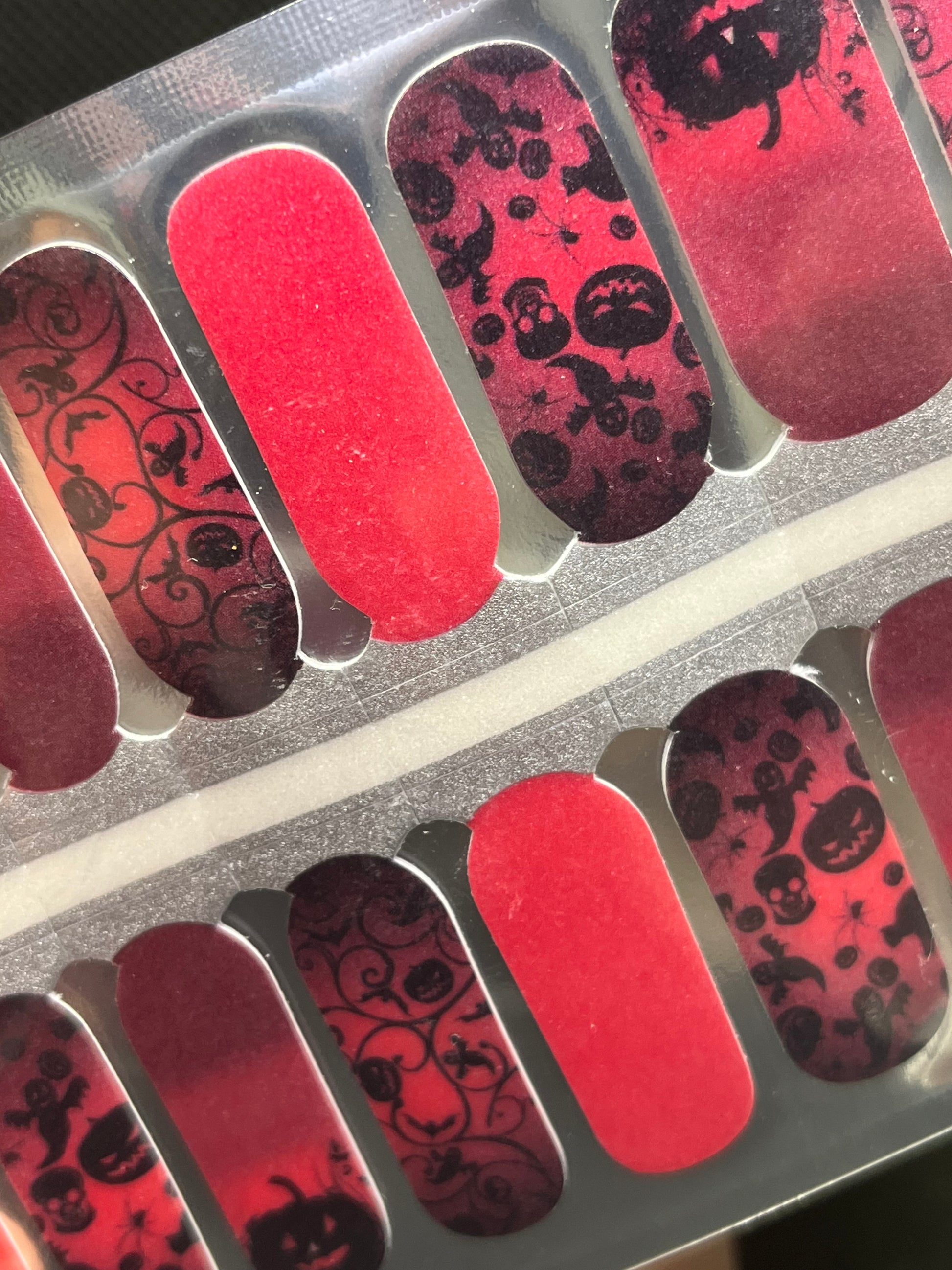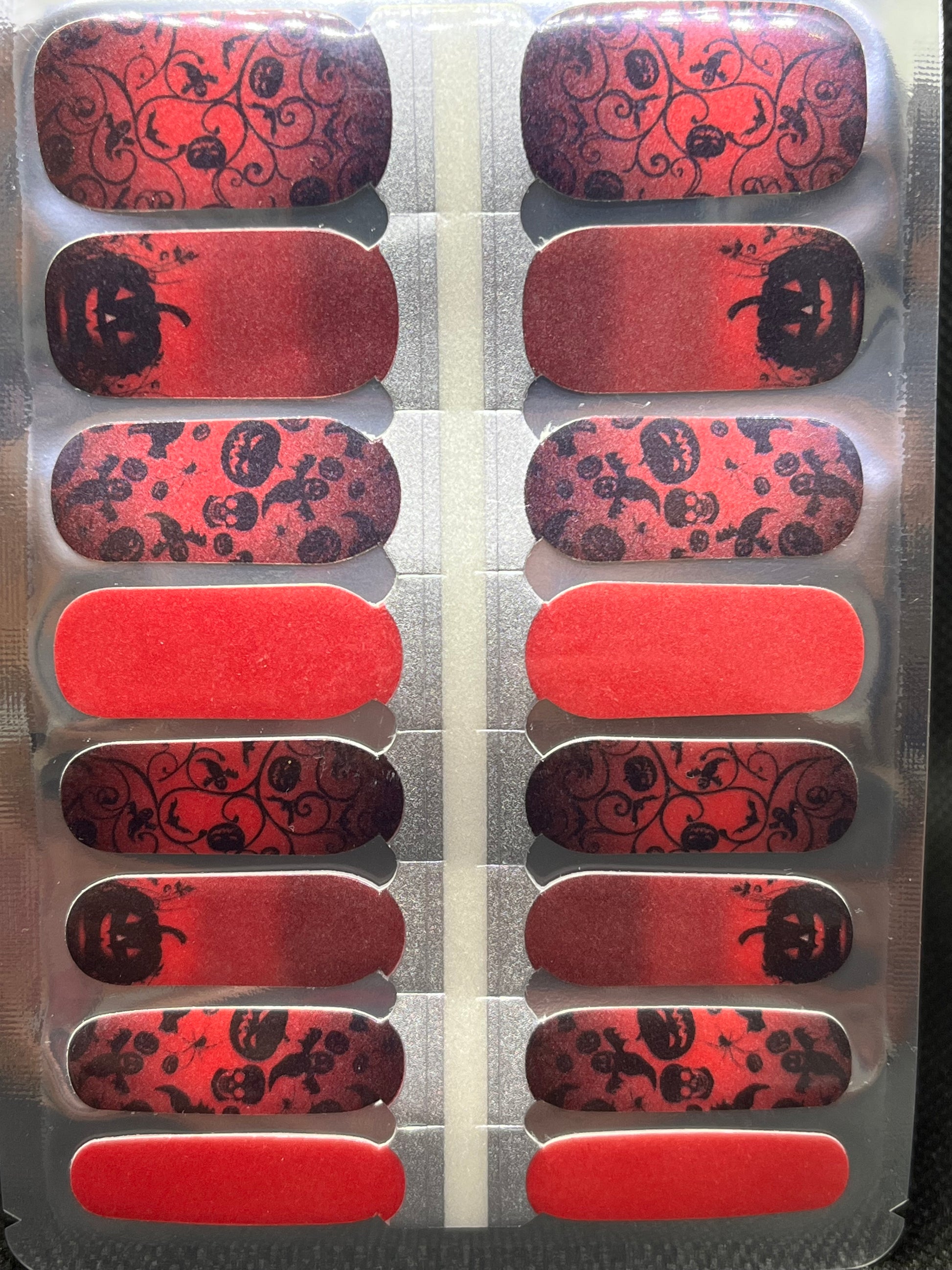 >Bubble, bubble. Toil and trouble. Spook up your nails for Hallowe'en with this dramatic black and red design. Four solid red, and 8 red and black wraps that feature jack-o-lanterns, bats, ghosts and swirling twisting vines.