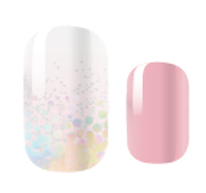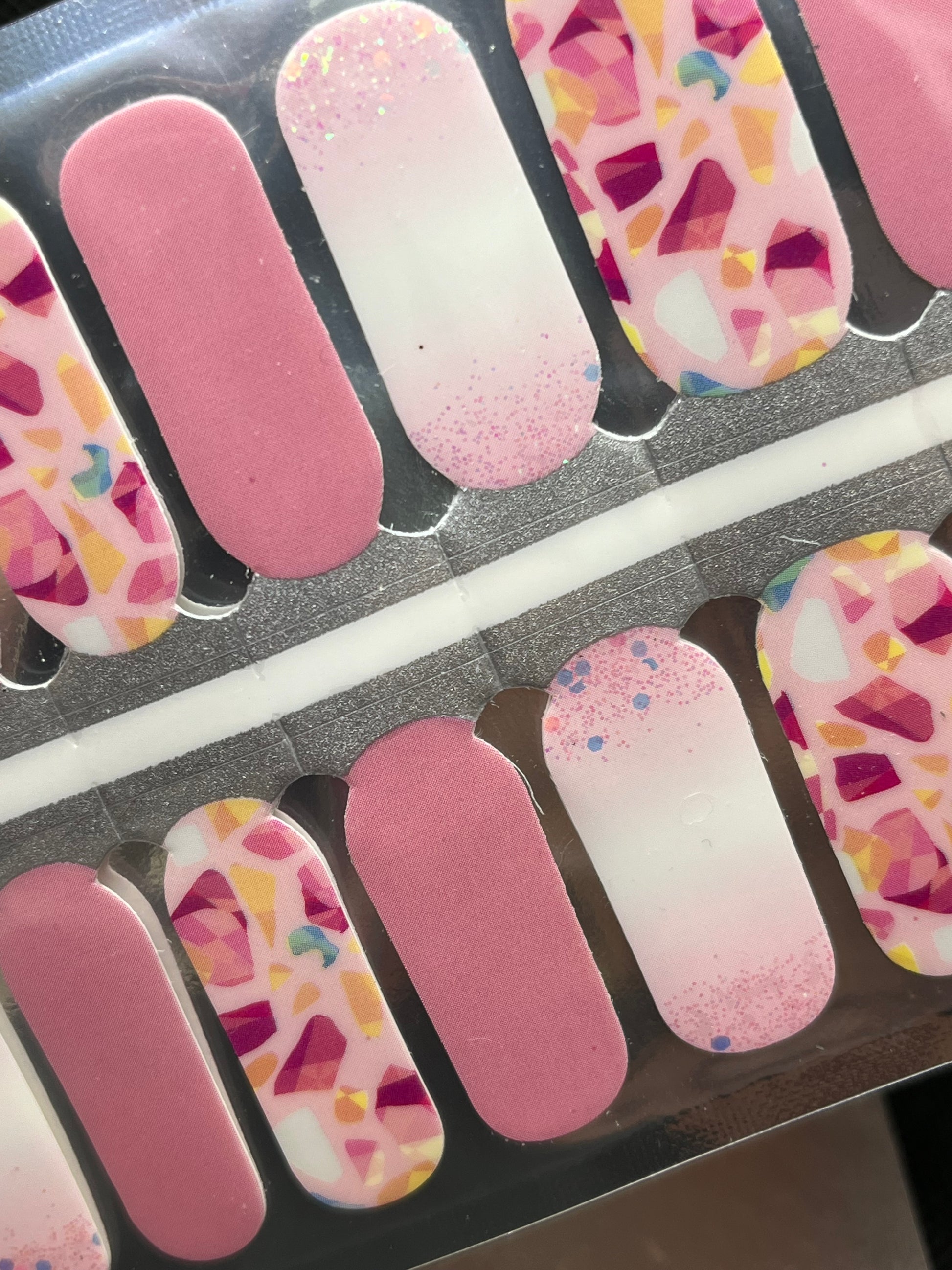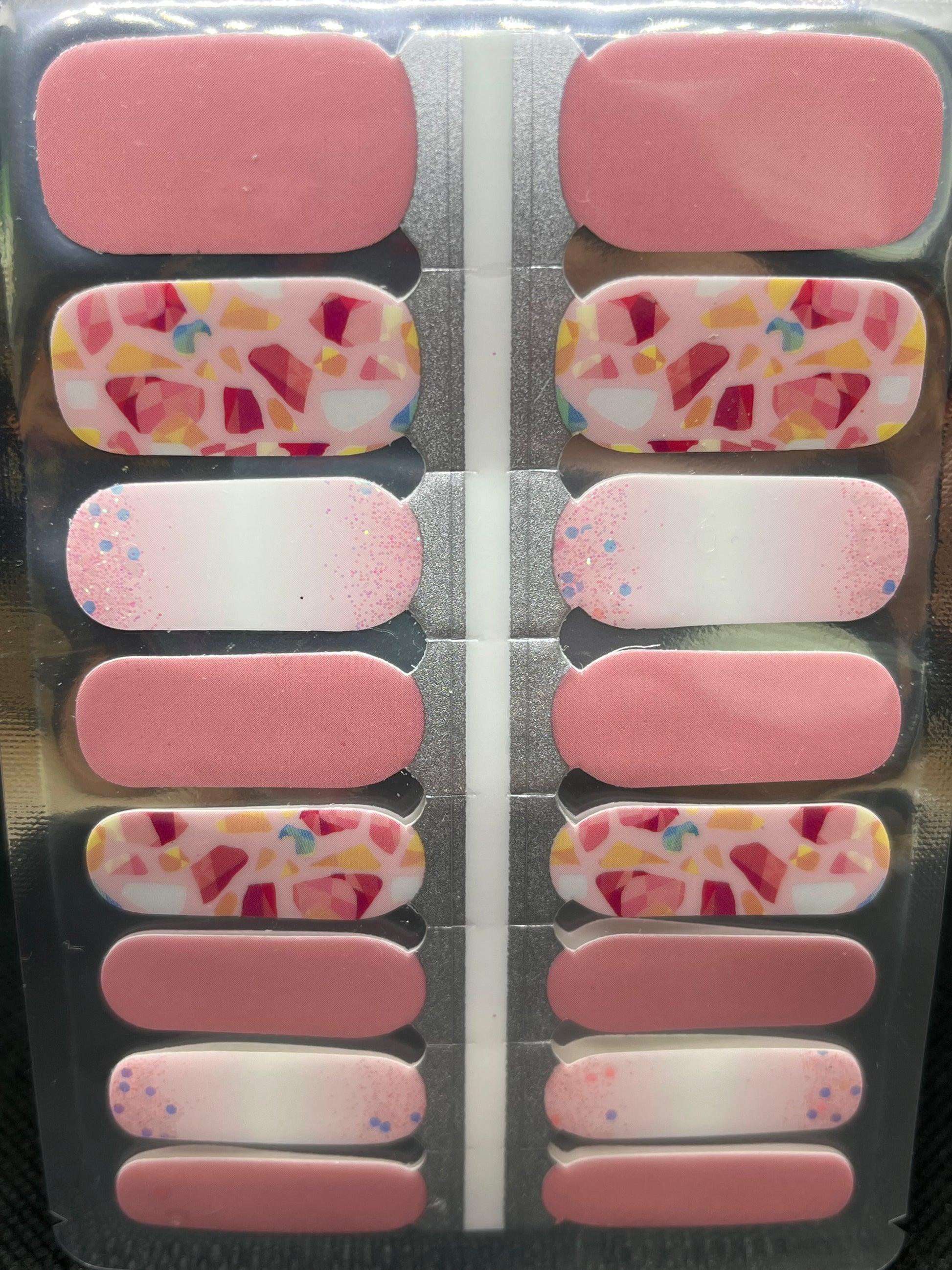 > 8 solid blush pink wraps + 4 pale pink to white ombre wraps with sparkles + 4 pale pink with a print of hot pink, gold, white & blue crystals.