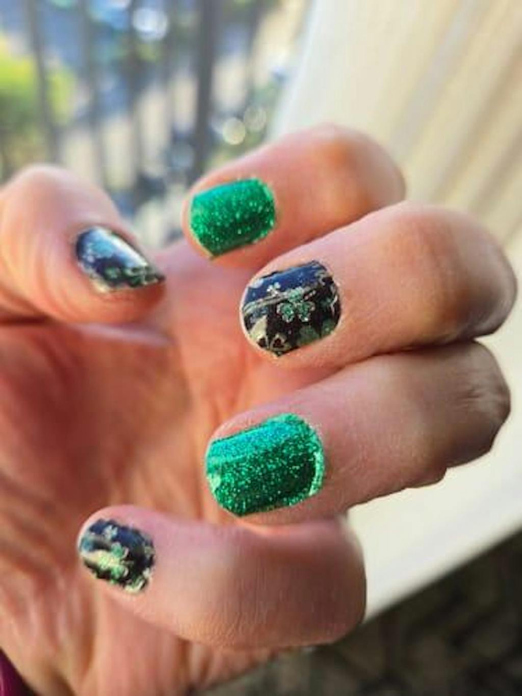 >Dark green background is sprinkled with a glittering mix of multi-coloured green shamrocks. Super fun for St. Patrick's Day!