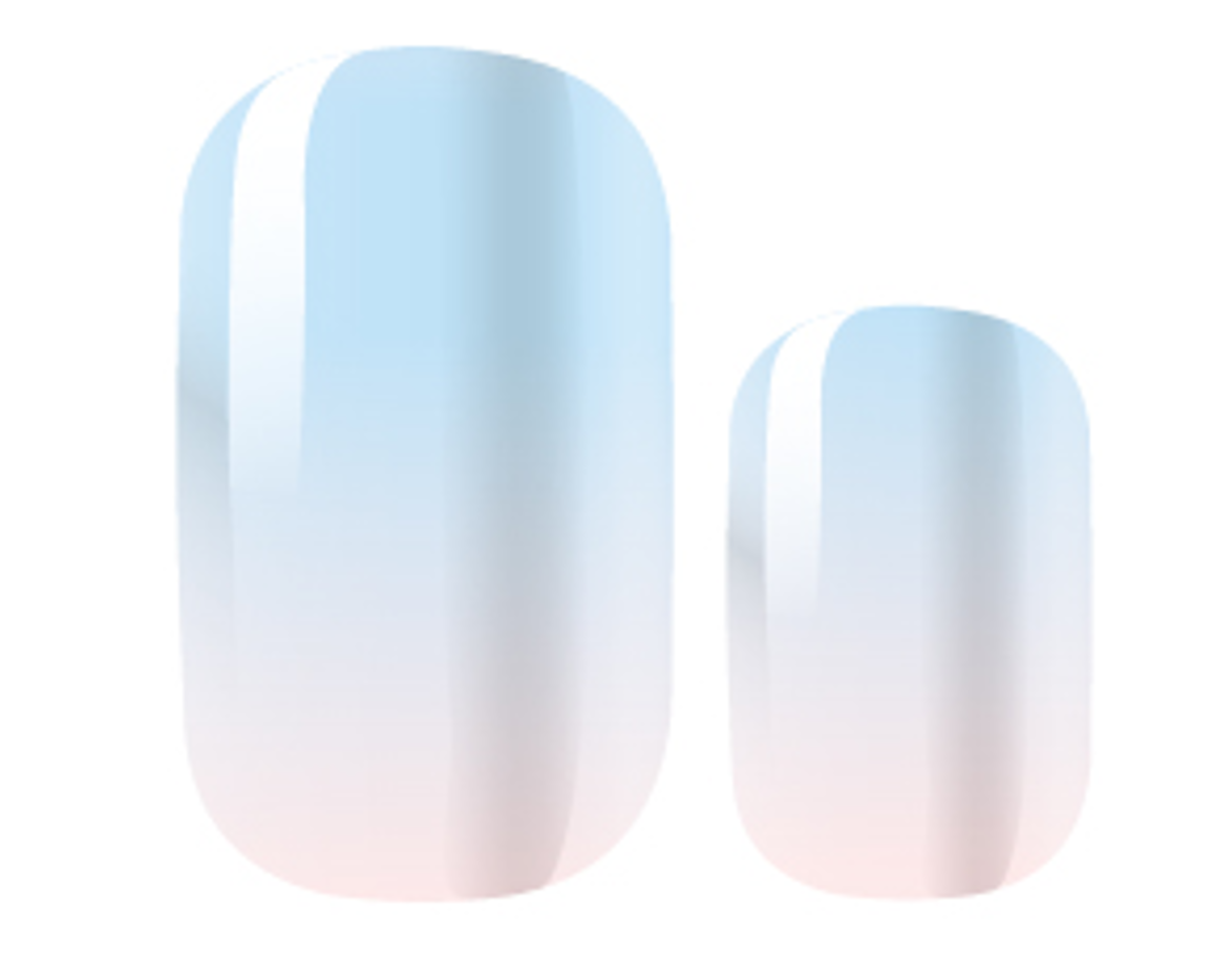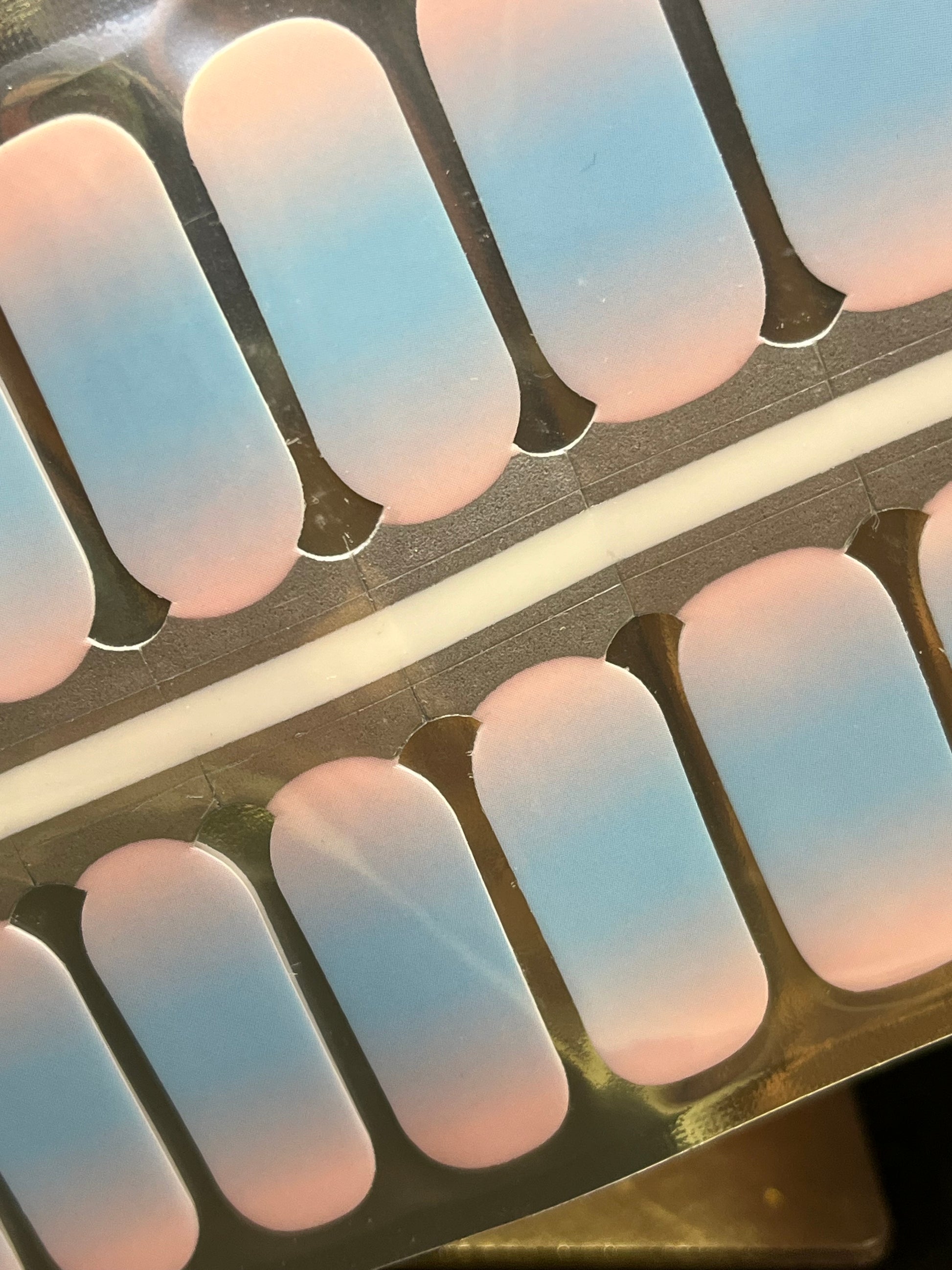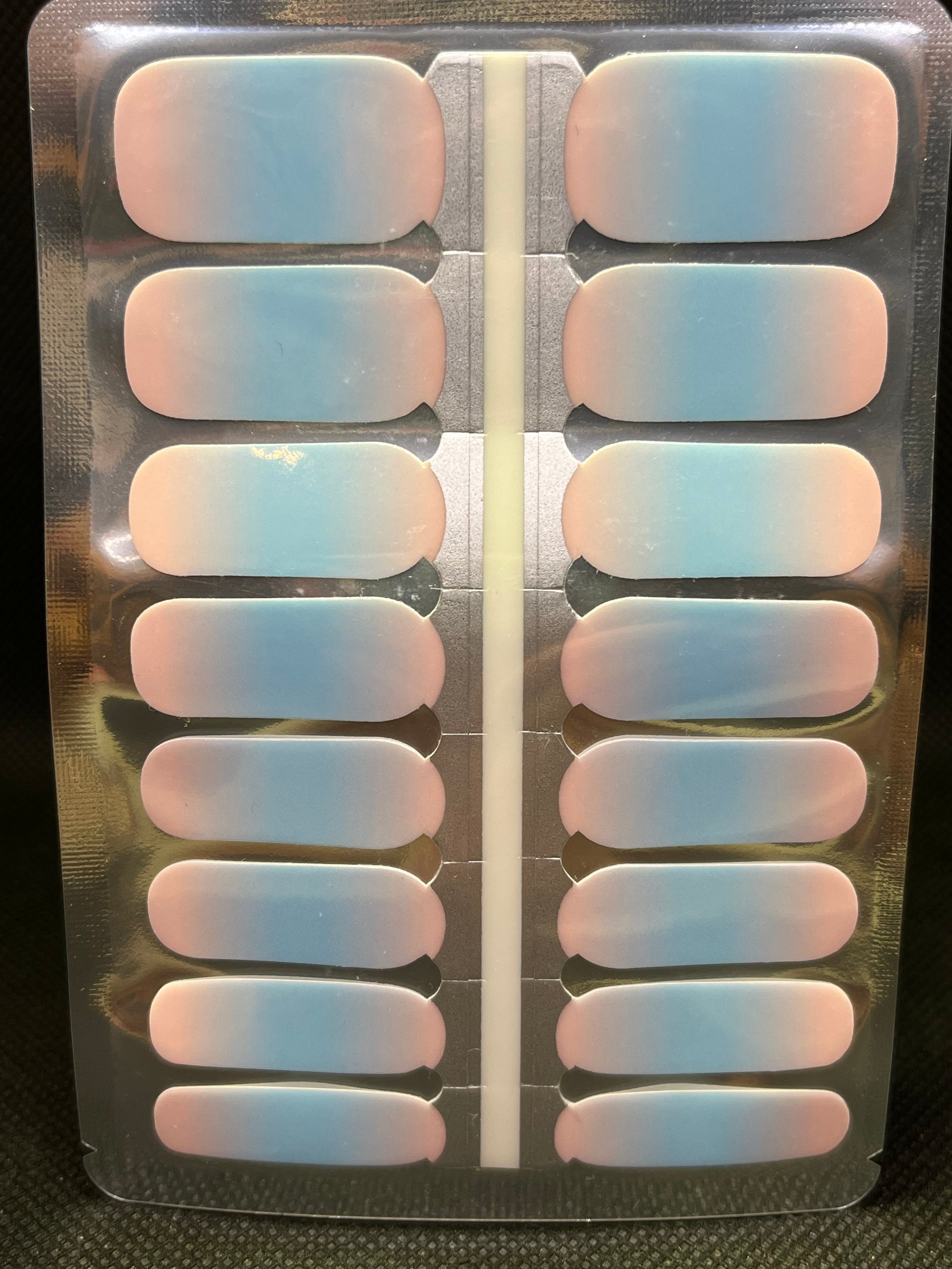>Pale, light cyan wraps with very pale coral-pink at the base and tip. If your nails are short, you can save the unused half for a second manicure. Just store them in an airtight ziploc for later.