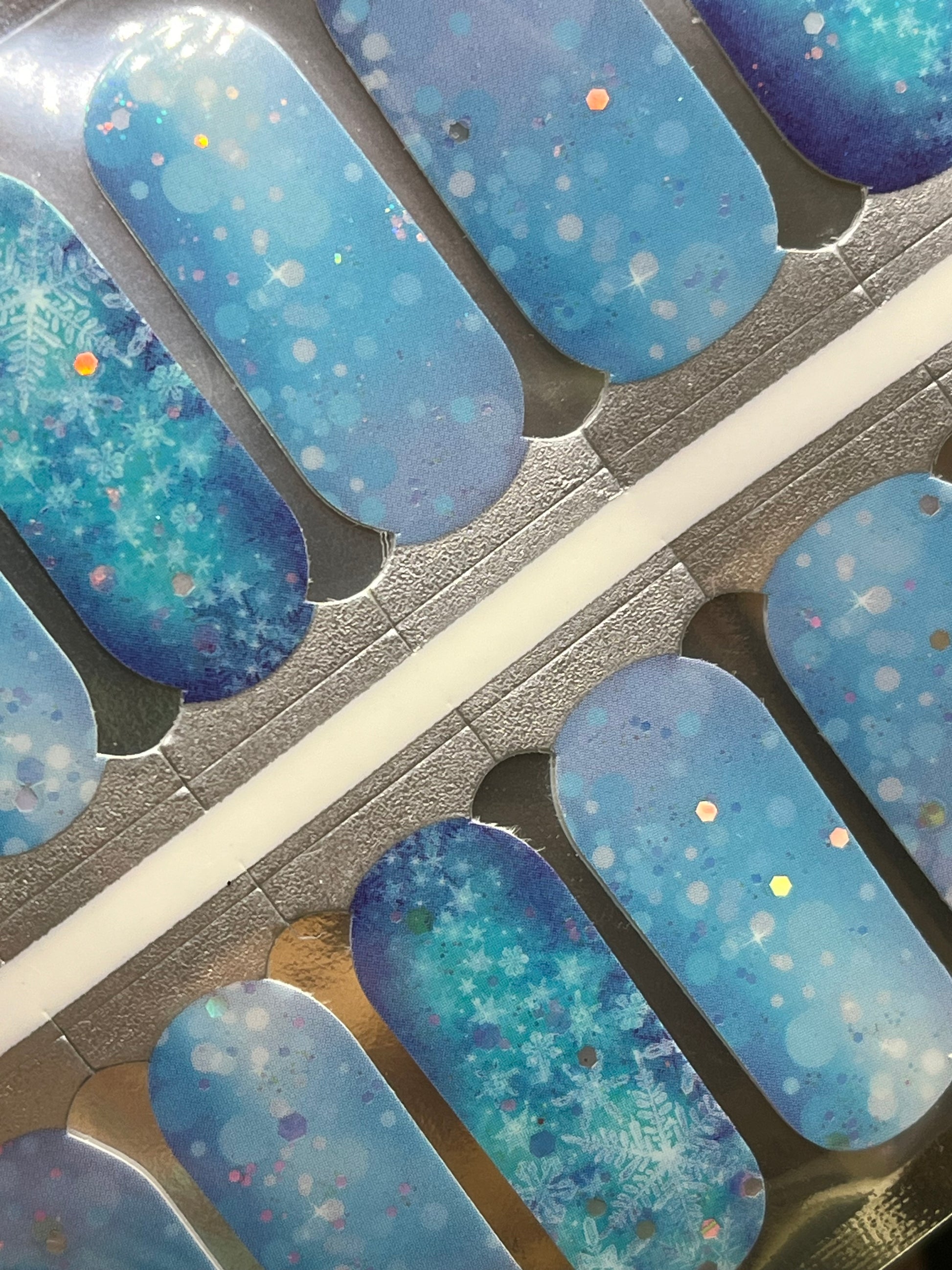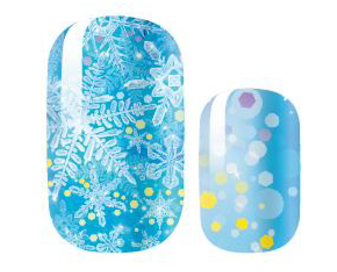 >  Shades of blue plus a scattering of snowflakes and glitter create a perfect wintry manicure.