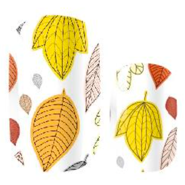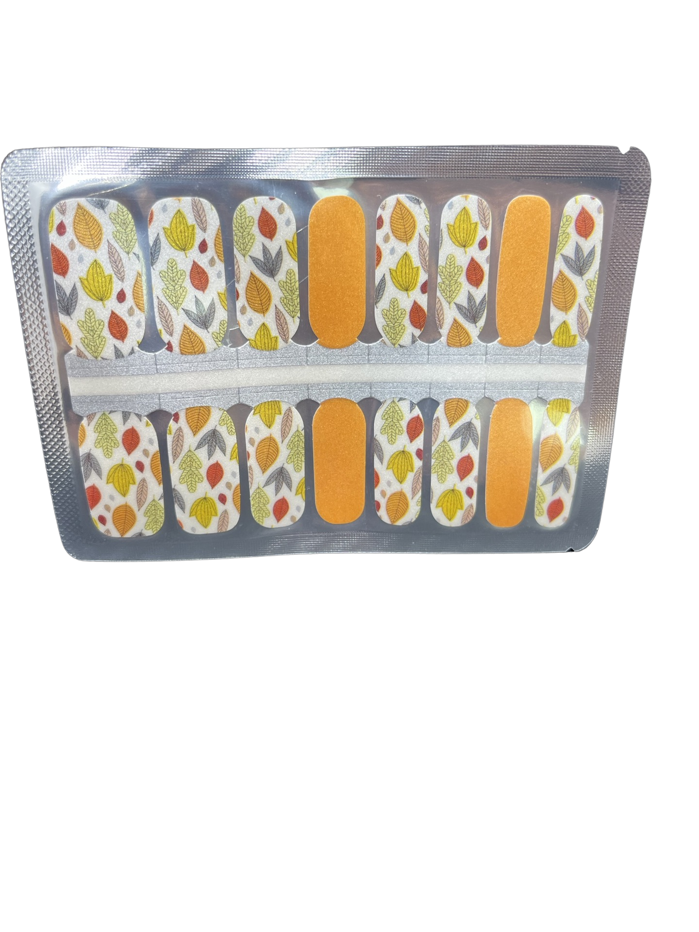 >Off-white with multi-coloured falling leaves plus solid pale orange accent nail