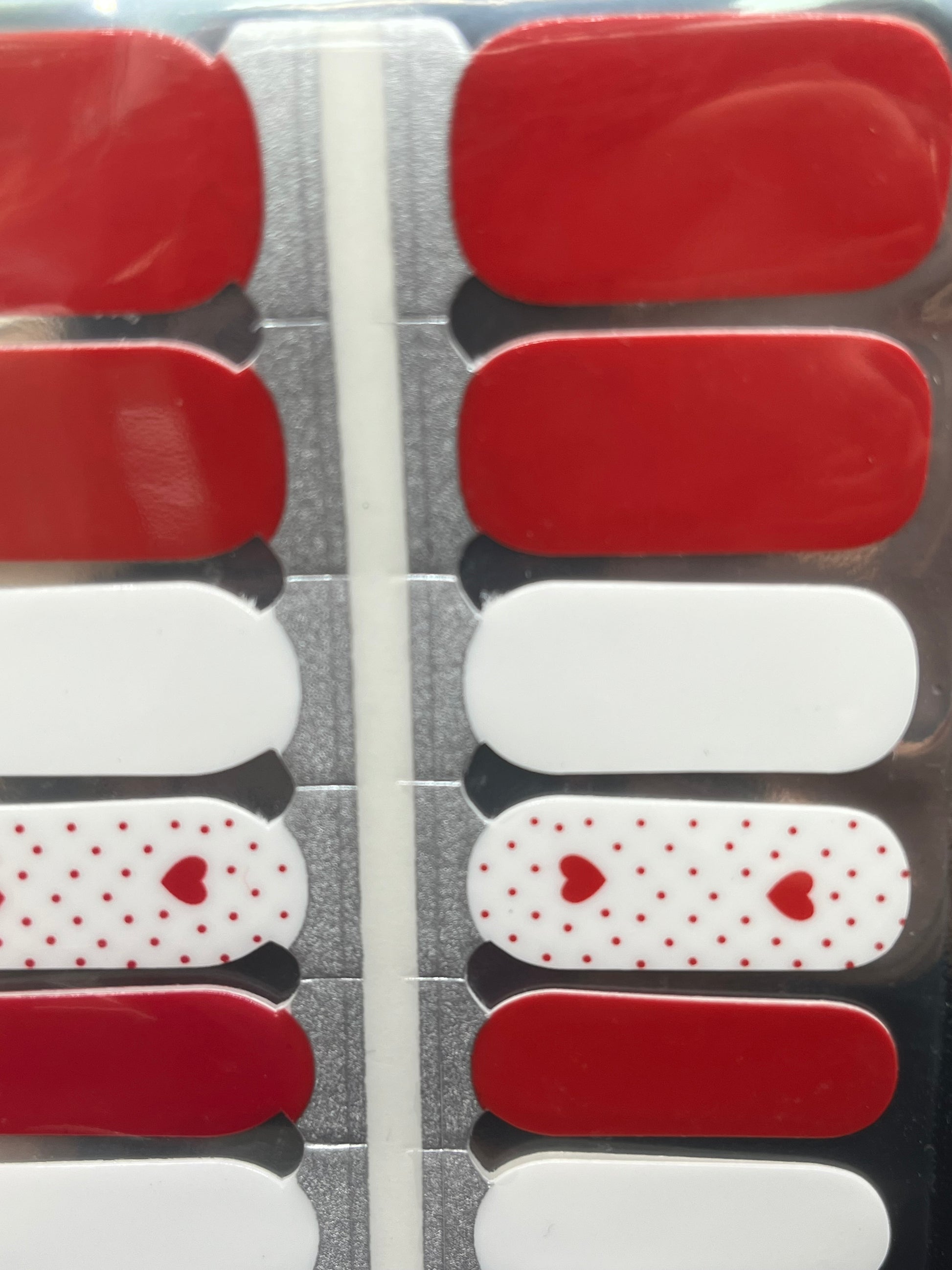 > Mix of 4 solid bright red and 4 solid white wraps + 4 white wraps with red polka dots and 4 little red hearts.